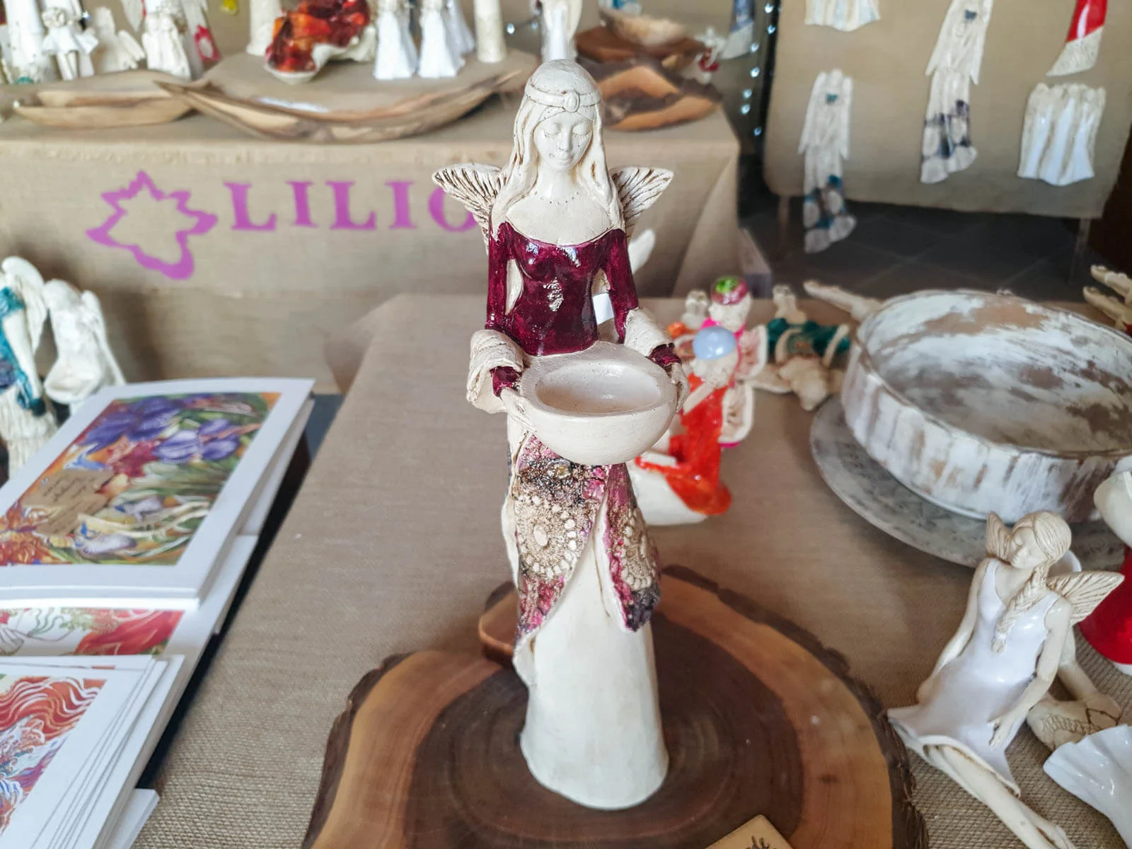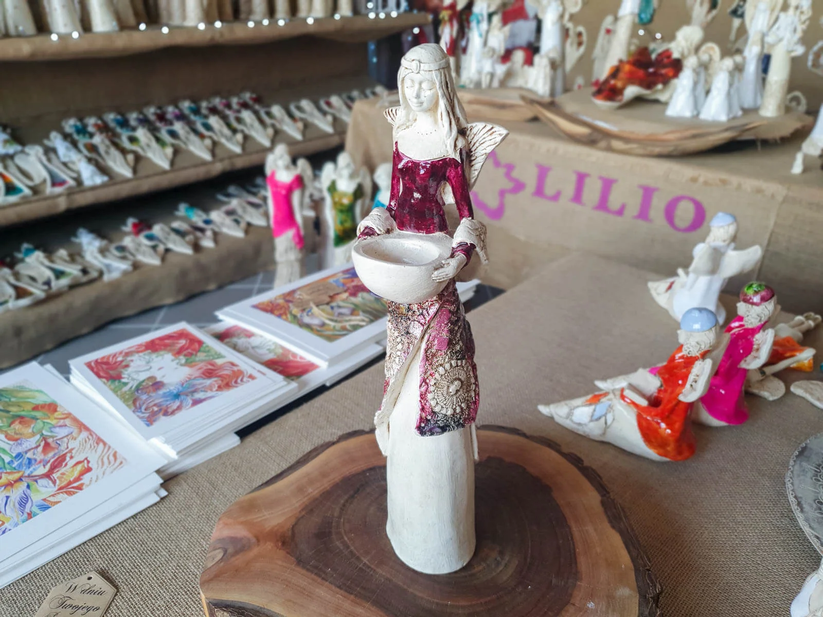 Anioł Florence w burgundowej sukni. Florence jest piękną kobietą, która ma na sobie długą suknię oraz jasne włosy sięgające za ramiona. Suknia posiada na górze dłuższą narzutkę w kolorze turkusowym z beżowymi ozdobami znajdującymi się przy jej końcu. Spod narzutki widnieje beżowa halka. Florence lubi biżuterię, ponieważ ma koralikowy naszyjnik oraz opaskę na głowie z okrągłą ozdobą. Jej skrzydła są małej wielkości uniesione do góry. W rękach trzyma wazę, do której można włożyć małą świeczkę i sprawić romantyczny klimat. Figurka wykonana jest z gipsu ręcznej produkcji. Należy do figurek stojących, dzięki czemu można ją gdziekolwiek postawić. Niezależnie od miejsca na pewno będzie przyciągać każdego uwagę. Anioł Florence idealnie nadaje się na prezent dla kobiety lub babci.