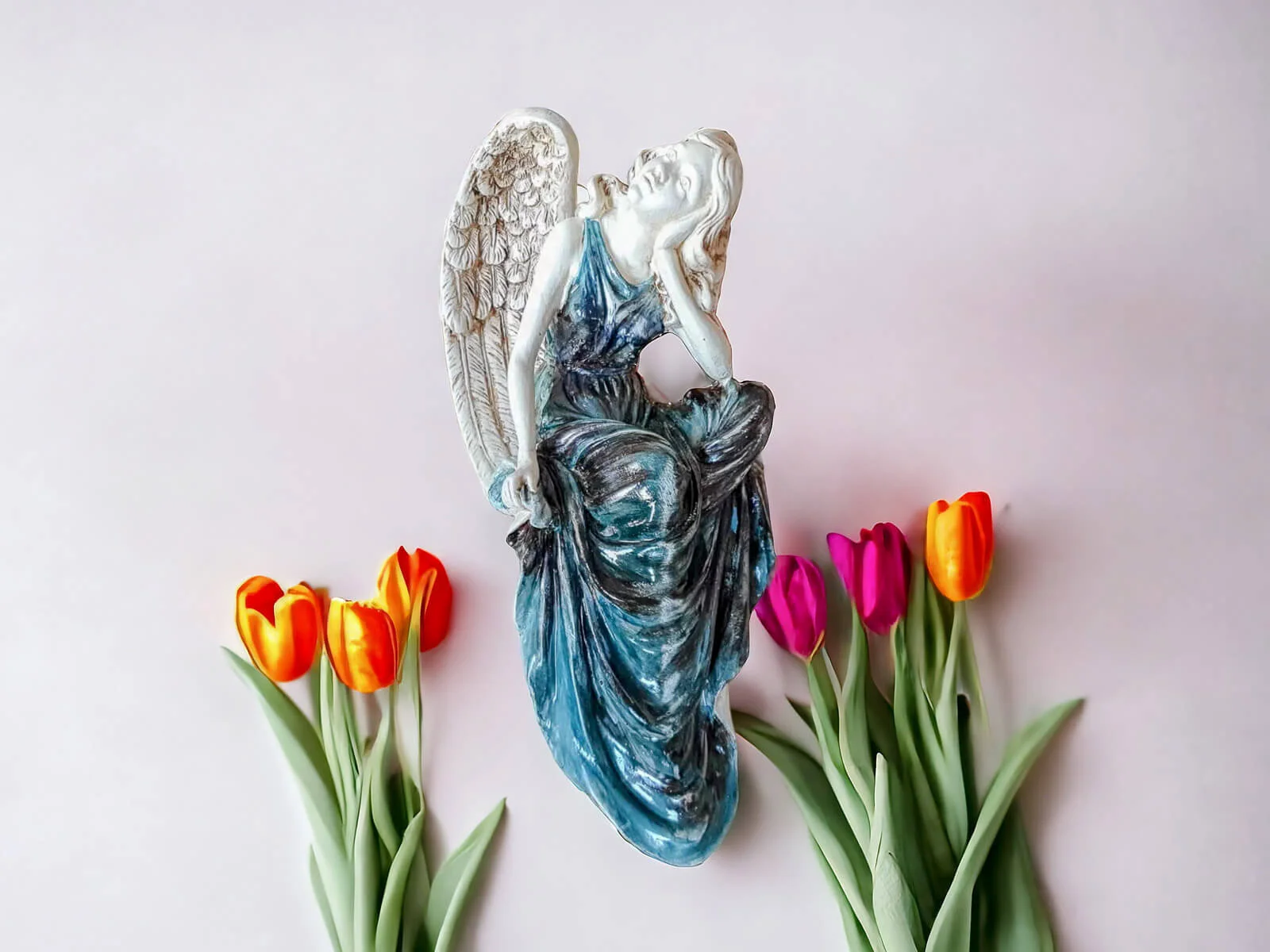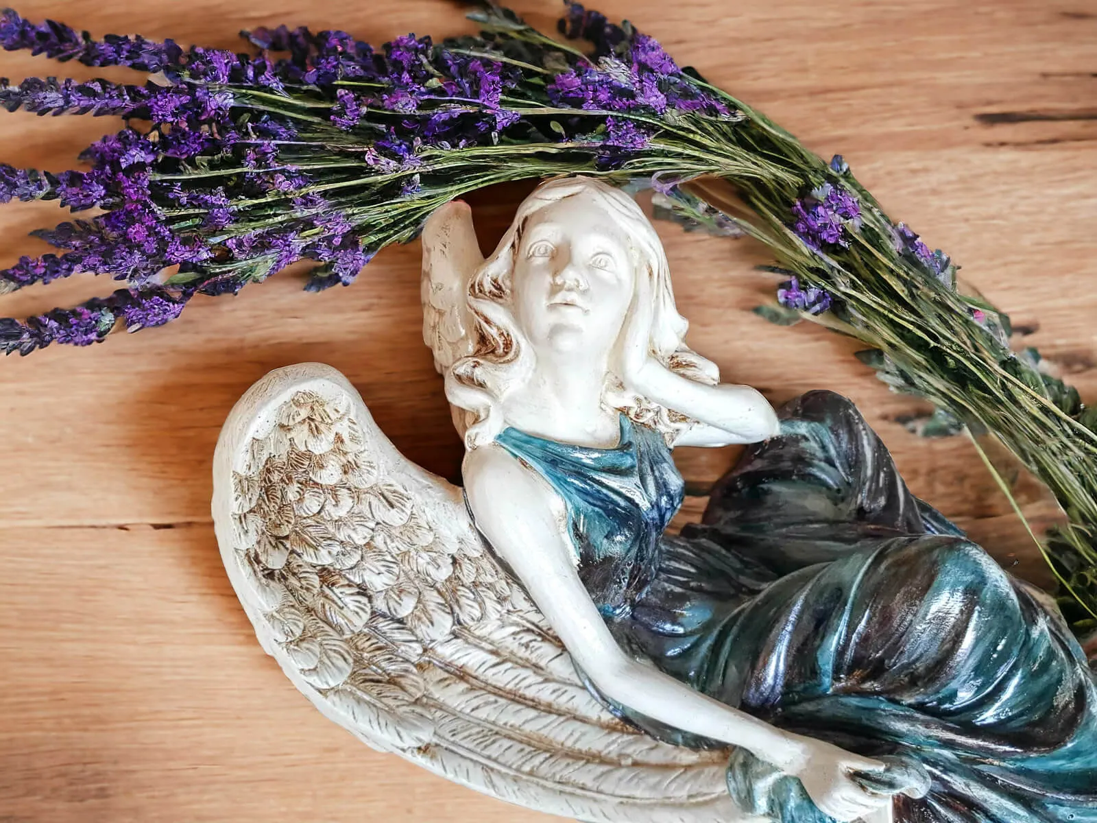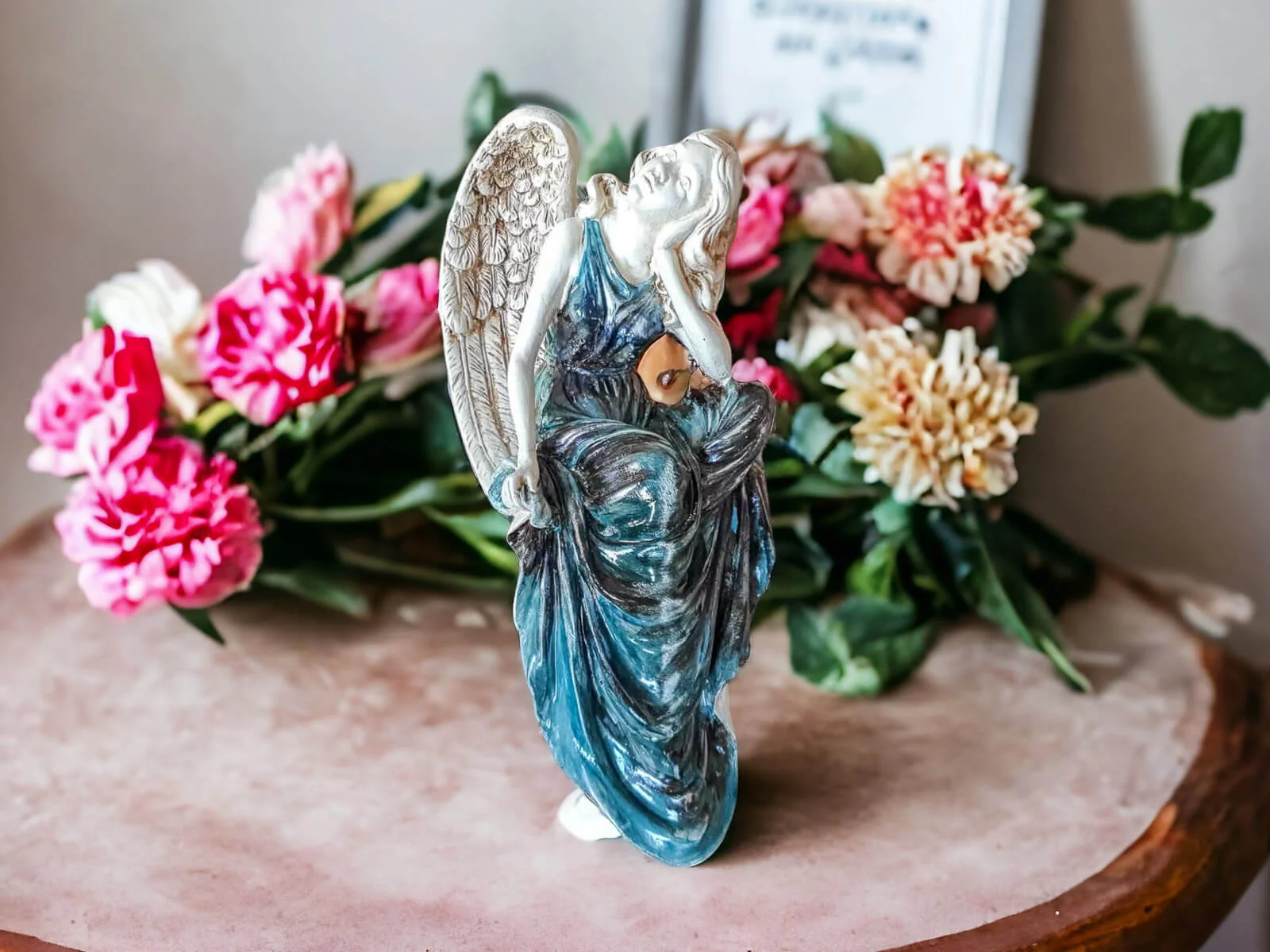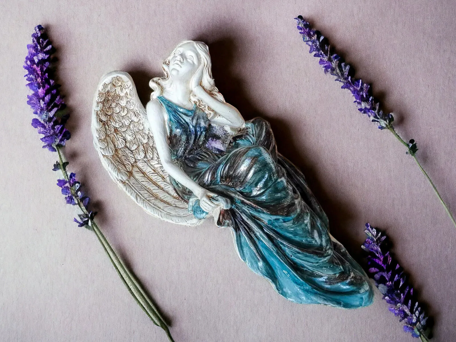 Figurka anioła od Świętej Rity w kolorze turkusowo szarym z przetarciami. Jak mówi legenda za każdym razem gdy Święta Rita modliła się do Boga z nieba schodził Anioł. Święta Rita to protektorka wszystkich zmartwień i trosk. Jest to Anioł romantyczny i delikatny, który pomaga w sprawach trudnych a nawet beznadziejnych. Specjalna wersja kolorystyczna w odcieniach stonowanego turkusu i szarości.