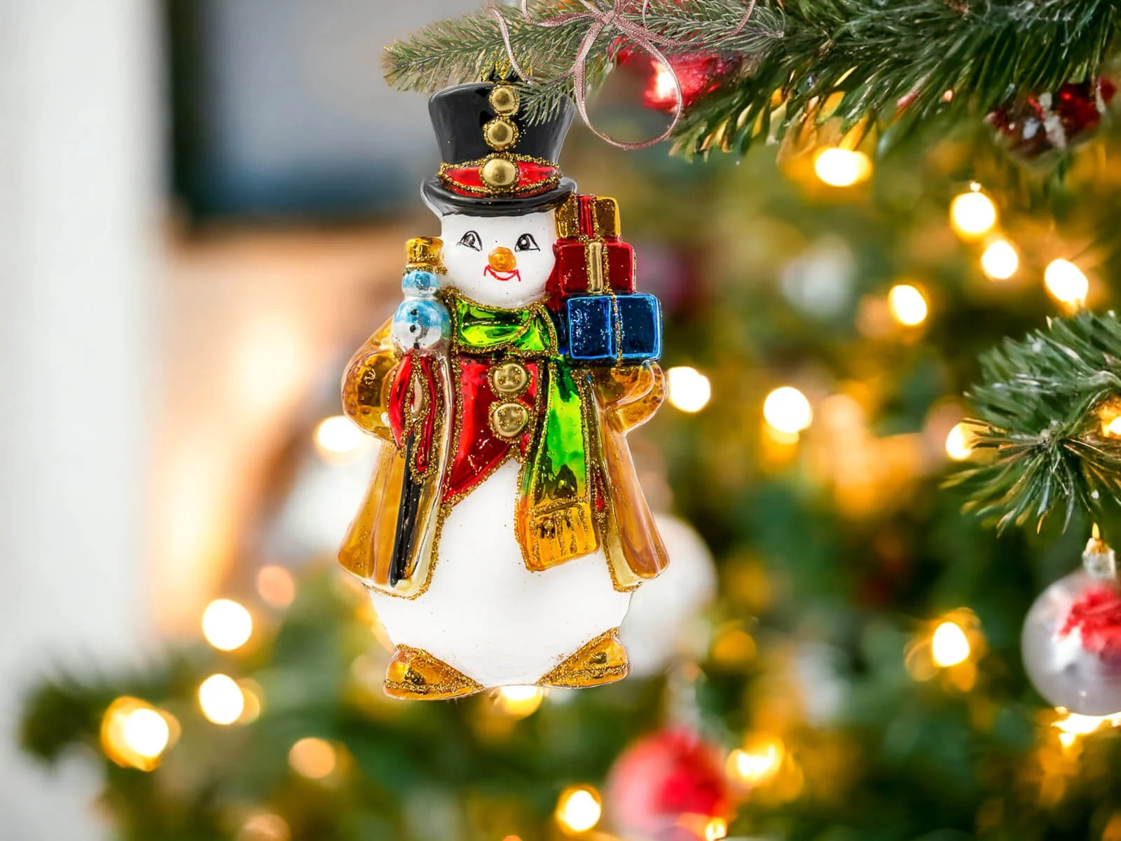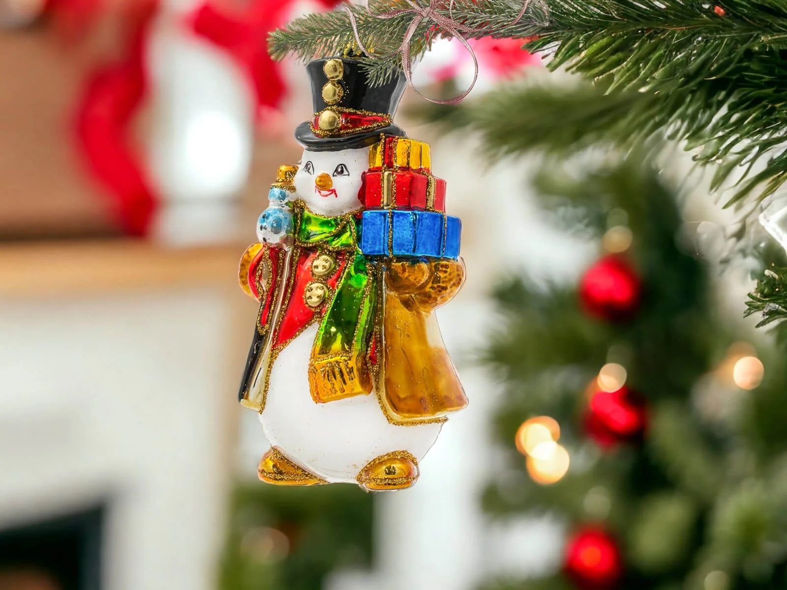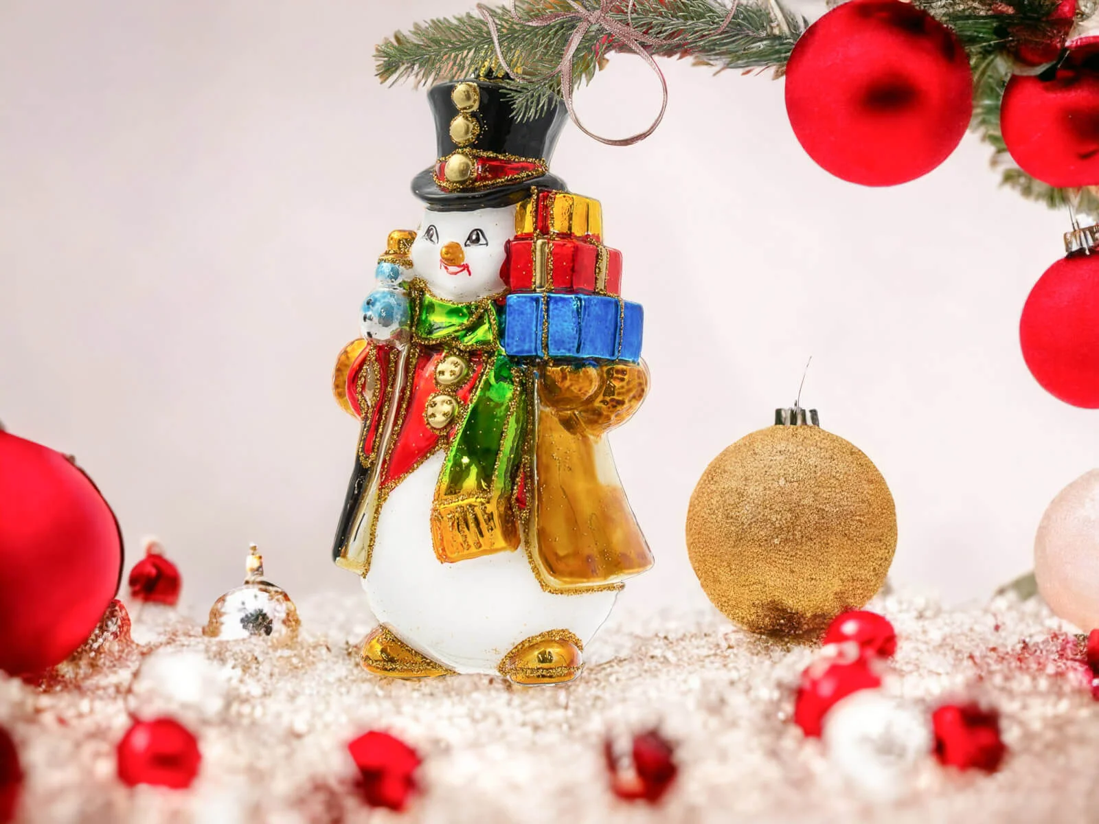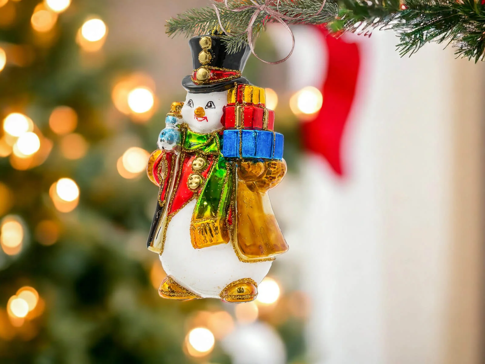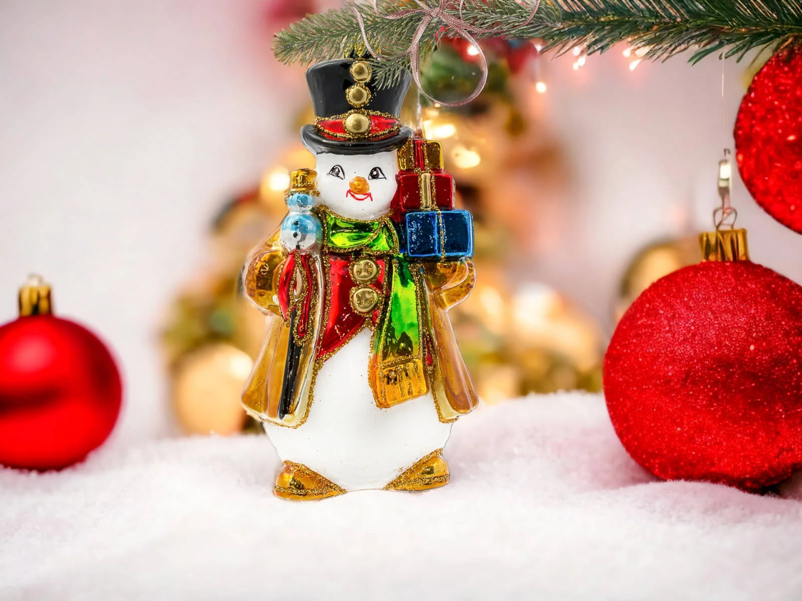 Każdy element tej bombki został misternie dopracowany i ręcznie pomalowany, co nadaje jej niepowtarzalny charakter. Bałwanek ma klasyczny wygląd – duży, czerwony nos, guziki z węgielków oraz rozpromienione oczy, które zdają się błyszczeć w świątecznym świetle. Jego kapelusz zdobiony jest delikatnymi świątecznymi akcentami, a kolorowy szalik opleciony wokół szyi dodaje mu ciepła i przytulności. Prezenty, które niesie, są starannie ozdobione – każdy z nich różni się kolorem i wzorem, od czerwonych kokard, po złote i zielone ornamenty. Detale, takie jak szczypta brokatu na jego kapeluszu lub ślady śniegu na ubraniu, dodają mu wyjątkowego świątecznego blasku i sprawiają, że całość emanuje zimową aurą.