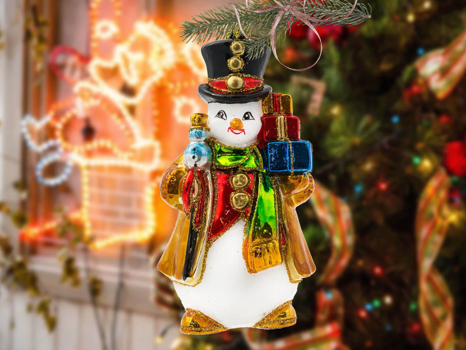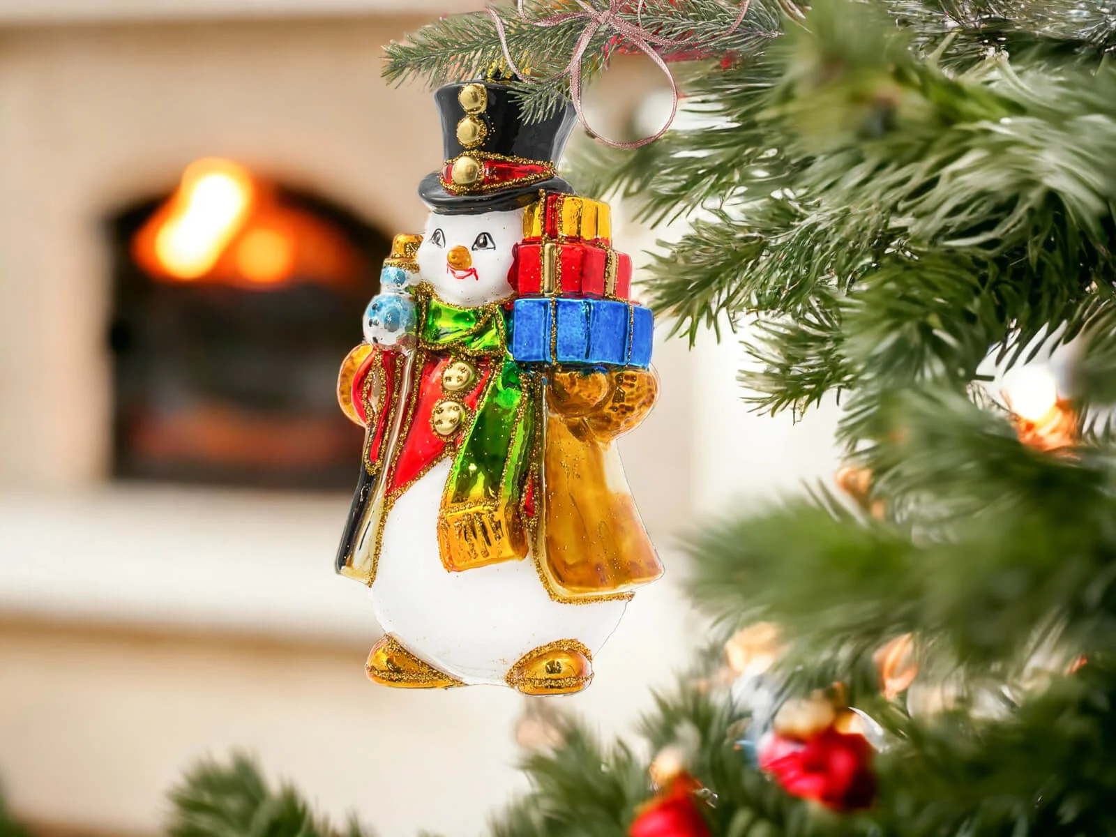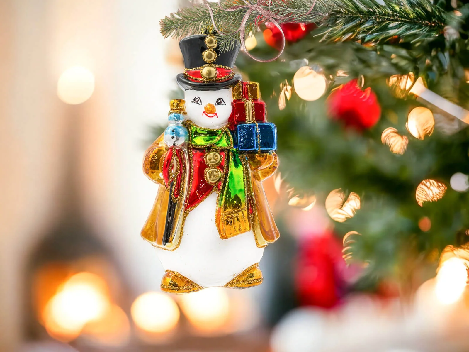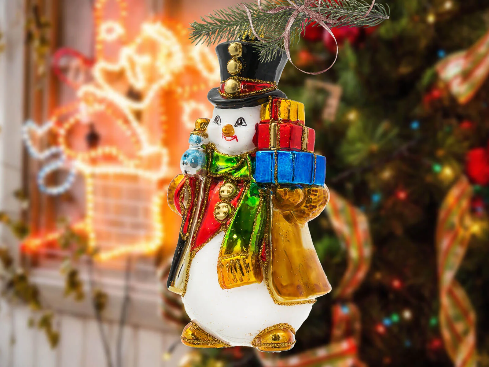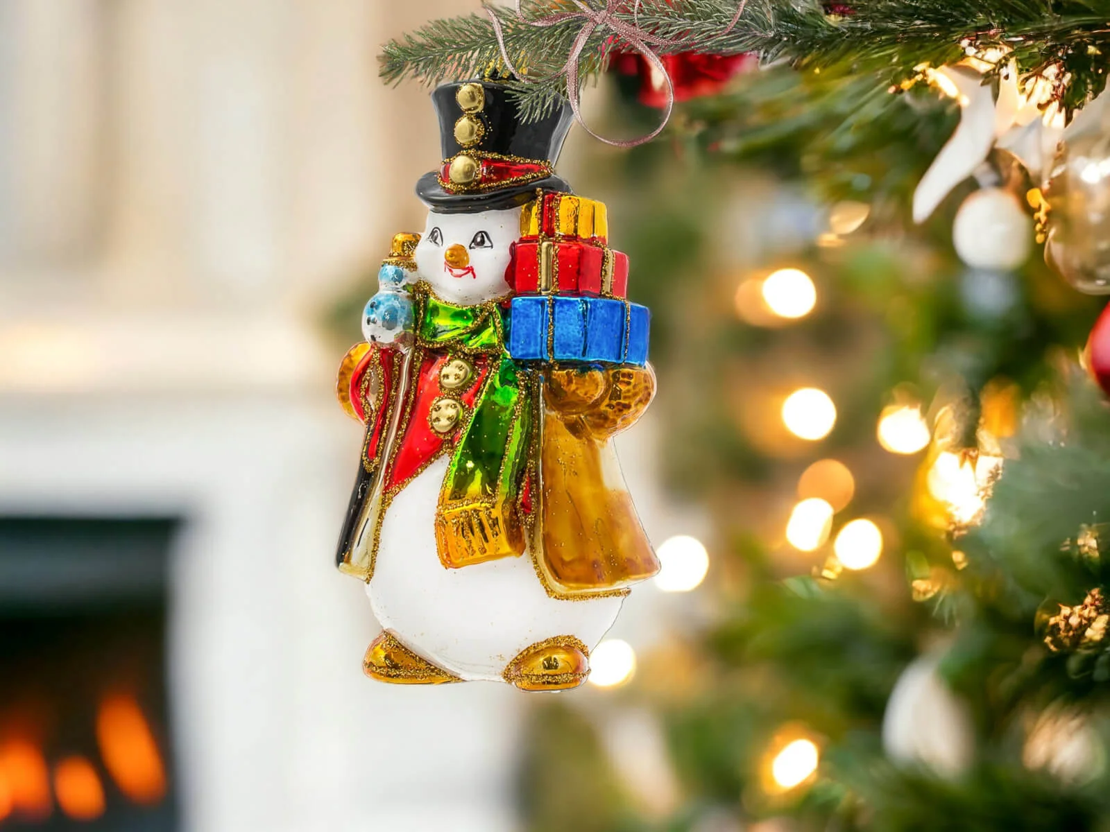 Każdy element tej bombki został misternie dopracowany i ręcznie pomalowany, co nadaje jej niepowtarzalny charakter. Bałwanek ma klasyczny wygląd – duży, czerwony nos, guziki z węgielków oraz rozpromienione oczy, które zdają się błyszczeć w świątecznym świetle. Jego kapelusz zdobiony jest delikatnymi świątecznymi akcentami, a kolorowy szalik opleciony wokół szyi dodaje mu ciepła i przytulności. Prezenty, które niesie, są starannie ozdobione – każdy z nich różni się kolorem i wzorem, od czerwonych kokard, po złote i zielone ornamenty. Detale, takie jak szczypta brokatu na jego kapeluszu lub ślady śniegu na ubraniu, dodają mu wyjątkowego świątecznego blasku i sprawiają, że całość emanuje zimową aurą.