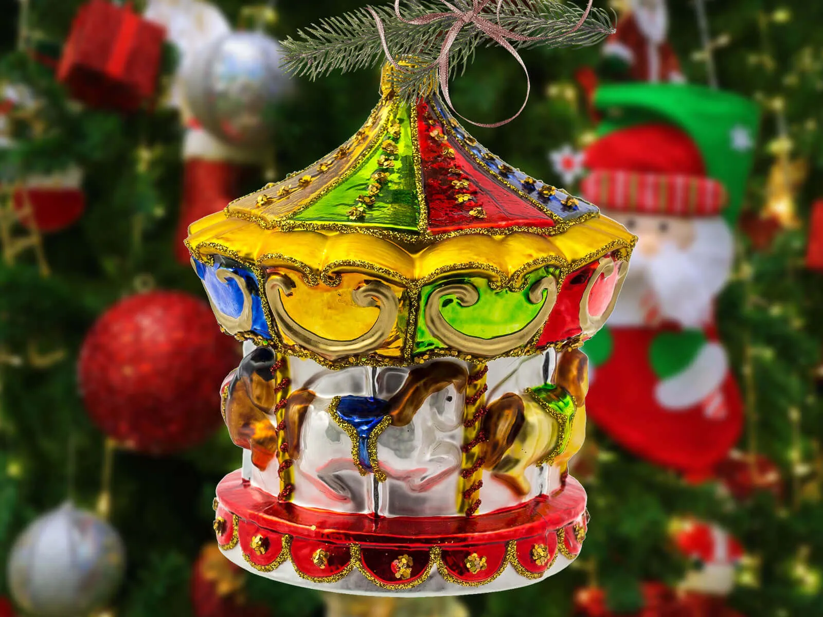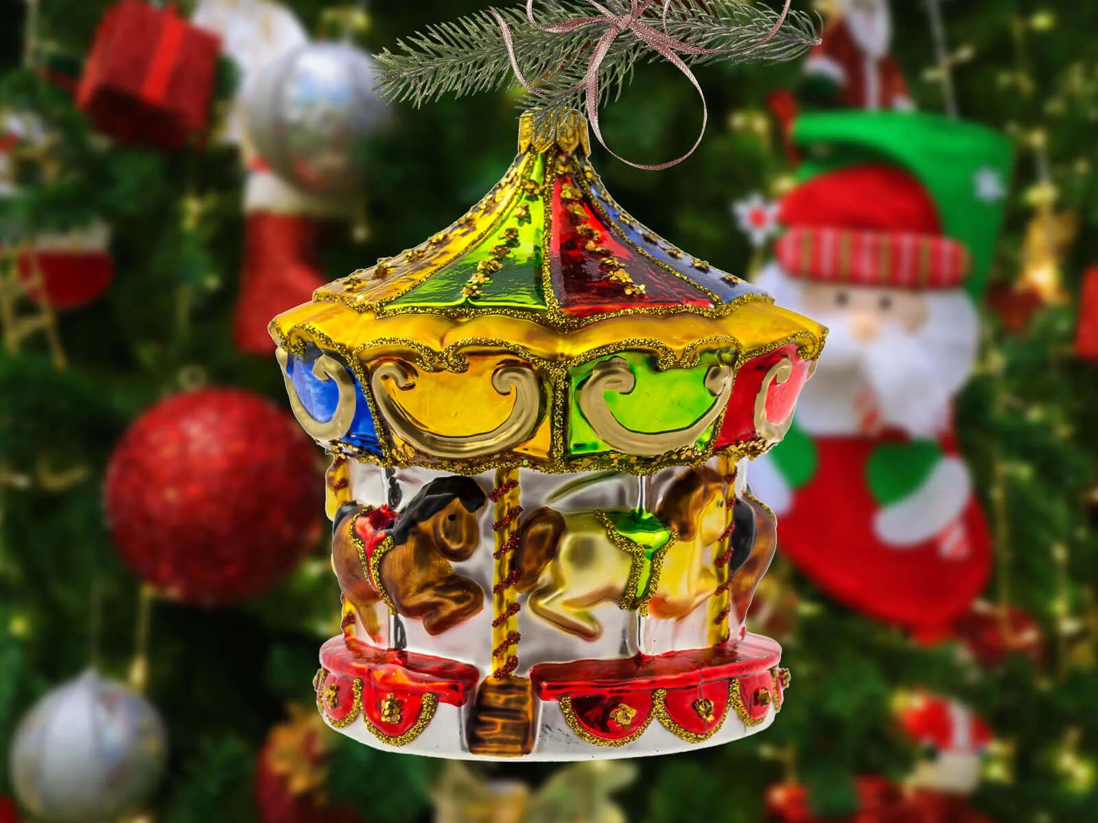 Bombka została wykonana z wyjątkową precyzją: każdy konik jest misternie wyrzeźbiony i pomalowany, co dodaje całości realistycznego wyglądu. Koniki są ozdobione bogatymi, ręcznie malowanymi detalami – od kolorowych uprzęży po drobne, złociste akcenty, które podkreślają ich elegancję i piękno. Ich żywe kolory, jak czerwień, błękit czy złoto, przyciągają uwagę i ożywiają bombkę, nadając jej dynamiki i wrażenia ruchu, jakby karuzela naprawdę się kręciła. Górna część karuzeli zdobiona jest delikatnymi ornamentami i pastelowymi kolorami, z akcentami w stylu retro, które dodają bombce dodatkowego uroku i wprowadzają do świątecznego wnętrza odrobinę klasycznej elegancji.
