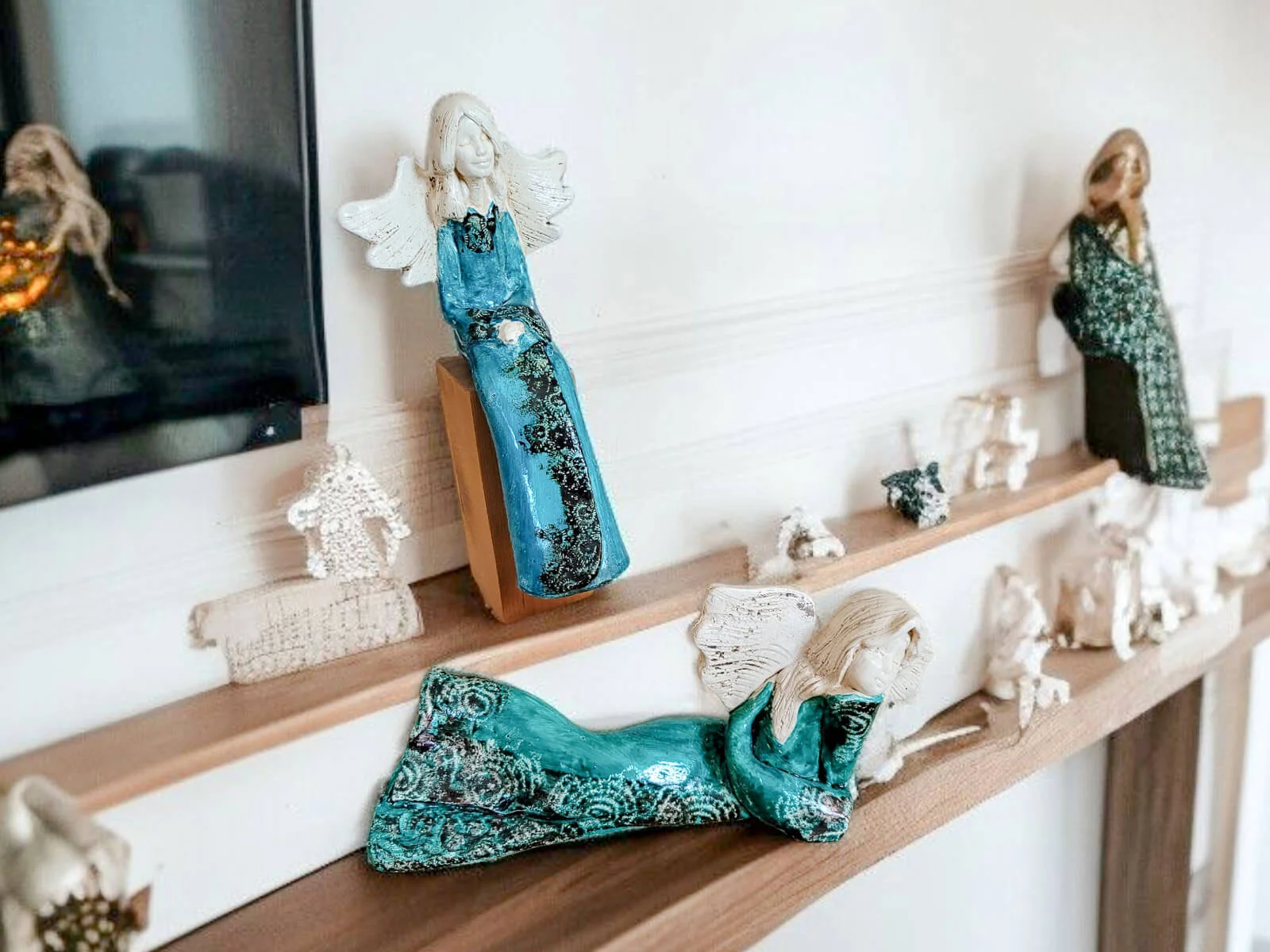 Kontrast jasnych skrzydeł i włosów z głębokim turkusem sukni wprowadza do wnętrza harmonię i subtelność. To nie tylko dekoracja – to źródło codziennej radości i wyciszenia.