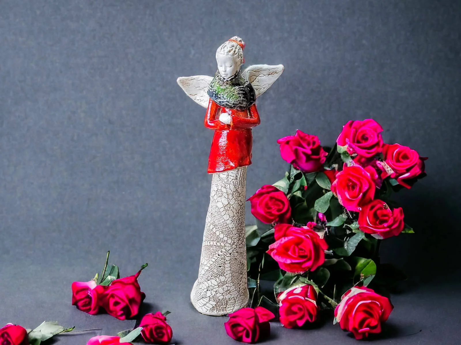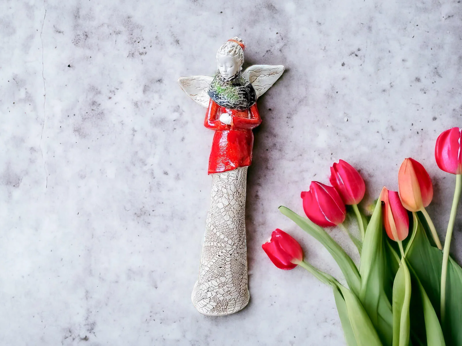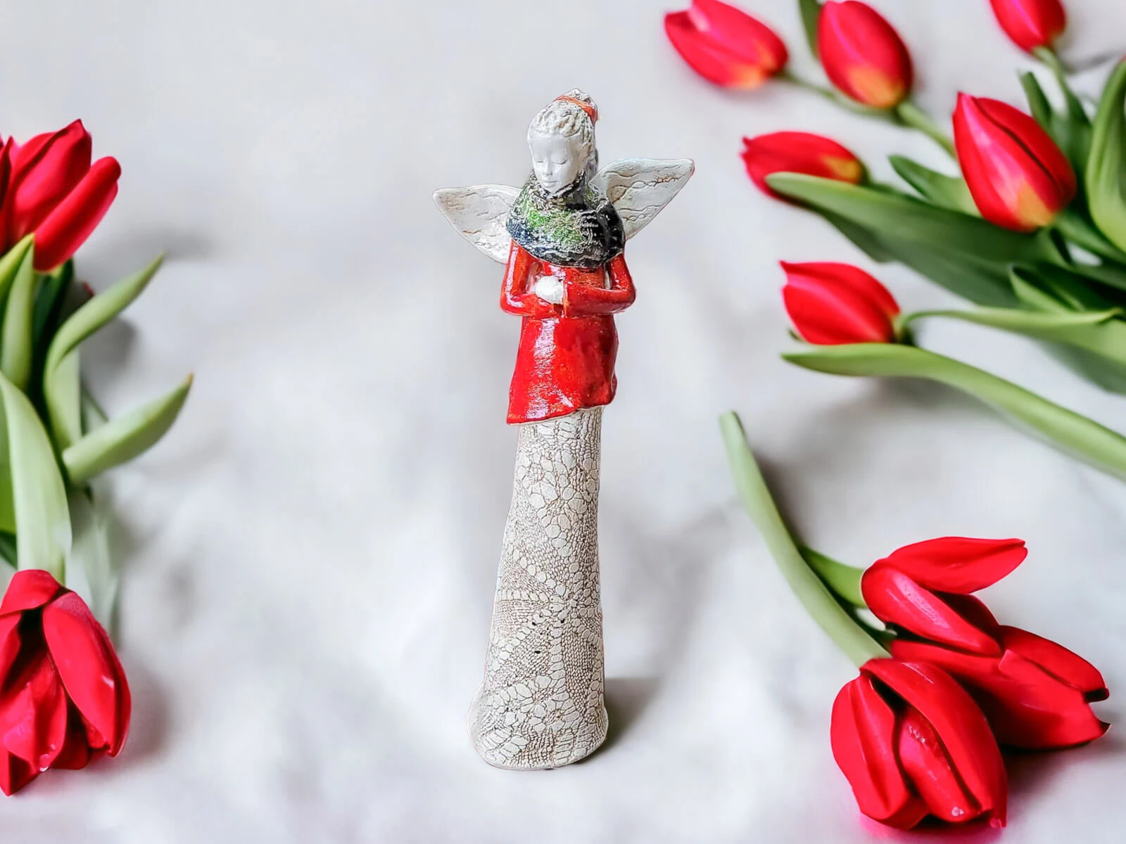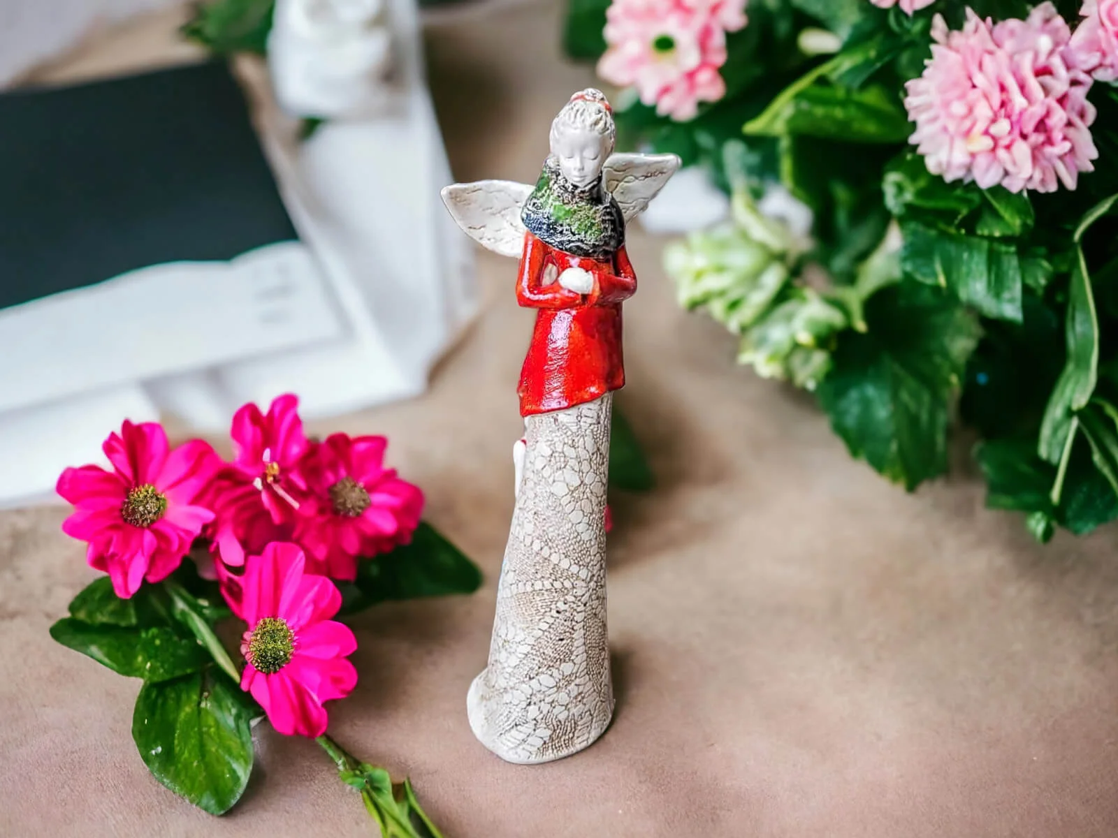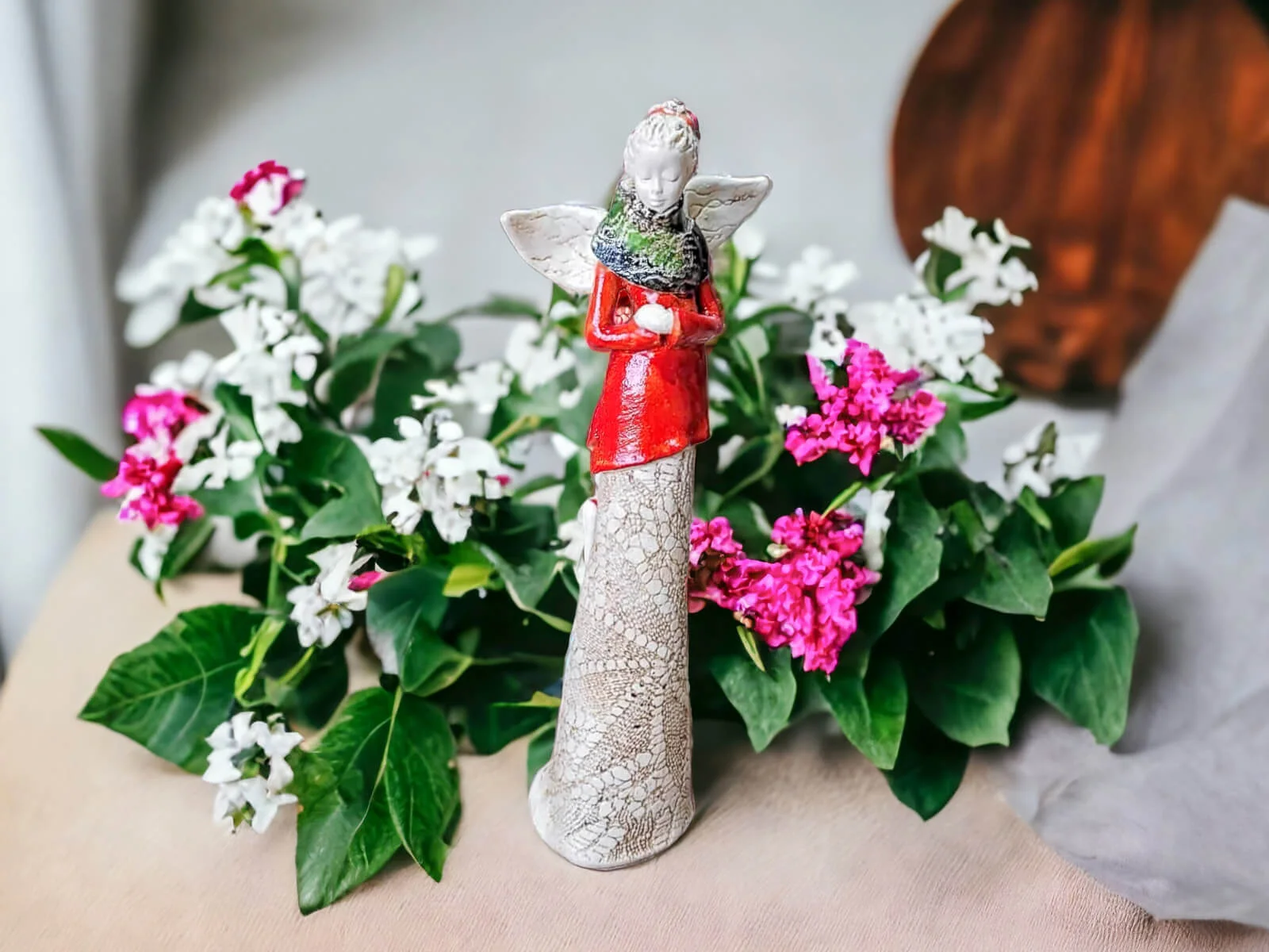 Anioł Catherine w kolorze pomarańczowym to kobieta pełna wdzięku i klasy. Spod czerwonego płaszcza, wyłania się długa suknia, uwydatniająca jej smukłą sylwetkę. Co więcej, urok Catherine kryje się w jej nieśmiałości - spuszczony wzrok świadczy o zawstydzeniu spojrzeniami, które ściąga na siebie anielskim blaskiem. Figura pięknie zaprezentuje się w salonie i z pewnością wywoła uśmiechy na twarzach Twoich gości.
