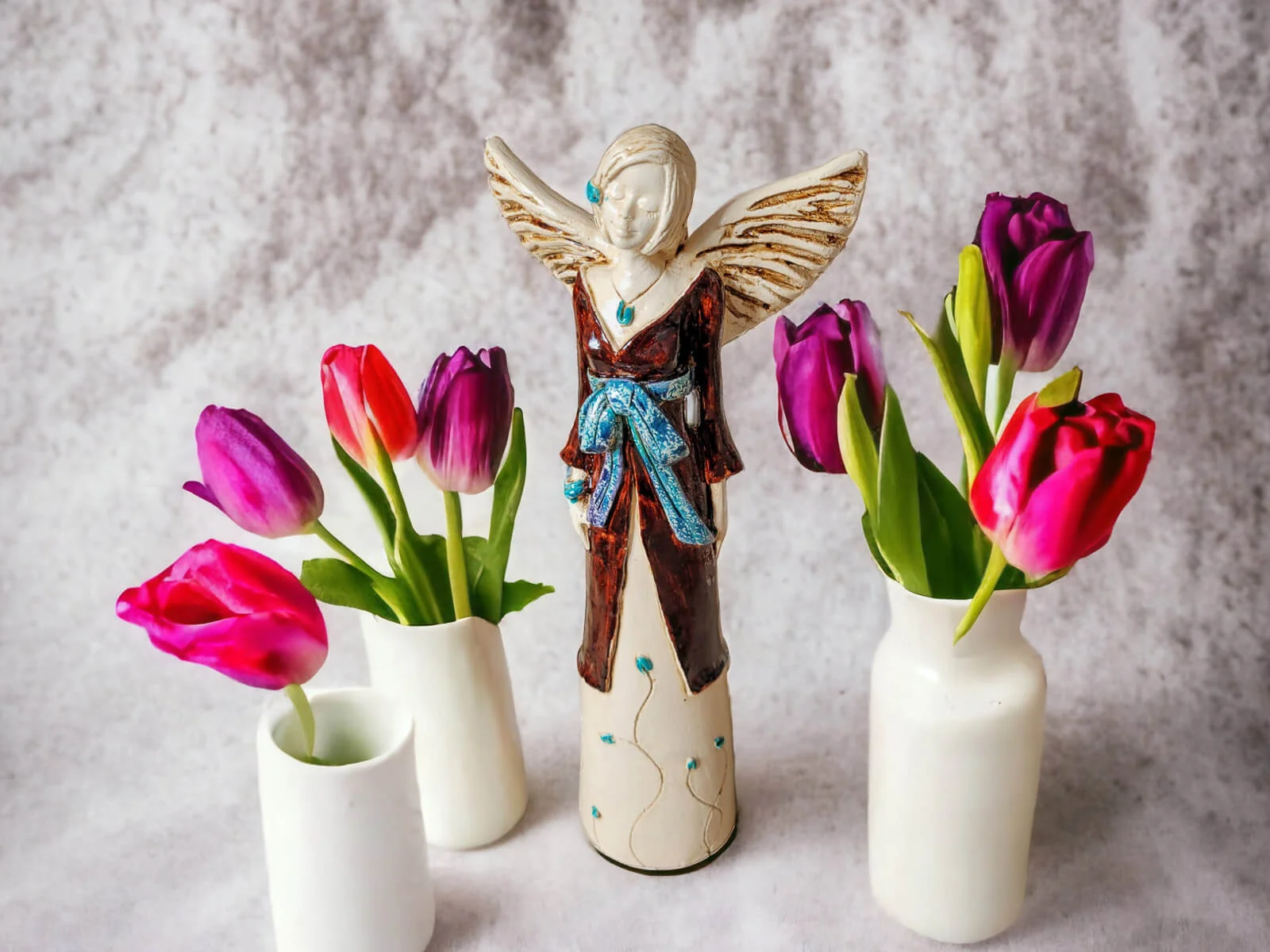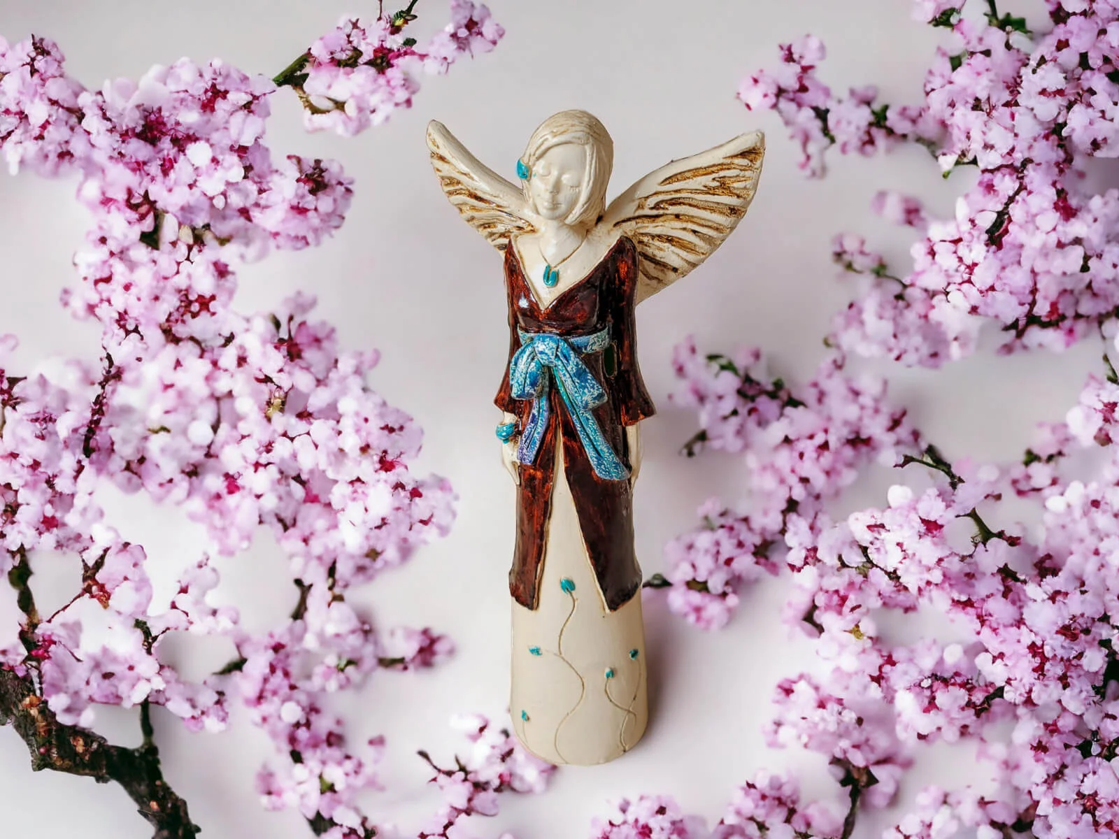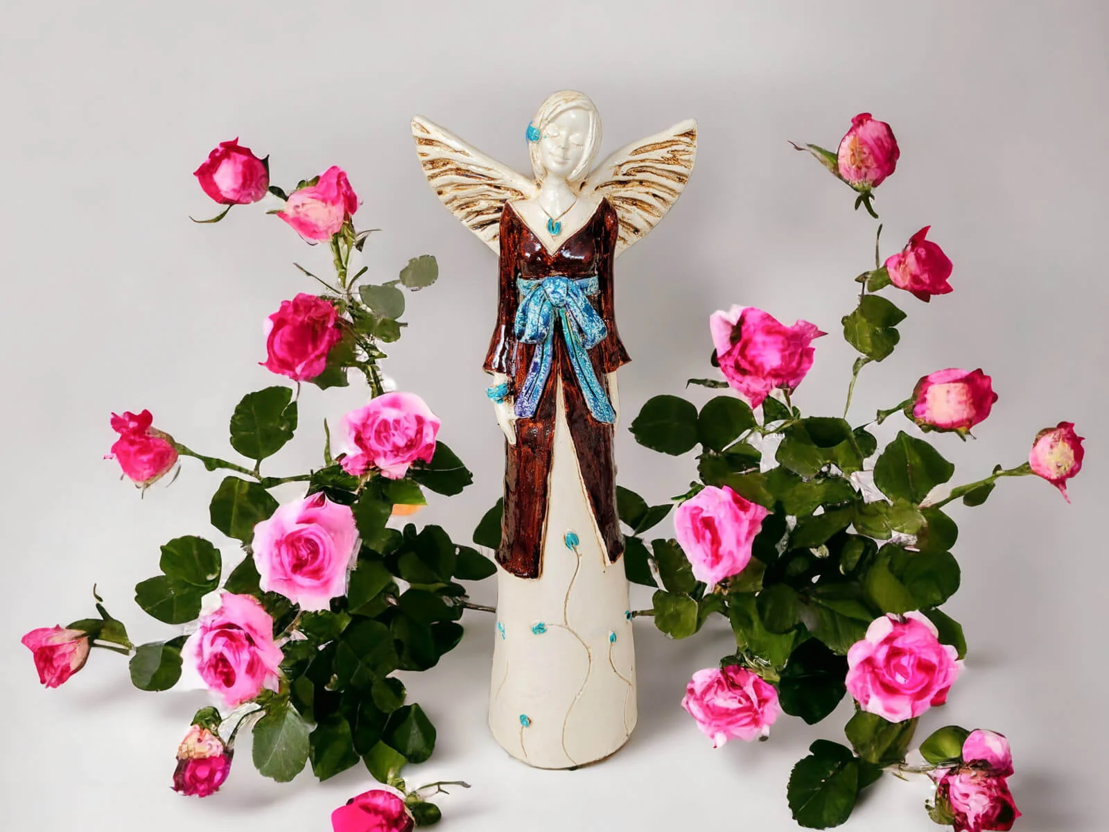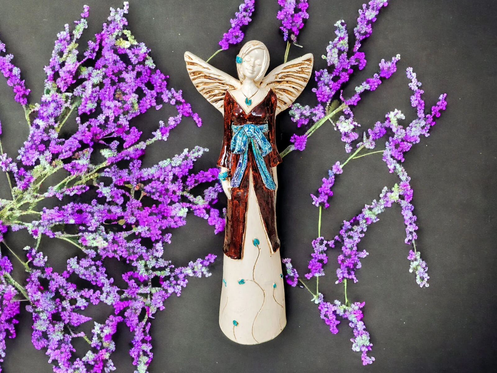 Anioł Lily w ciemno brązowej sukni z kolorową wstęgą jest postacią o uspokajającym i kojącym wyrazie twarzy. Jej puszyste skrzydła dopełniają jej idylliczny charakter. Ma na sobie długą biało-beżową suknię, po której pną się kwiaty. Figurka sprawdzi się bowiem jako prezent z wielu okazji, a przy tym będzie pięknym akcentem w każdym mieszkaniu.