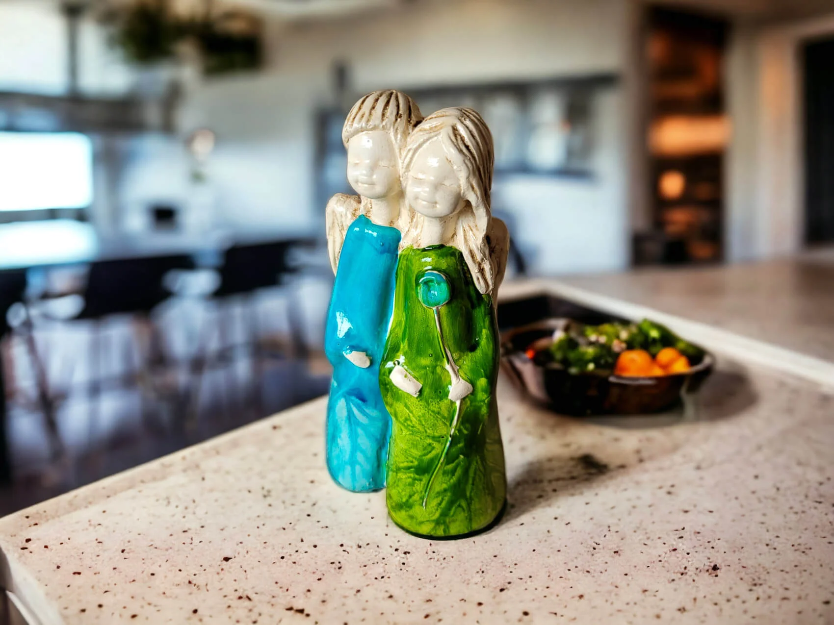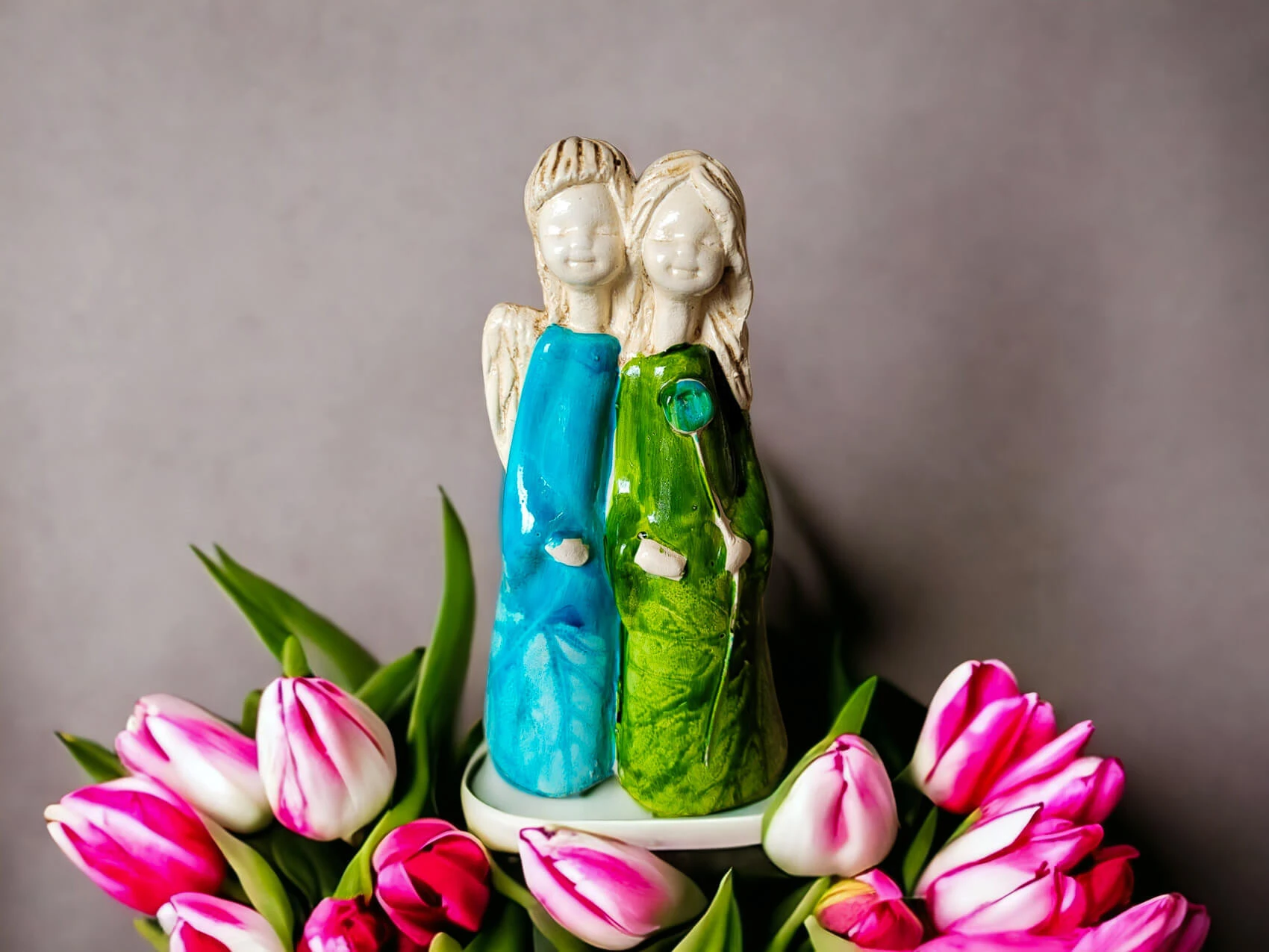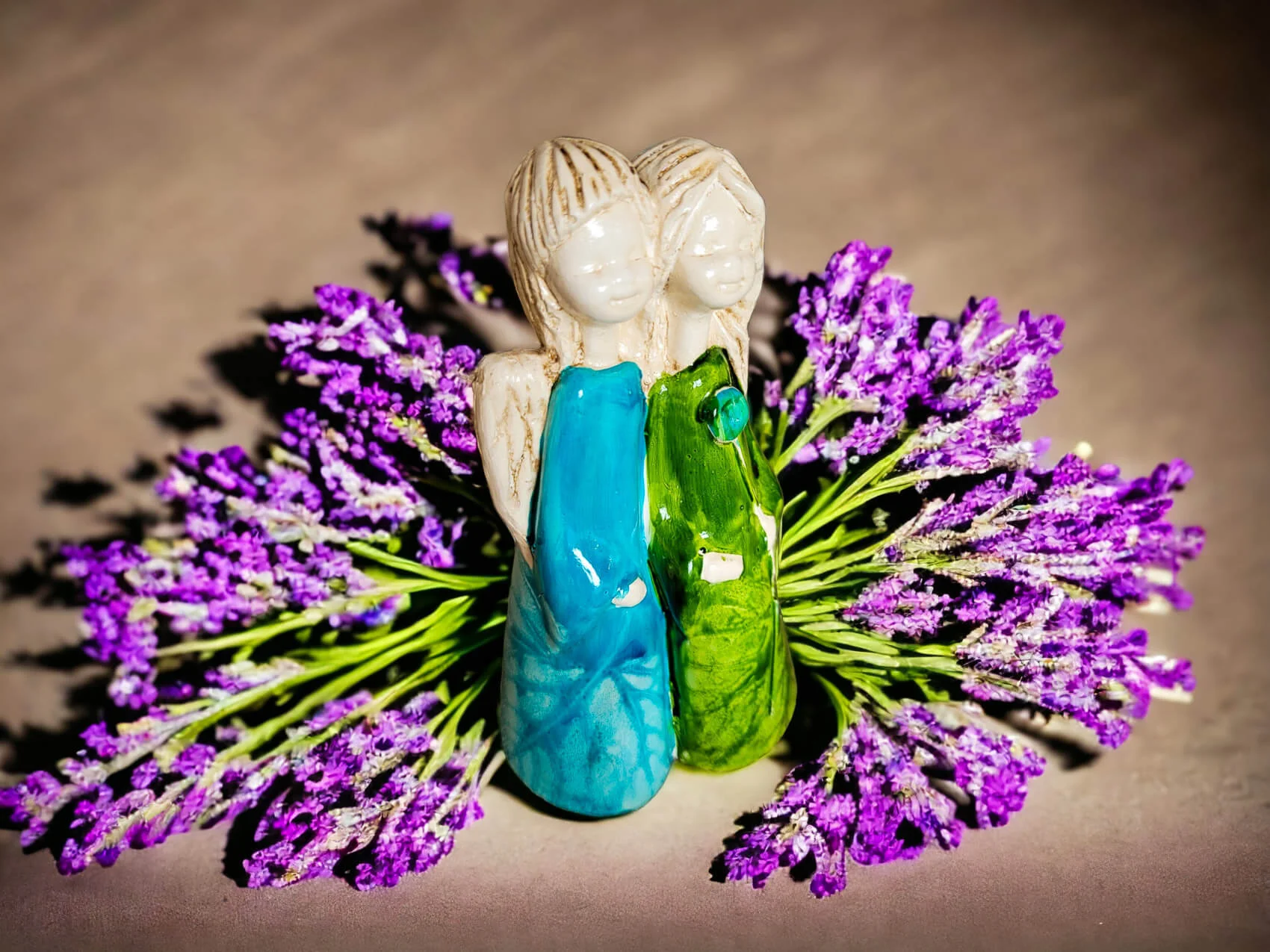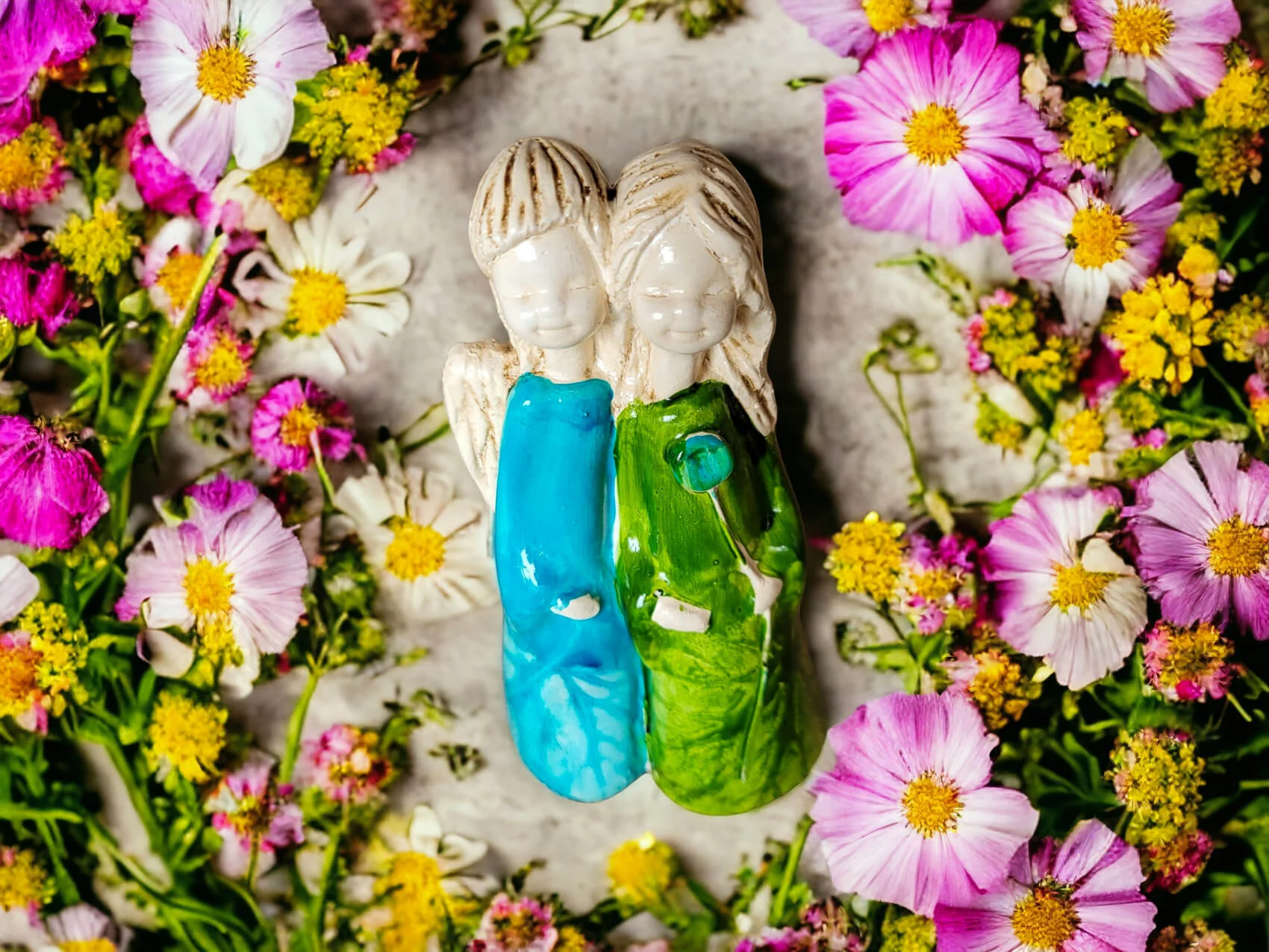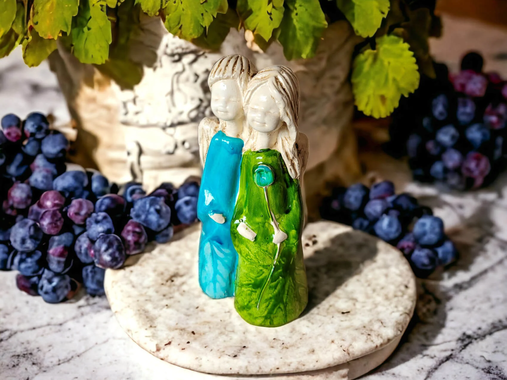 Apple & Ella w turkusowej i zielonej sukience to ręcznie wykonana figurka dwóch aniołków. Siostry czule się o siebie opierają. Może to świadczyć o ich siostrzanej bliskości oraz miłości do siebie. Aniołki ubrane są w piękne, długie subtelne suknie w kolorze białym i niebieskim, co świadczy o ich czystości, niewinności i beztroskim wieku dziecięcym. Figurka idealnie nadaje się na prezent dla dziewczynki jako pamiątka komunijna lub dla przyjaciółki. Pięknie będzie zdobić domowe wnętrze jak i spełniać funkcję ozdoby ogrodowej.