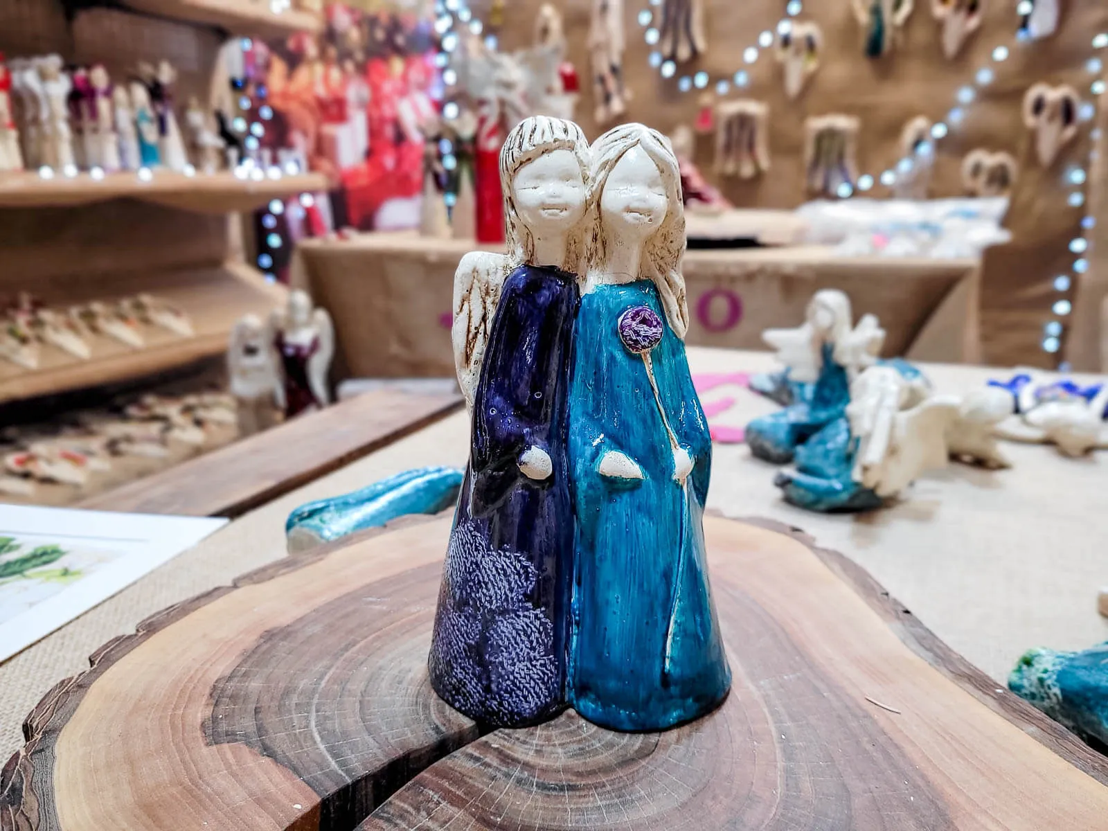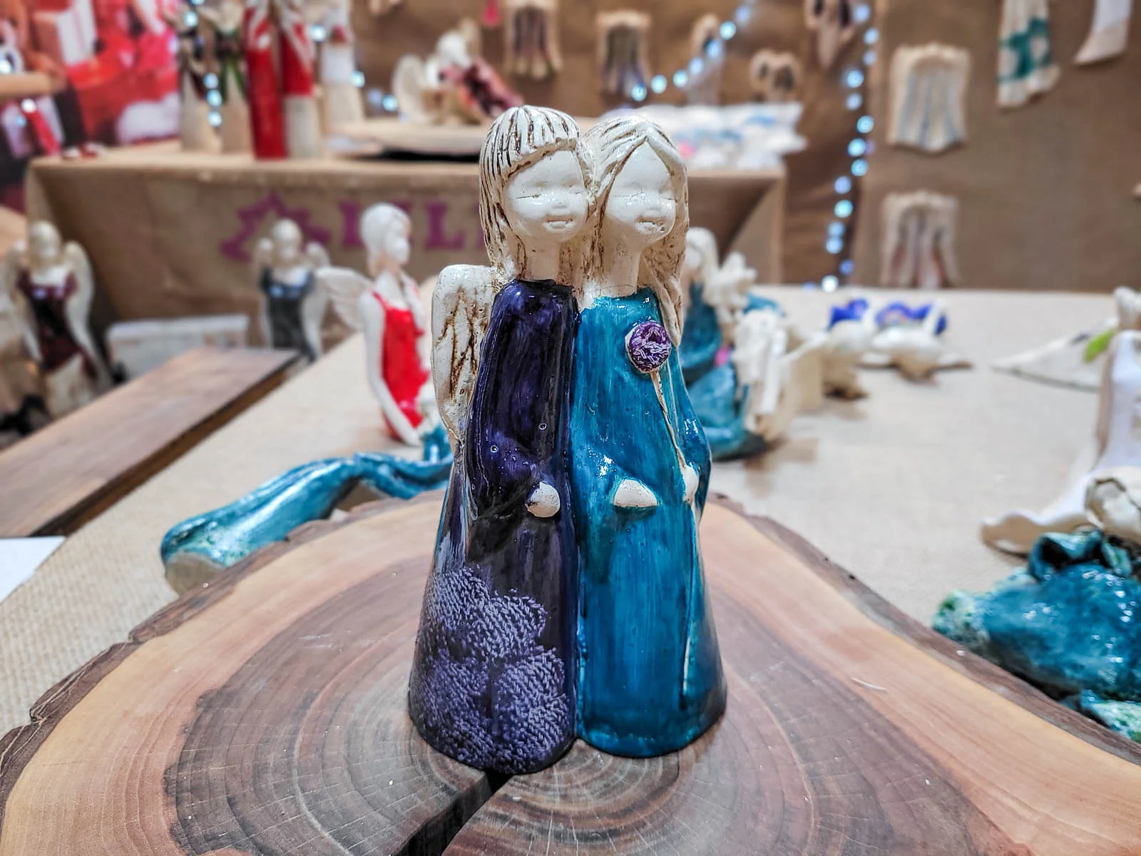 Apple & Ella w granatowej i turkusowej sukience to ręcznie wykonana figurka dwóch aniołków. Siostry czule się o siebie opierają. Może to świadczyć o ich siostrzanej bliskości oraz miłości do siebie. Aniołki ubrane są w piękne, długie subtelne suknie w kolorze białym i niebieskim, co świadczy o ich czystości, niewinności i beztroskim wieku dziecięcym. Figurka idealnie nadaje się na prezent dla dziewczynki jako pamiątka komunijna lub dla przyjaciółki. Pięknie będzie zdobić domowe wnętrze jak i spełniać funkcję ozdoby ogrodowej.
