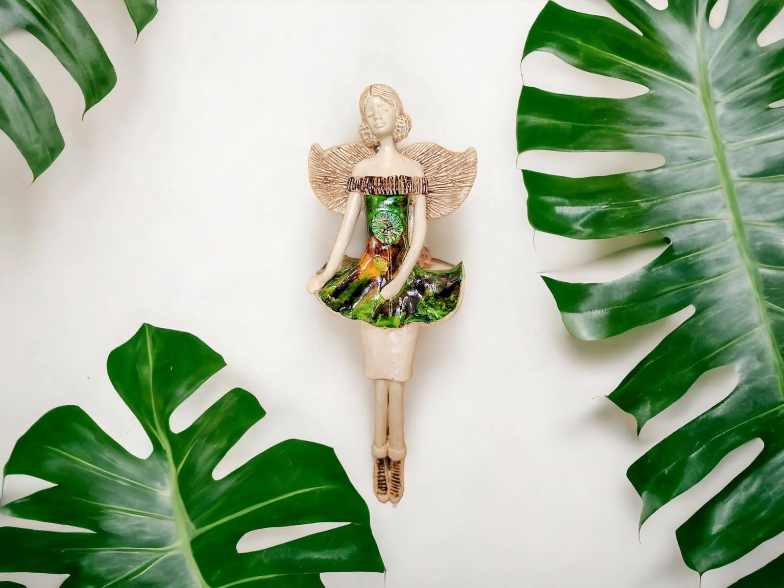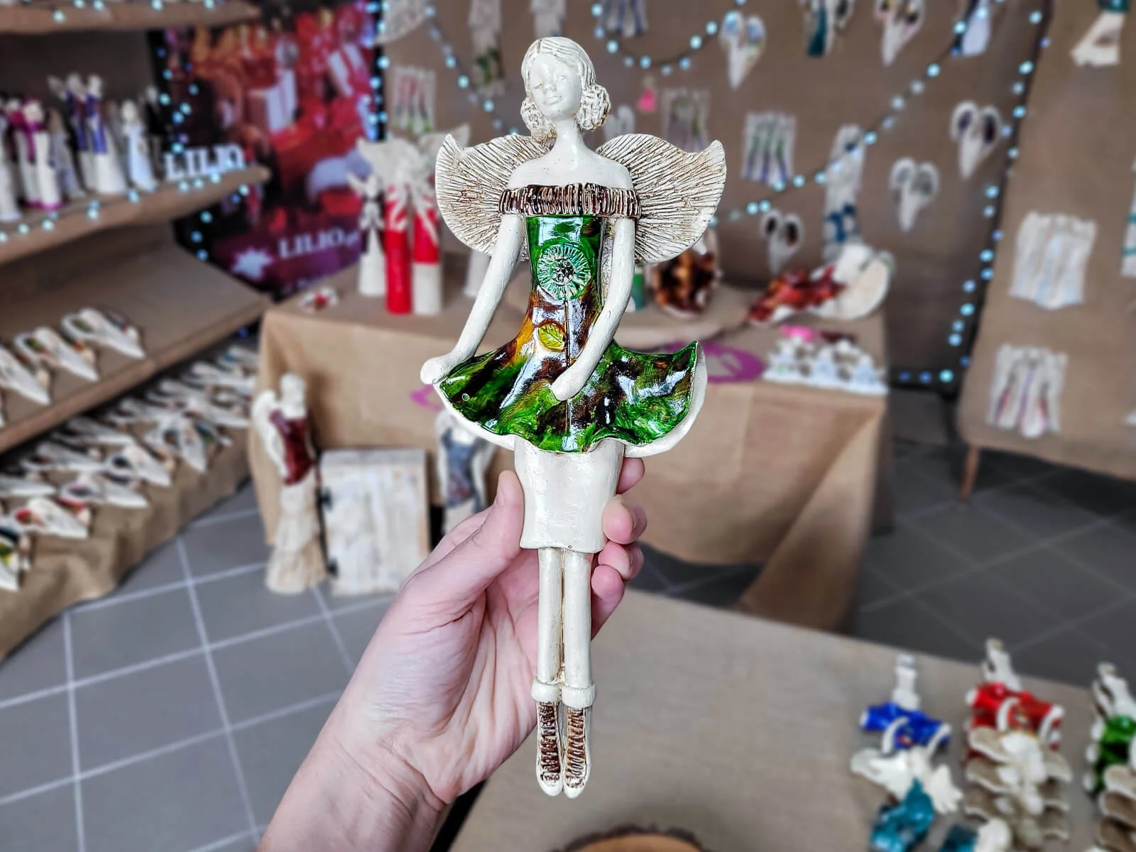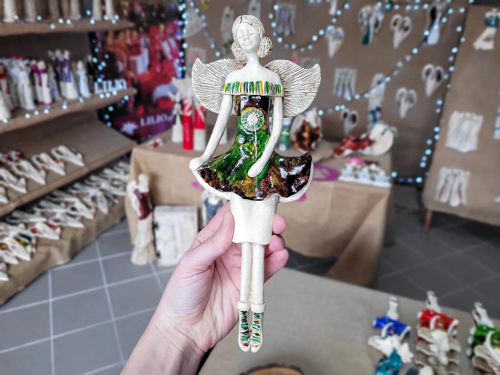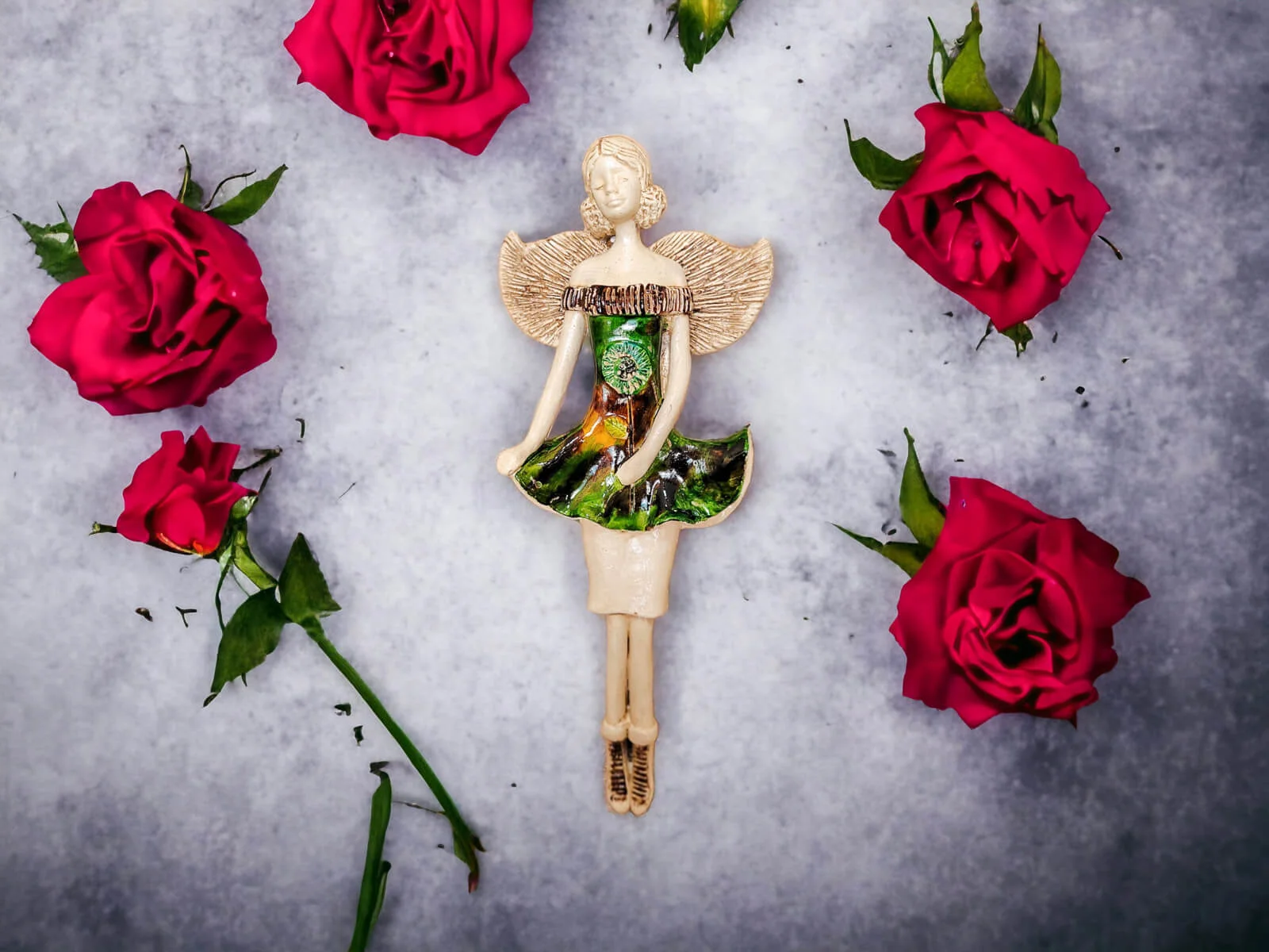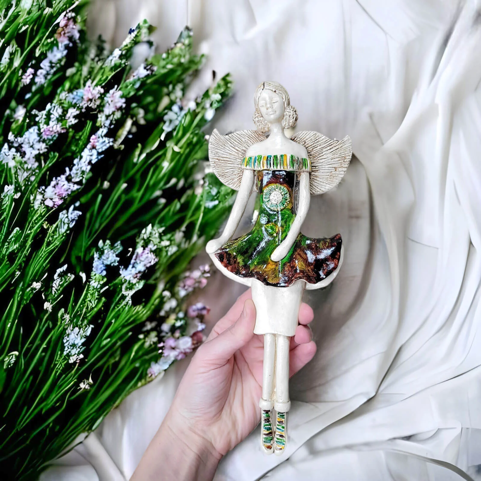 Anioł Theresa Art to niezwykła postać, której delikatność i elegancja zachwycają od pierwszego spojrzenia. Jej filigranowa zielona sukienka oplata ją niczym liście wiosennej rośliny, nadając jej wyjątkowy urok. Zestawiona z delikatnymi rysami twarzy, sukienka podkreśla naturalne piękno postaci.