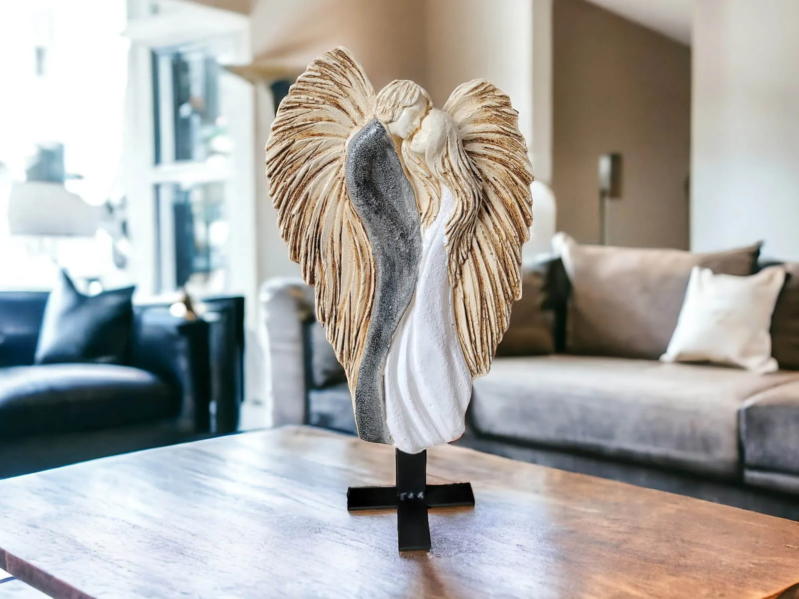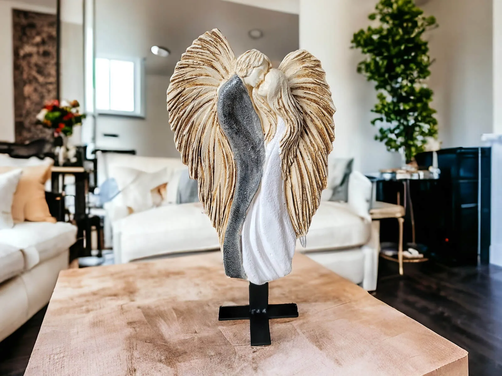Miłość spleciona na zawsze. Dwie subtelne postacie aniołów, splecione w delikatnym uścisku, tworzą formę inspirowaną symbolem Yin-Yang – znak równowagi i uzupełniania się energii. To nie tylko dekoracja, ale manifest wspólnej drogi, wzajemnego wsparcia i harmonii.