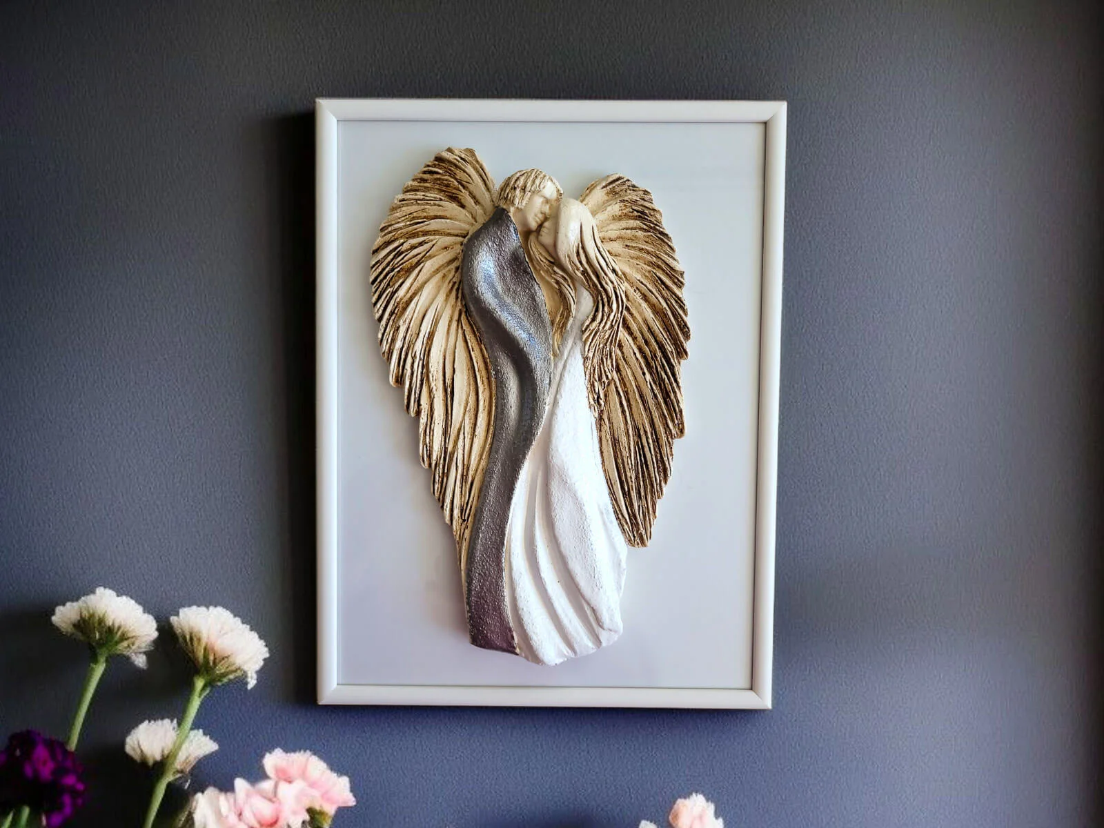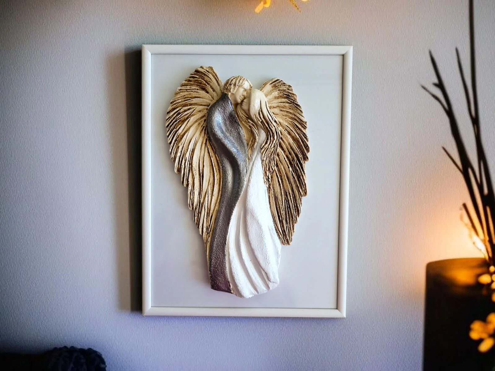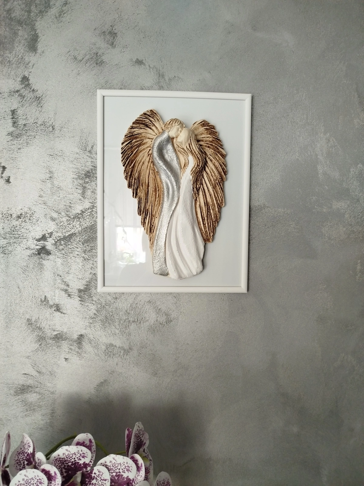 Anioły wykonane zostały z gipsu, a ich ręczne malowanie nadaje im wyjątkowy charakter. Umieszczone na szybie eleganckiej drewnianej ramki sprawia, że uzyskują efekt trójwymiarowości, co dodaje im jeszcze większego uroku.