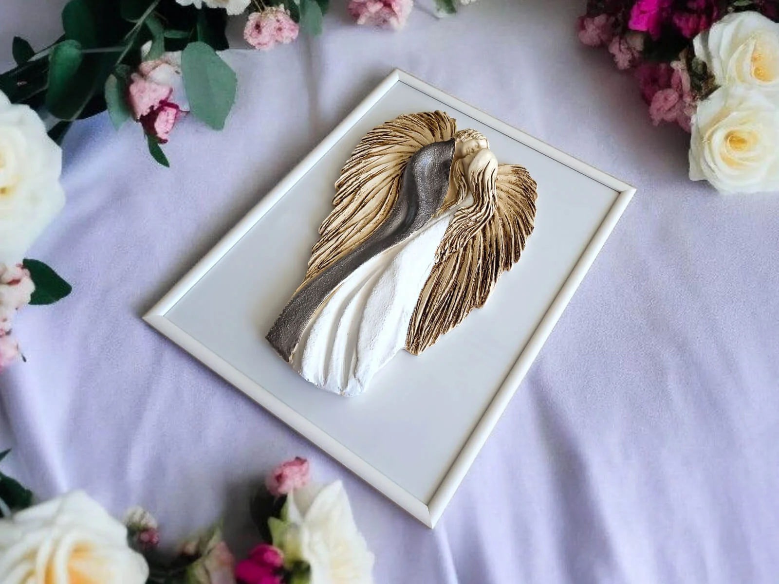Figurka Zakochane Anioły srebrno białe na eleganckiej drewnianej ramce to ręcznie robiona figurka która przenosi nas do świata równowagi i harmonii, nawiązując do koncepcji Yin i Yang. Te delikatne anioły w kolorze białym i srebrnym, umieszczone na eleganckiej drewnianej ramce, tworzą piękny kontrast i emanują subtelnością.