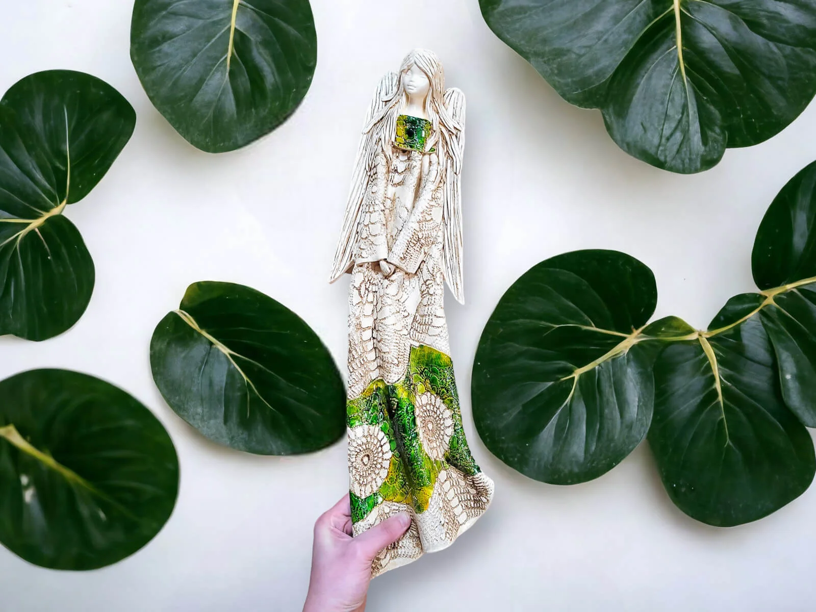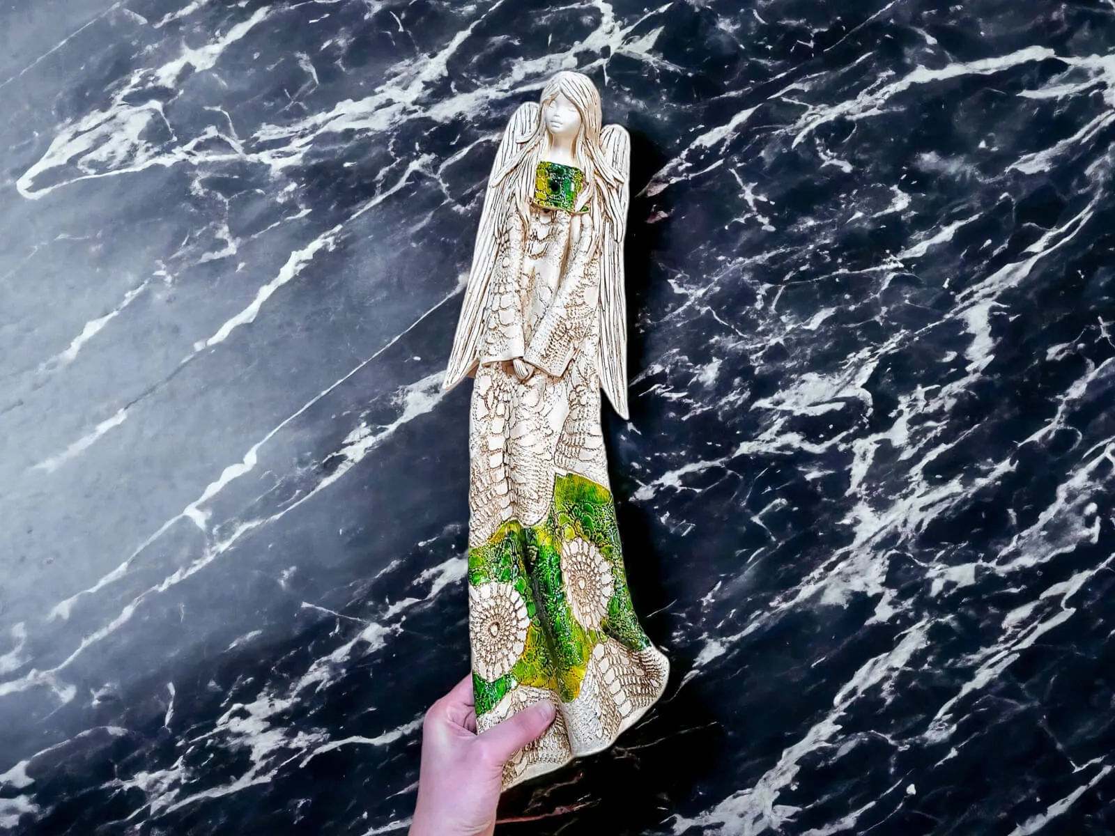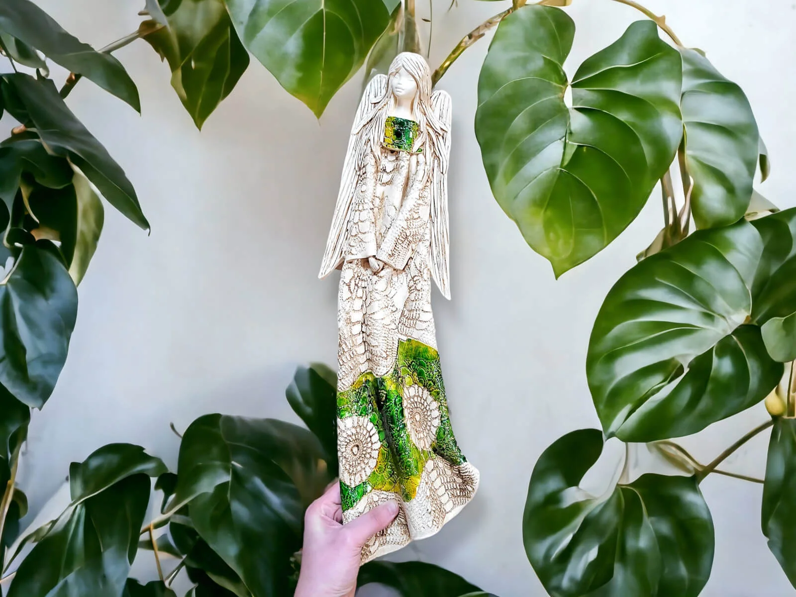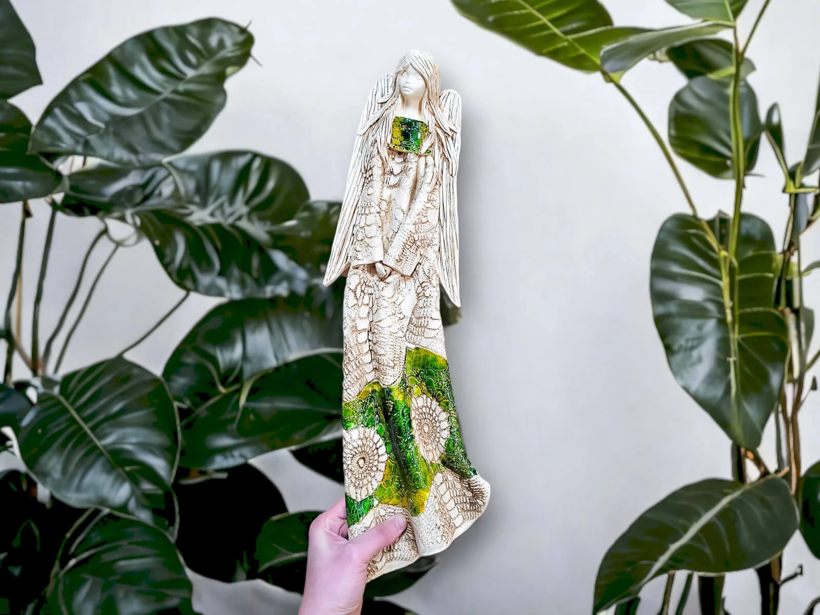Anioł Genesis to ręcznie wykonana figurka do zawieszenia na ścianę w kolorze zielonym. Jego imię jest pochodzenia greckiego. Anioł jest pełen tajemnic. Cały swój czas poświęca sprawom społecznym. Potrafi każdemu udzielić pomocy i wsparcia. Troska o innych wypływa prosto z jej serca. Jest ubrany w zwiewną, beżową suknie z haftowanymi ornamentami. Z gracją eksponuje rozłożyste skrzydła. Figurka nadaje się na prezent na każdą okazję.