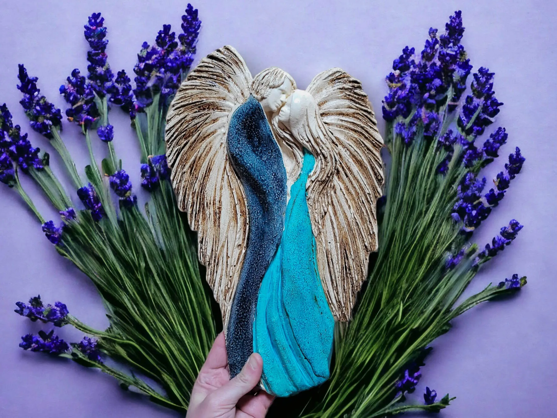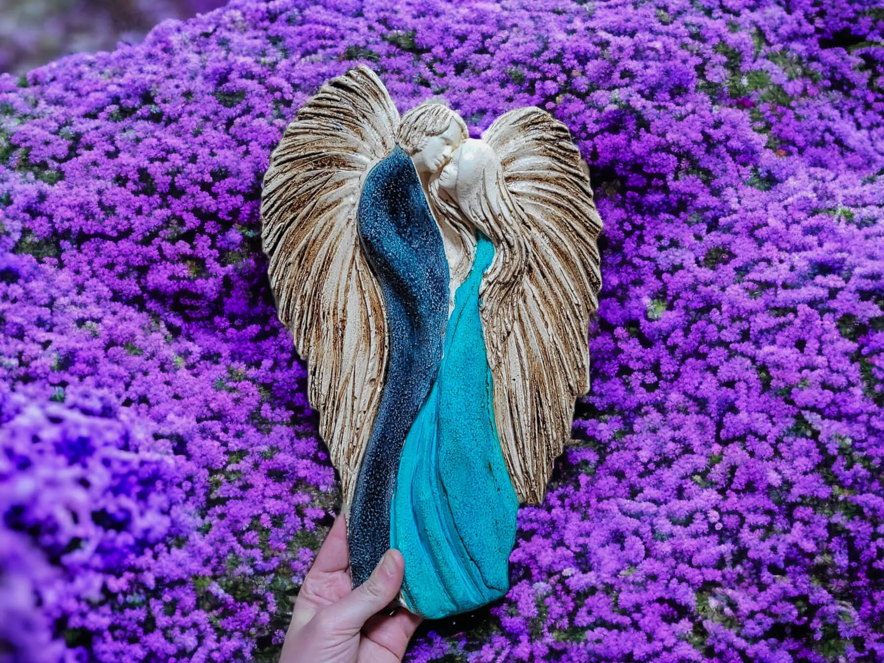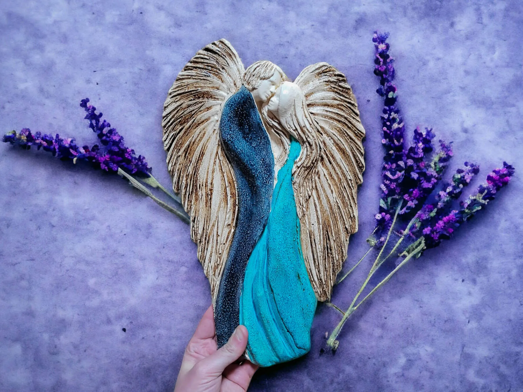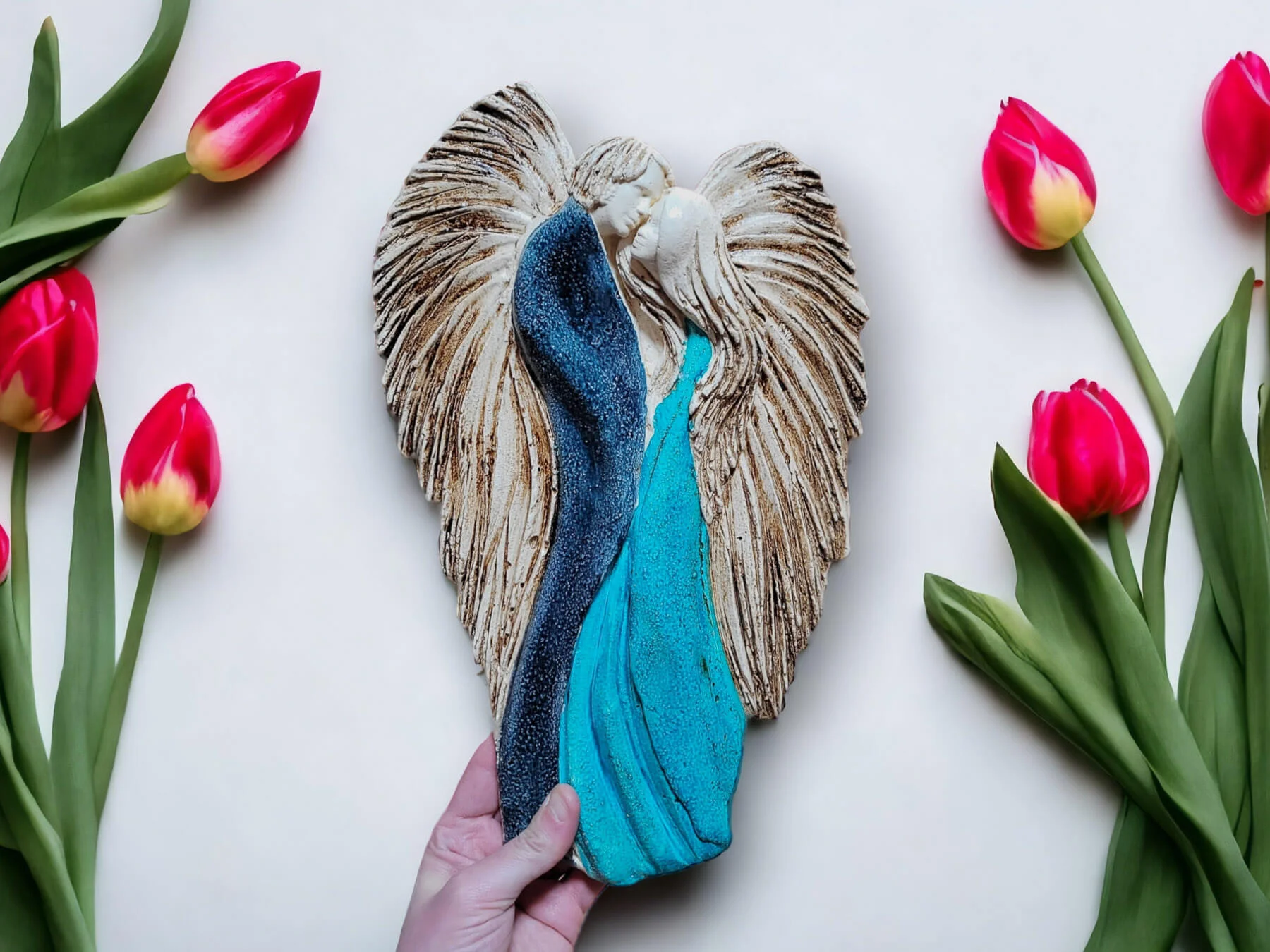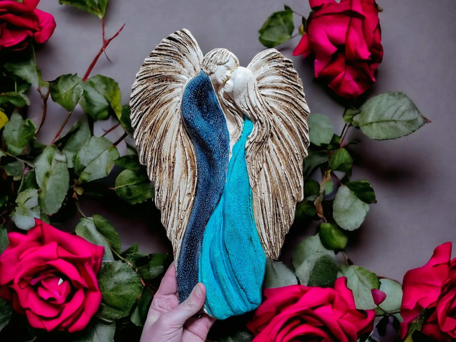 Ręcznie robione i malowane figurki zakochanych aniołów w wersji granatowo turkusowej. Anioły symbolizują wielką miłość, splecione w miłosnym uścisku. Figurka nawiązuje do symbolu energetycznej harmonii - Yin Yang. Idealna na prezent na ślub lub rocznicę ślubu, dla kochającej pary. Pięknie prezentuje się na ścianie w salonie czy sypialni. Klienci twierdzą, że w rzeczywistości wygląda lepiej niż na zdjęciach. Tutaj przeczytasz więcej o harmonii Yin Yang.