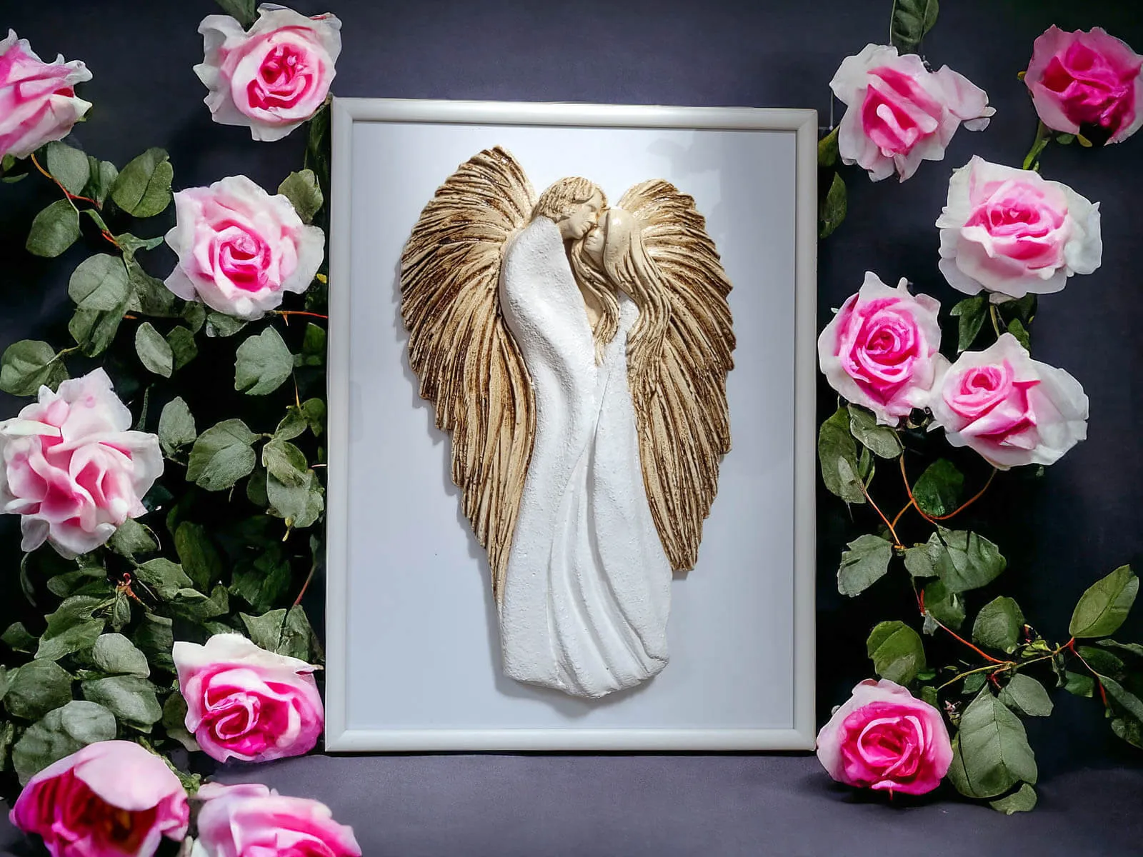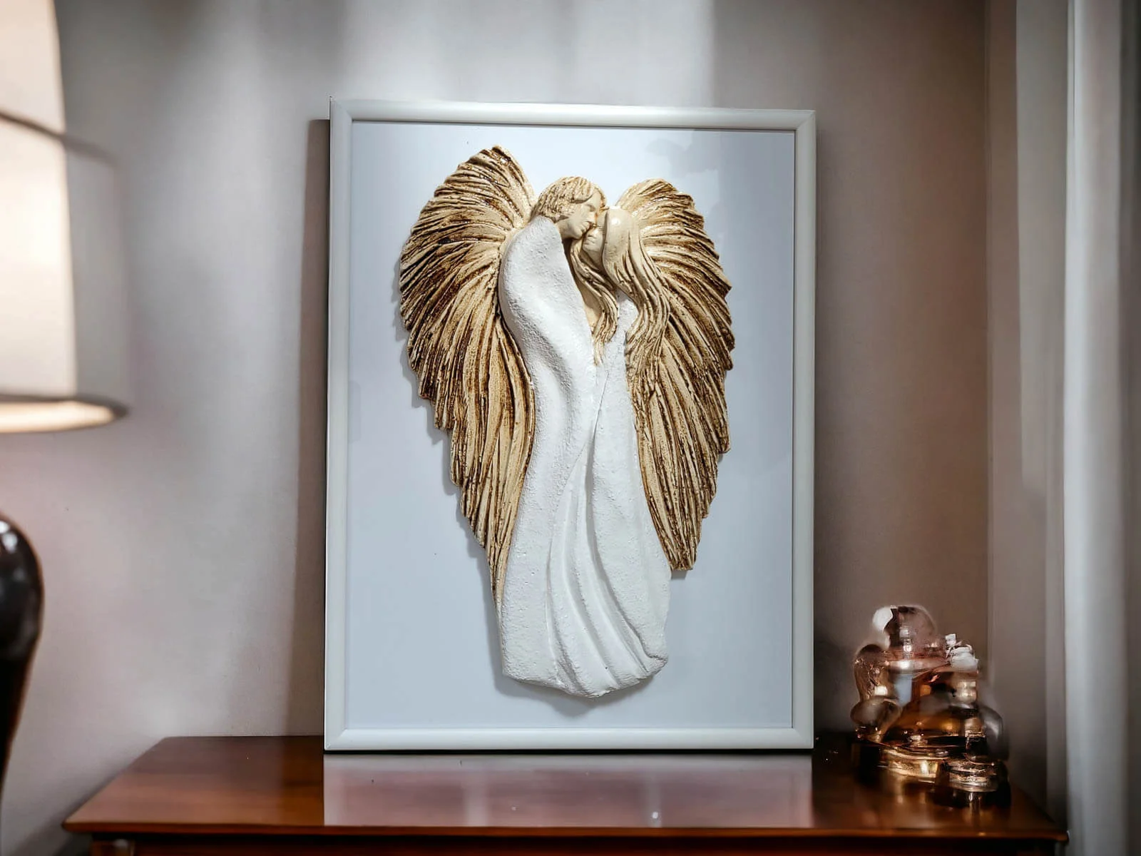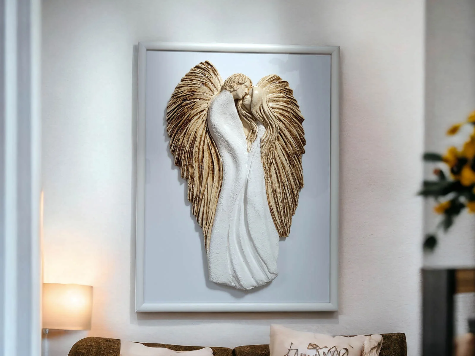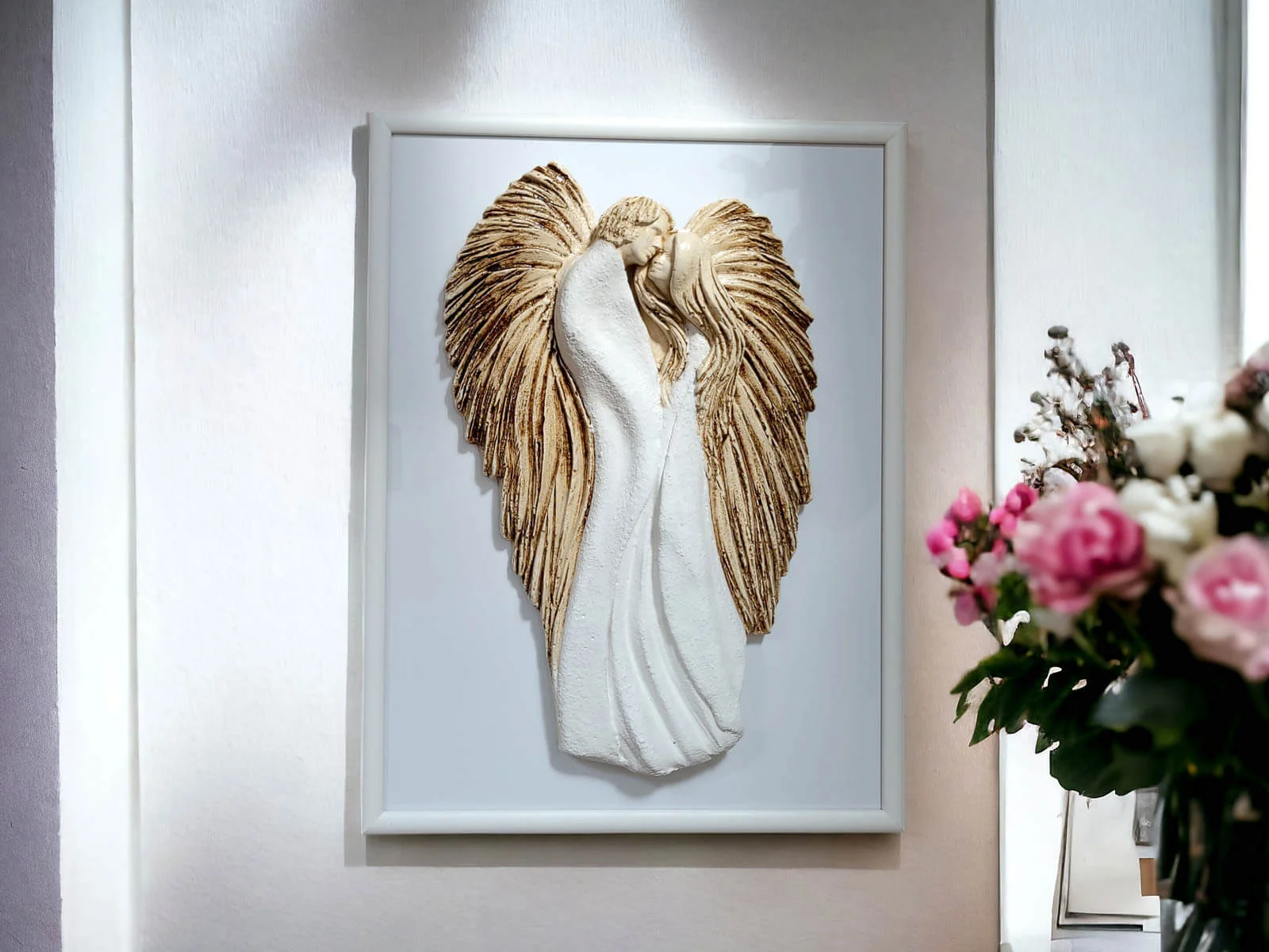 Anioły wykonane zostały z gipsu, a ich ręczne malowanie nadaje im wyjątkowy charakter. Umieszczone na szybie eleganckiej drewnianej ramki sprawia, że uzyskują efekt trójwymiarowości, co dodaje im jeszcze większego uroku.