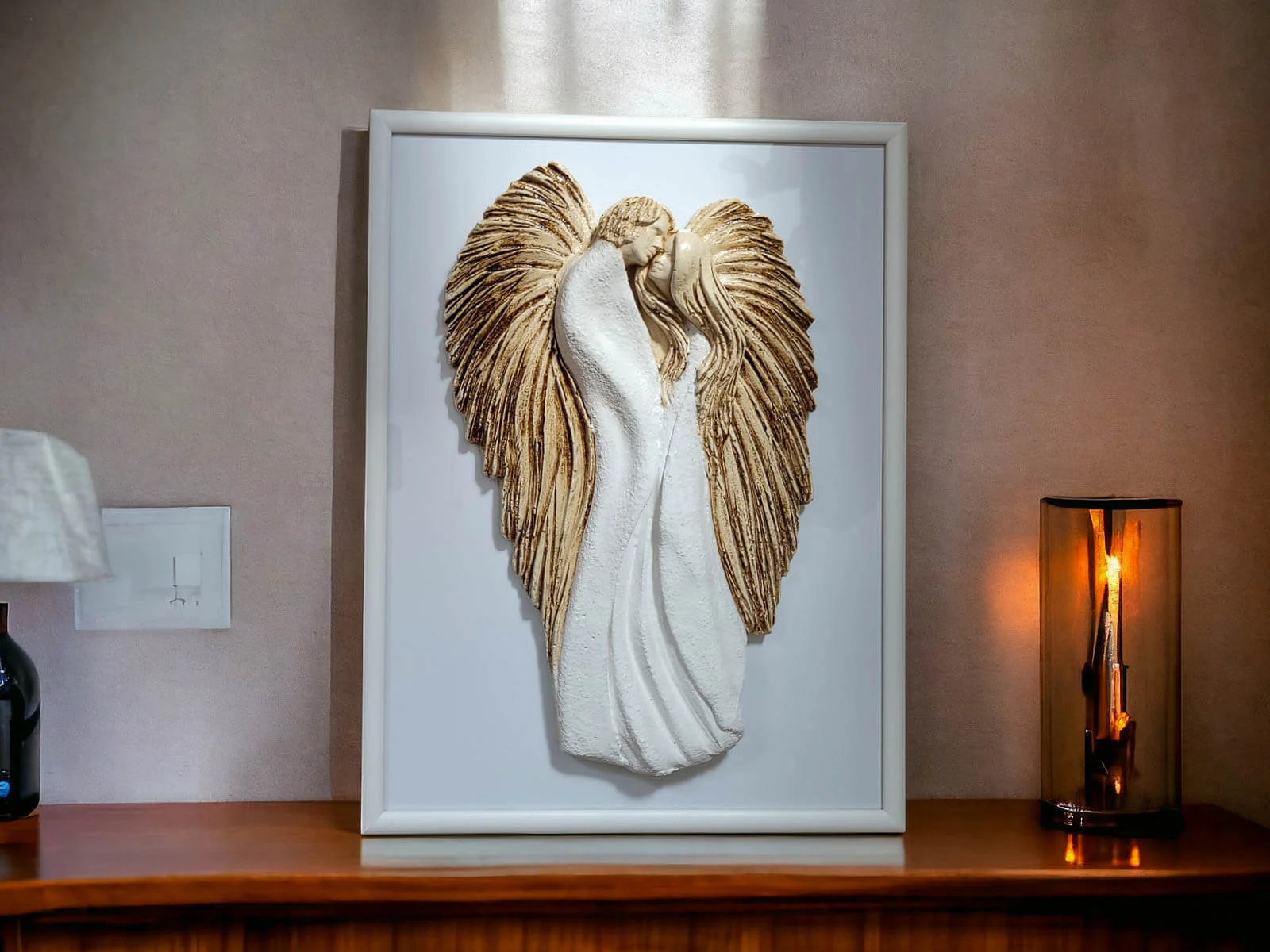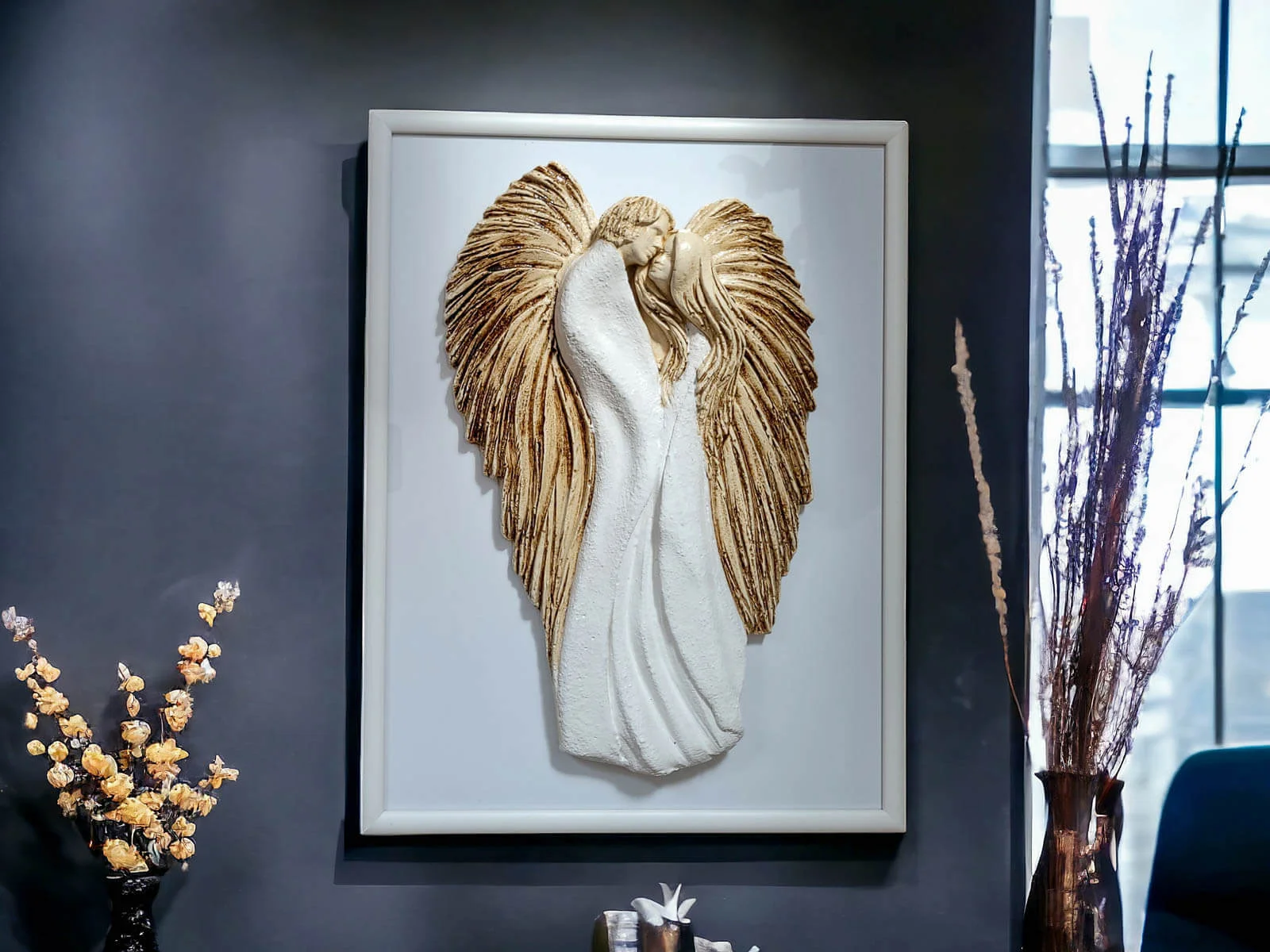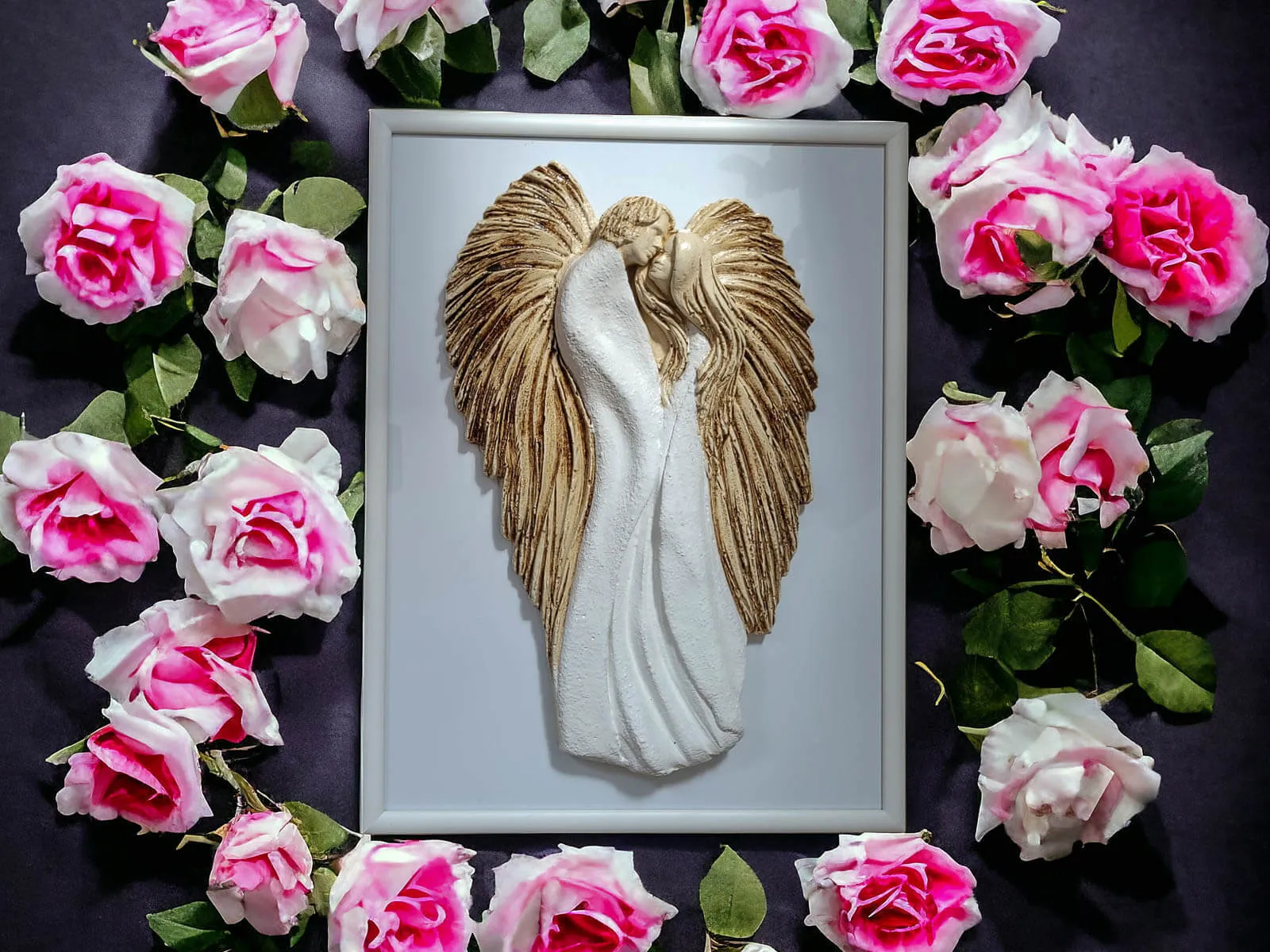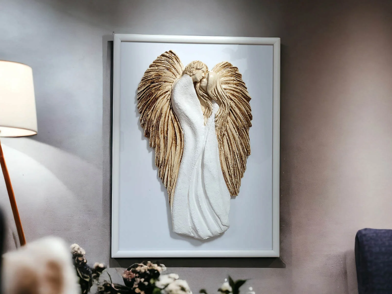 Anioły wykonane zostały z gipsu, a ich ręczne malowanie nadaje im wyjątkowy charakter. Umieszczone na szybie eleganckiej drewnianej ramki sprawia, że uzyskują efekt trójwymiarowości, co dodaje im jeszcze większego uroku.
