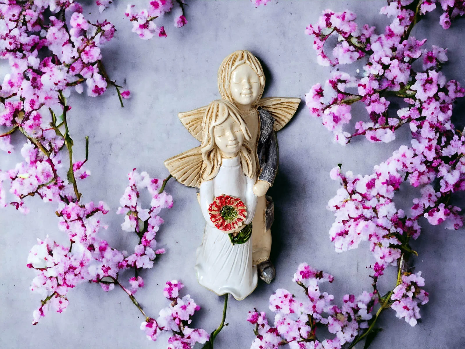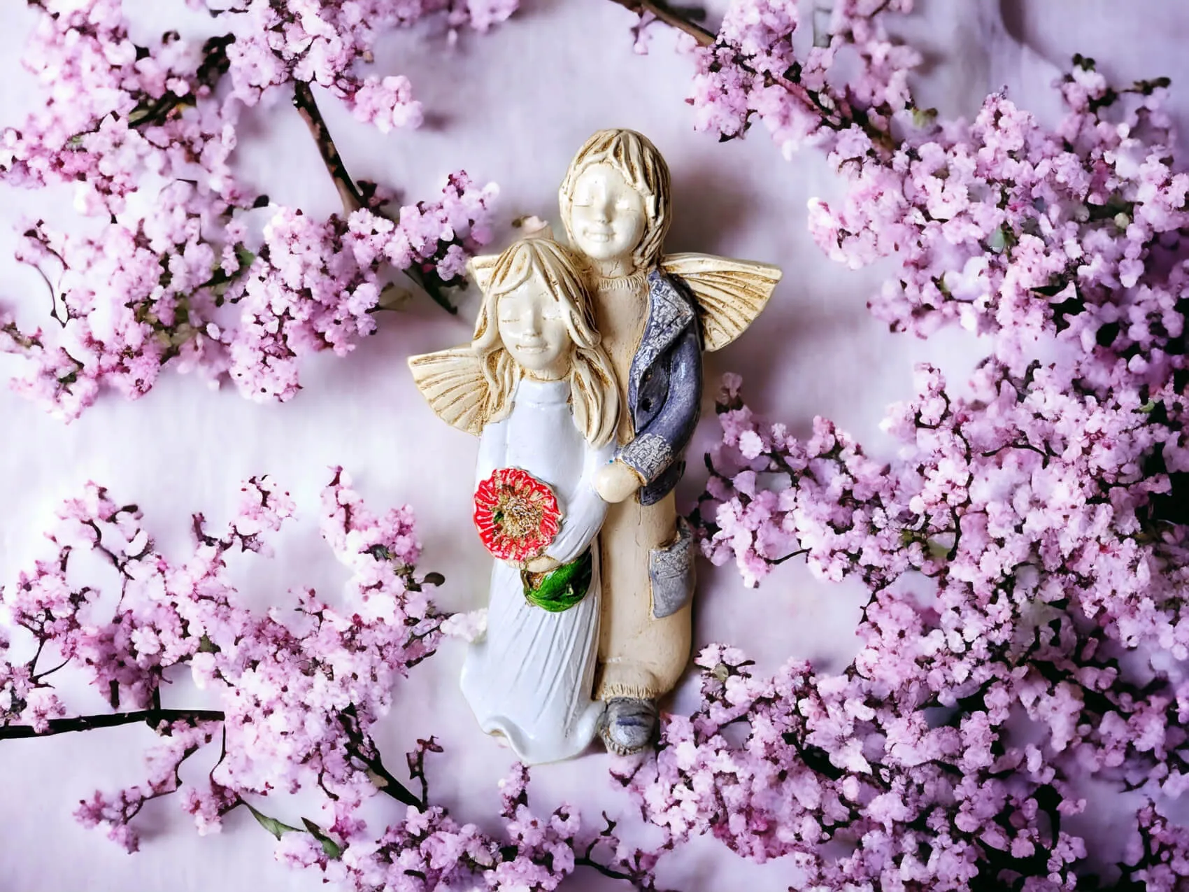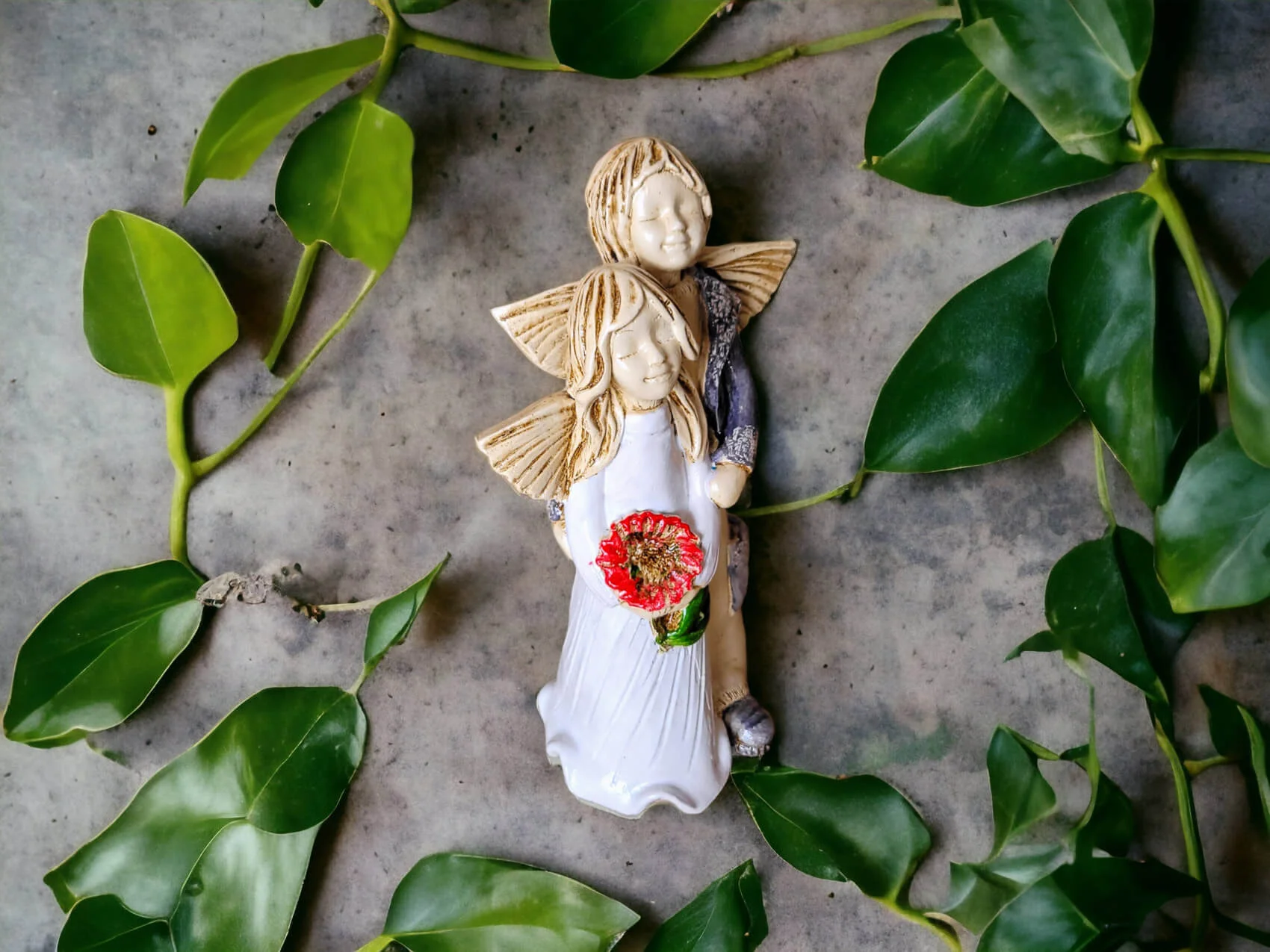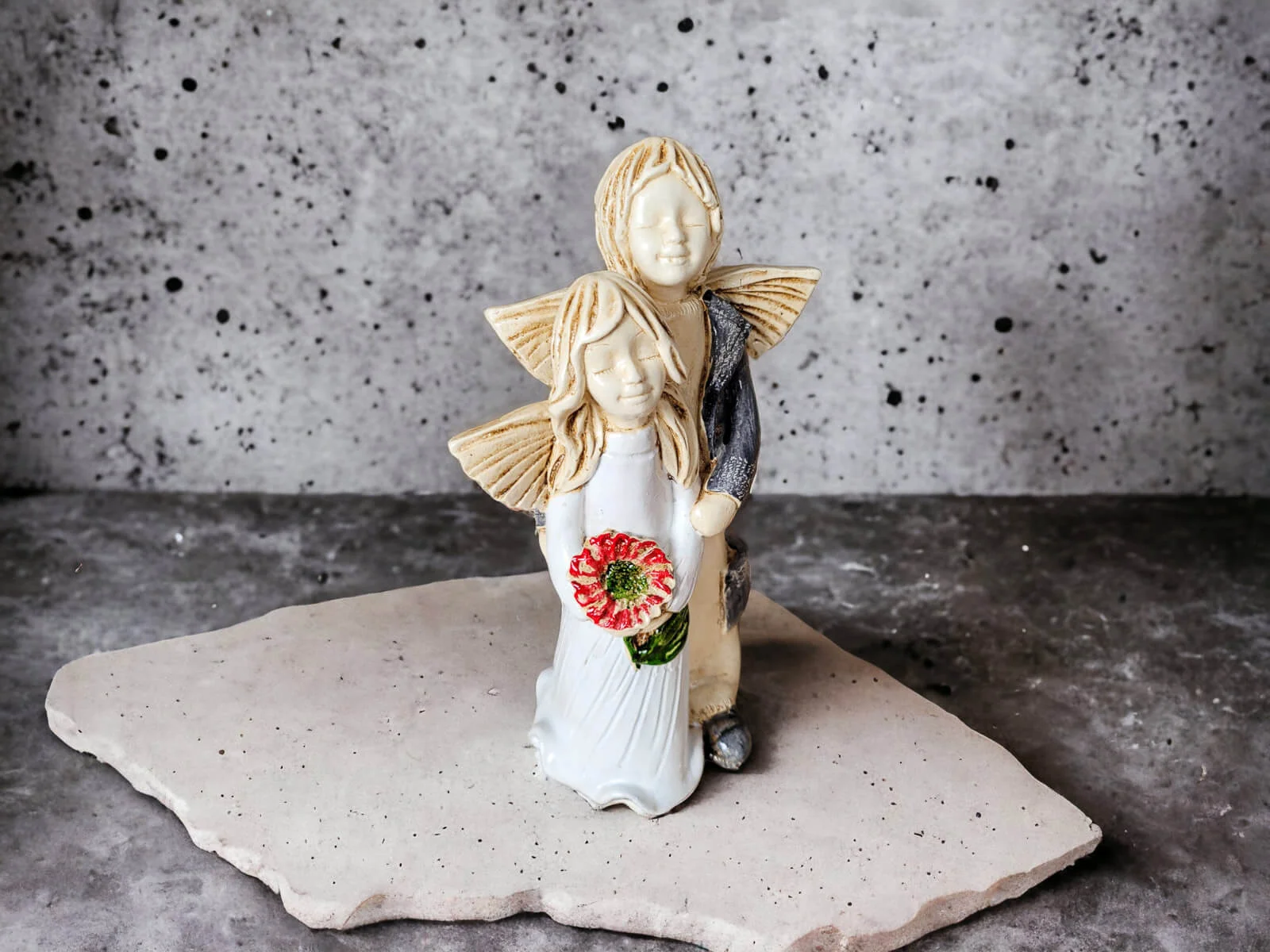Aniołki Allen i Alice w wersji srebrno zielonej. Alice ma na sobie białą sukienkę. To wrażenie wzmacnia czerwony bukiet. Allen z kolei jest ubrany w srebrny strój, co dodaje całości charakteru. Allen obejmuje Alice w czułym geście, a na twarzach obojga maluje się błogi uśmiech. Ta niewielka figurka będzie się wyróżniać wśród innych dekoracji i na pewno zaciekawi Twoich gości. Sprawdzi się również jako efektowny dodatek do prezentu ślubnego czy na I Komunię.