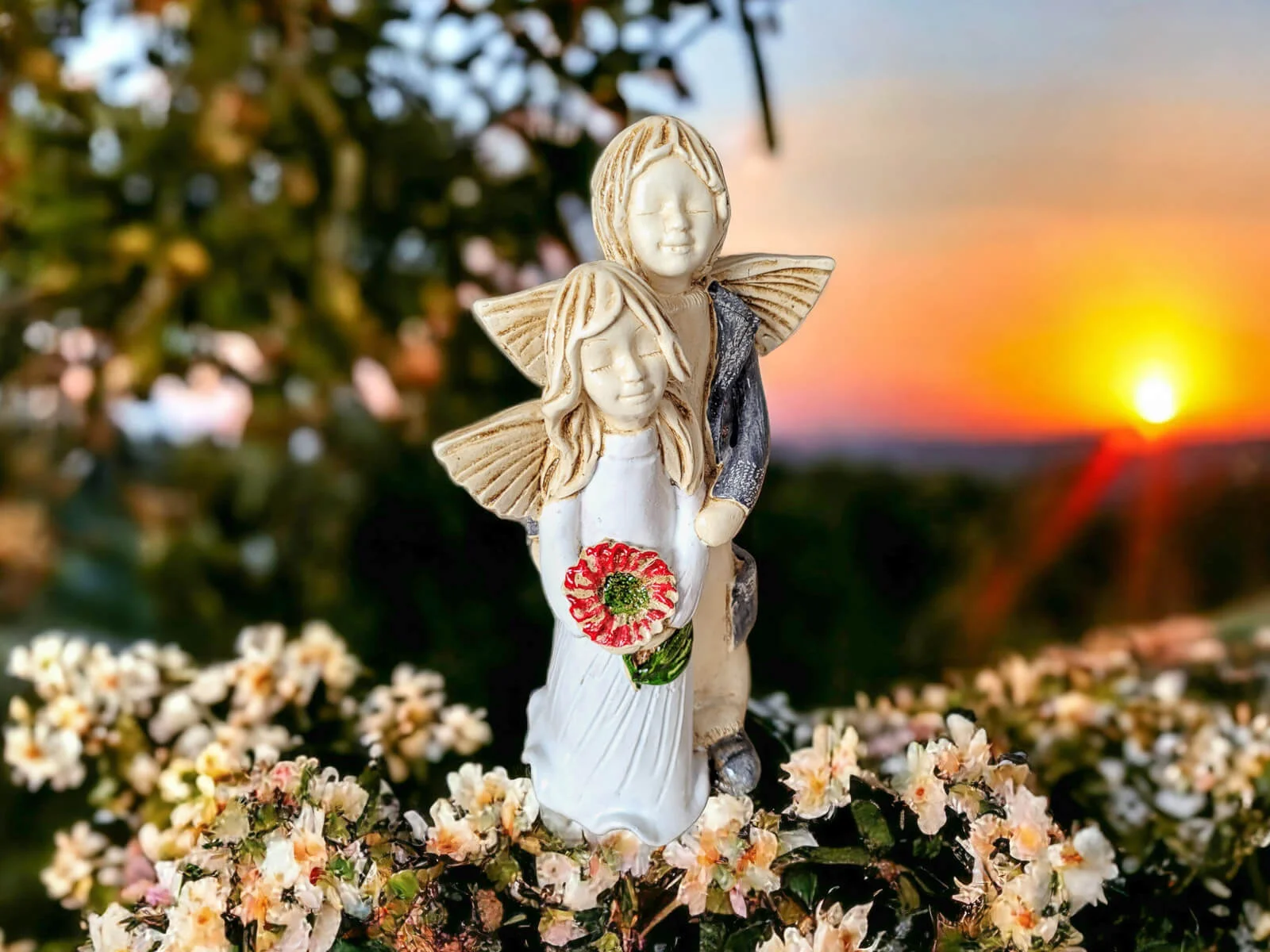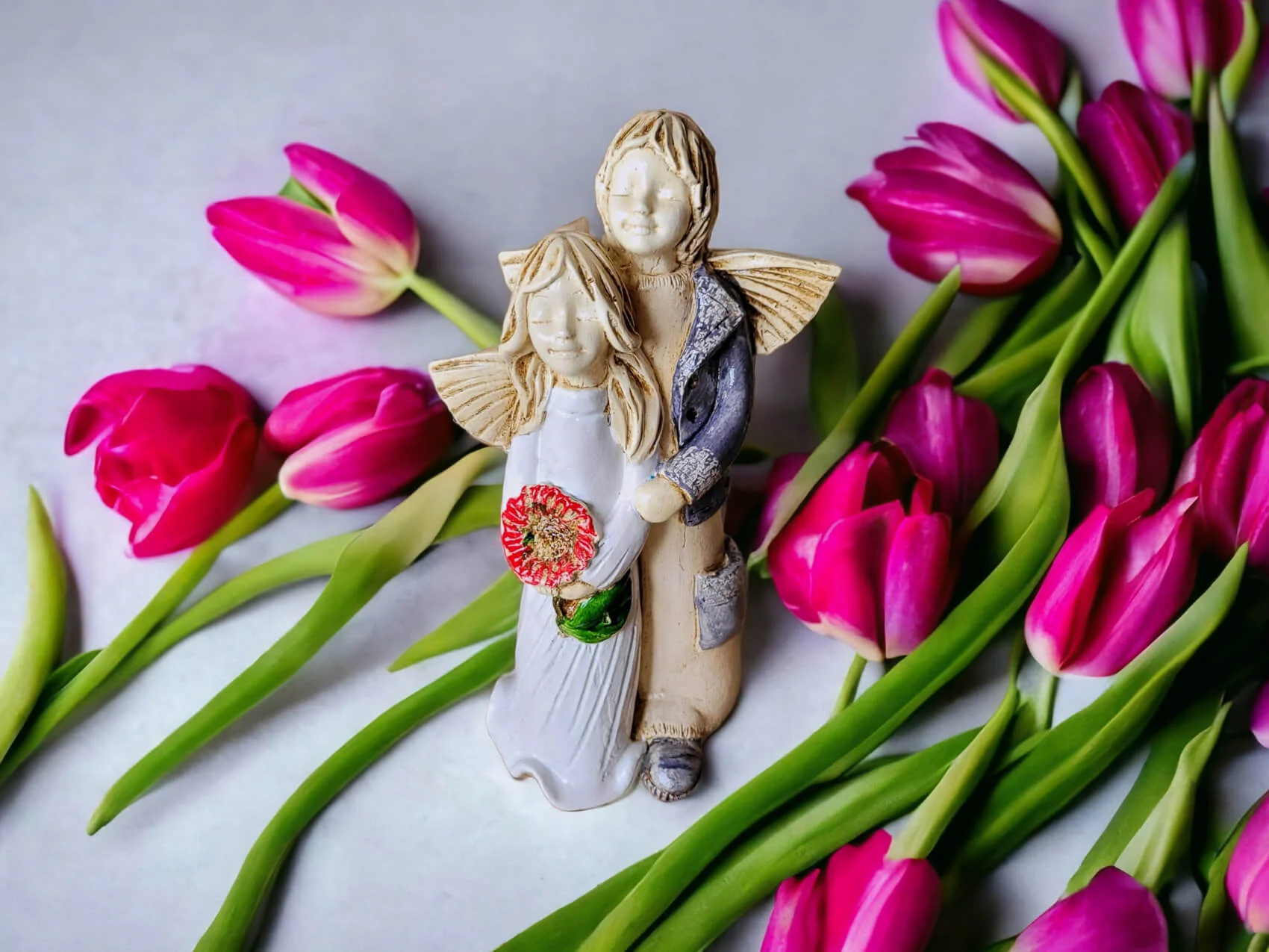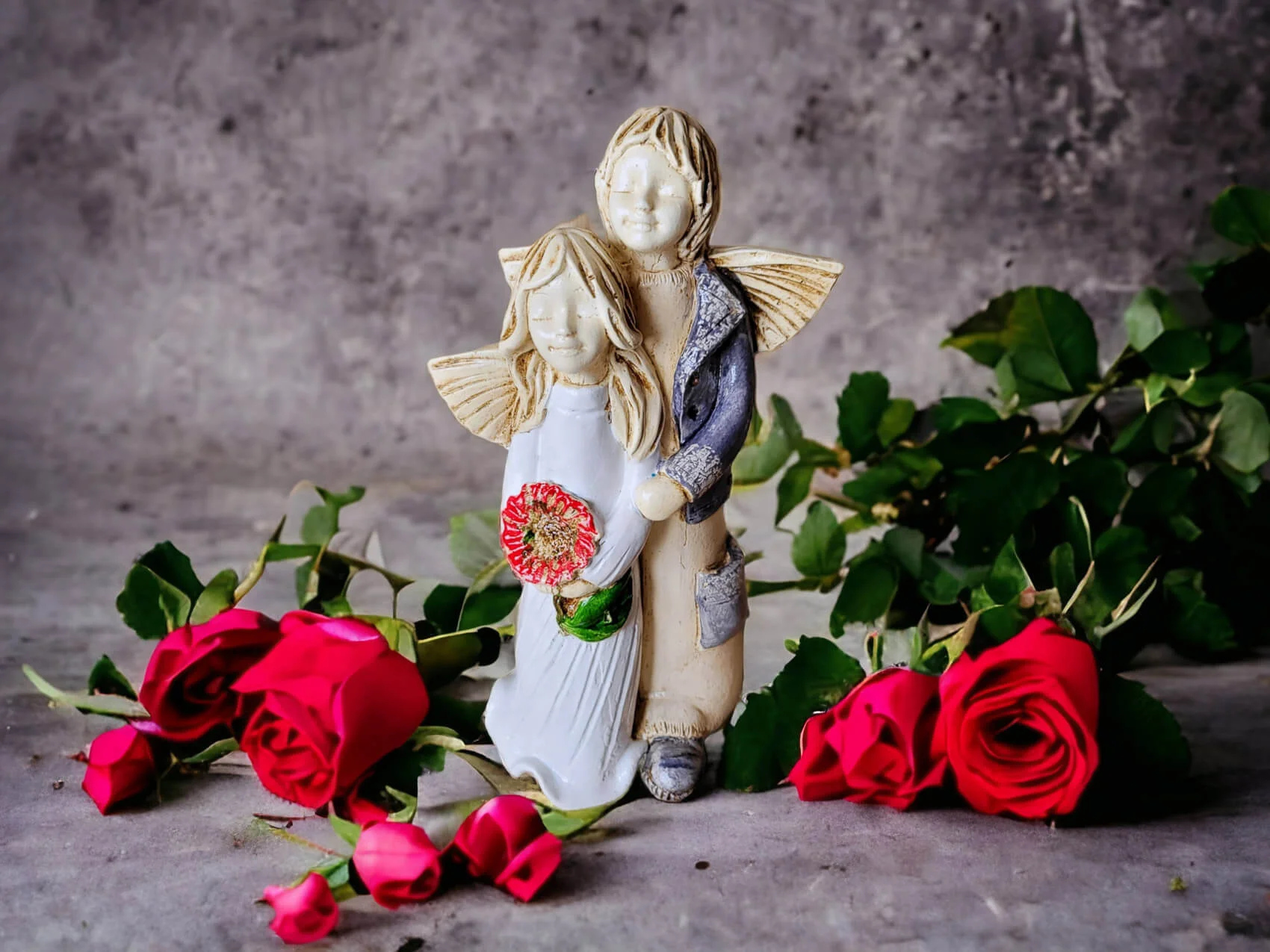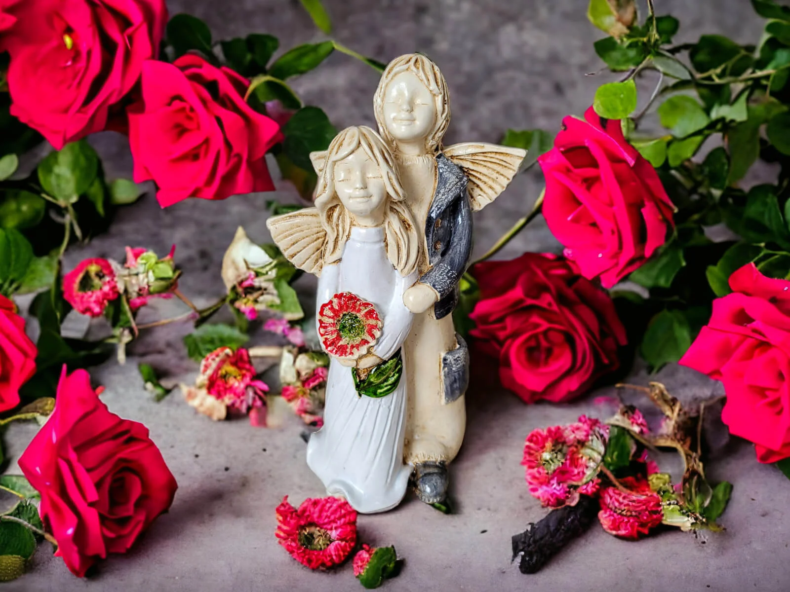 Aniołki Allen i Alice w wersji srebrno zielonej. Alice ma na sobie białą sukienkę. To wrażenie wzmacnia czerwony bukiet. Allen z kolei jest ubrany w srebrny strój, co dodaje całości charakteru. Allen obejmuje Alice w czułym geście, a na twarzach obojga maluje się błogi uśmiech. Ta niewielka figurka będzie się wyróżniać wśród innych dekoracji i na pewno zaciekawi Twoich gości. Sprawdzi się również jako efektowny dodatek do prezentu ślubnego czy na I Komunię.