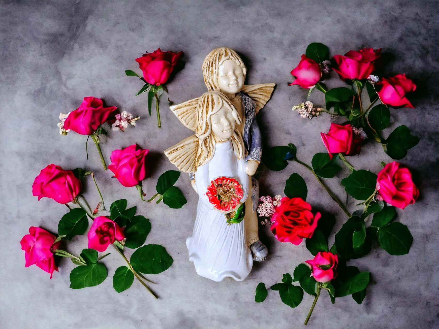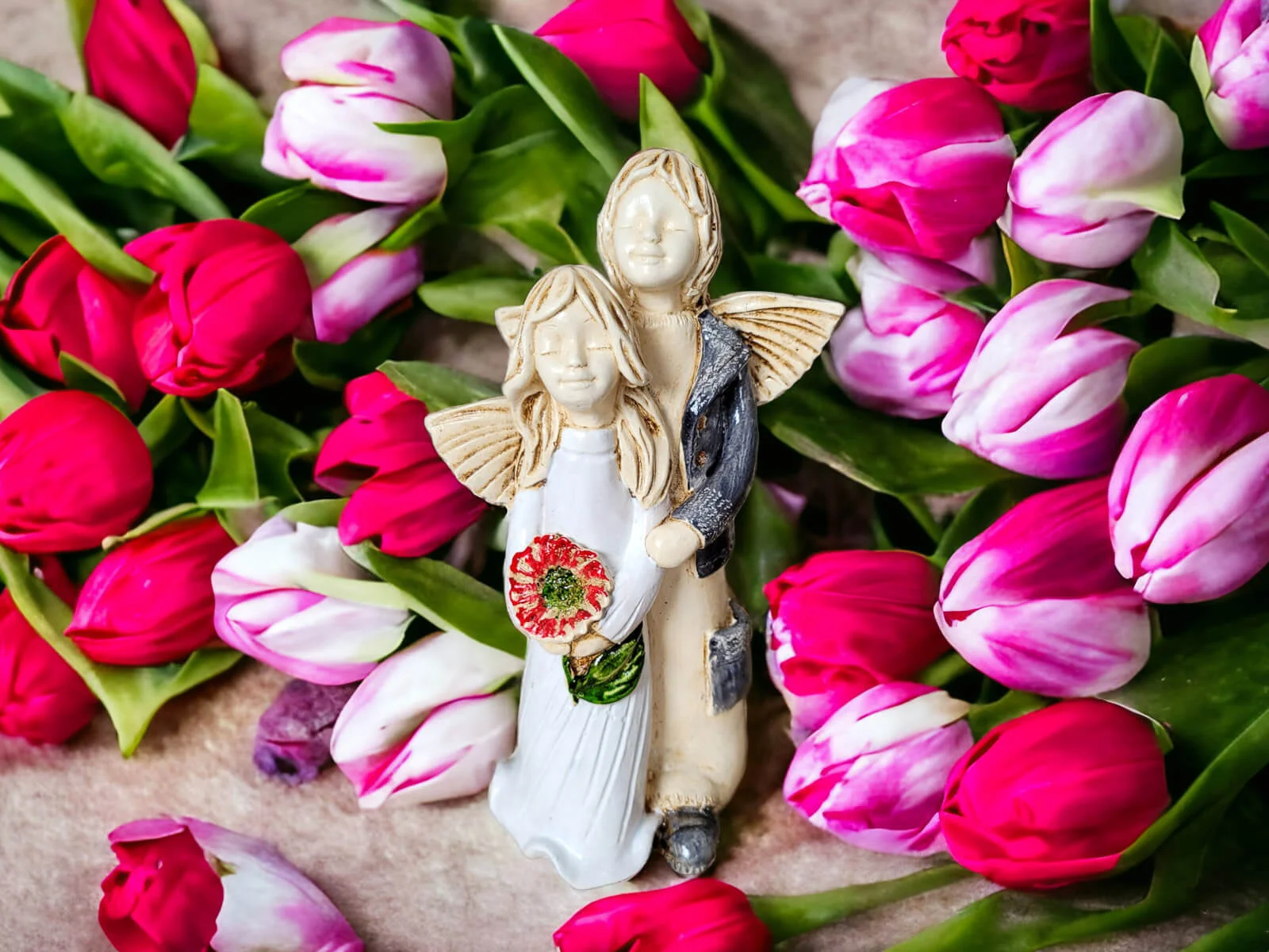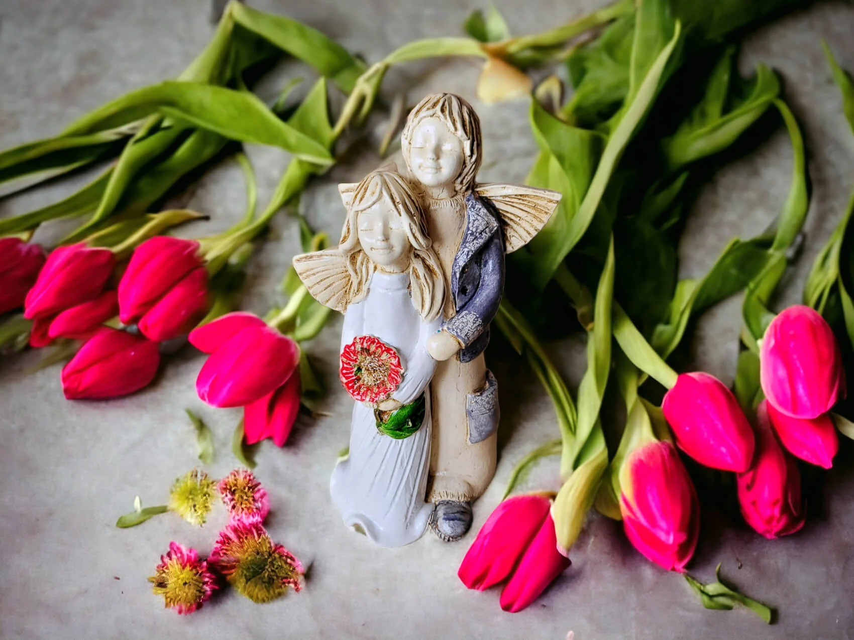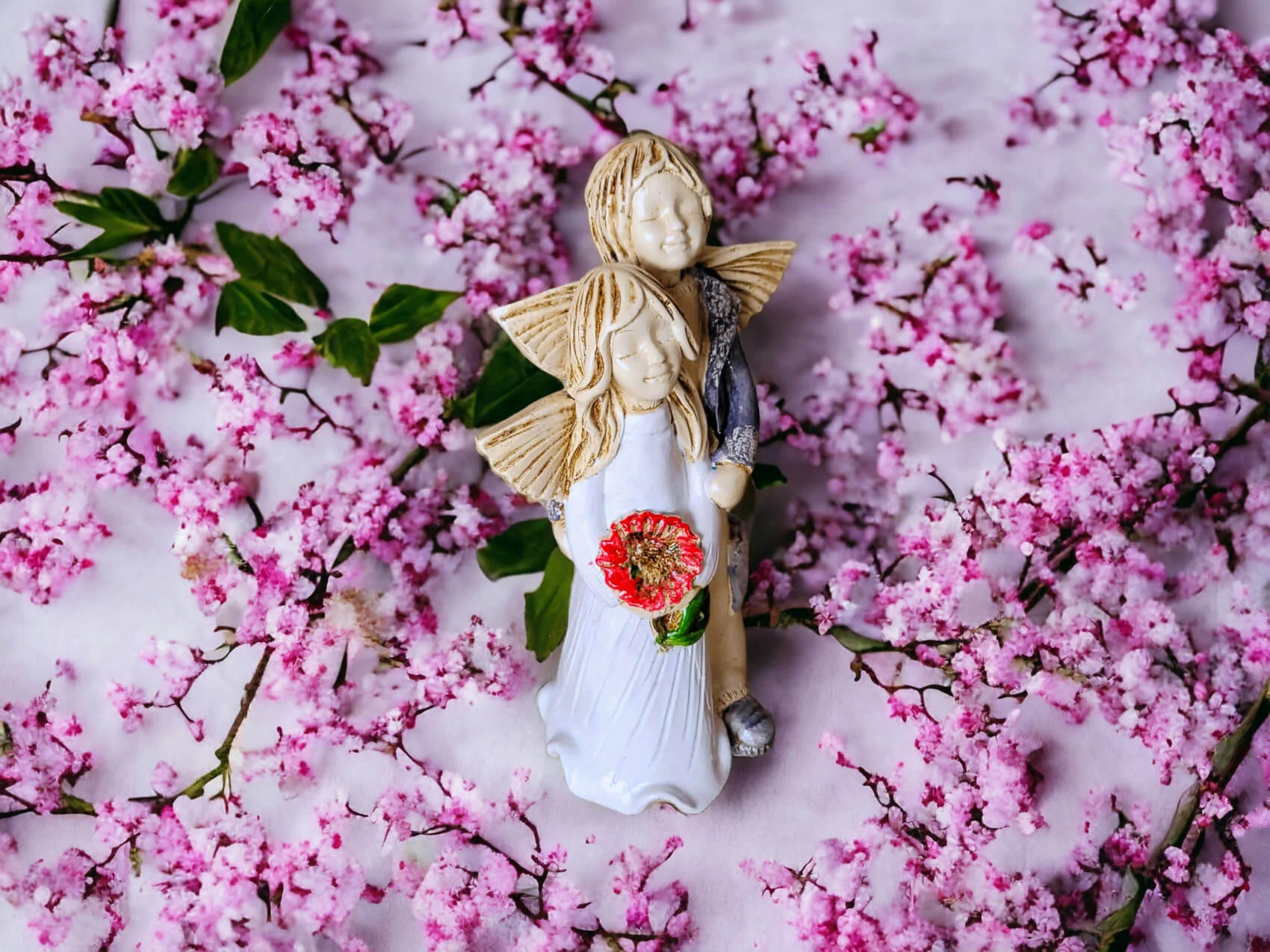Aniołki Allen i Alice w wersji srebrno zielonej. Alice ma na sobie białą sukienkę. To wrażenie wzmacnia czerwony bukiet. Allen z kolei jest ubrany w srebrny strój, co dodaje całości charakteru. Allen obejmuje Alice w czułym geście, a na twarzach obojga maluje się błogi uśmiech. Ta niewielka figurka będzie się wyróżniać wśród innych dekoracji i na pewno zaciekawi Twoich gości. Sprawdzi się również jako efektowny dodatek do prezentu ślubnego czy na I Komunię.