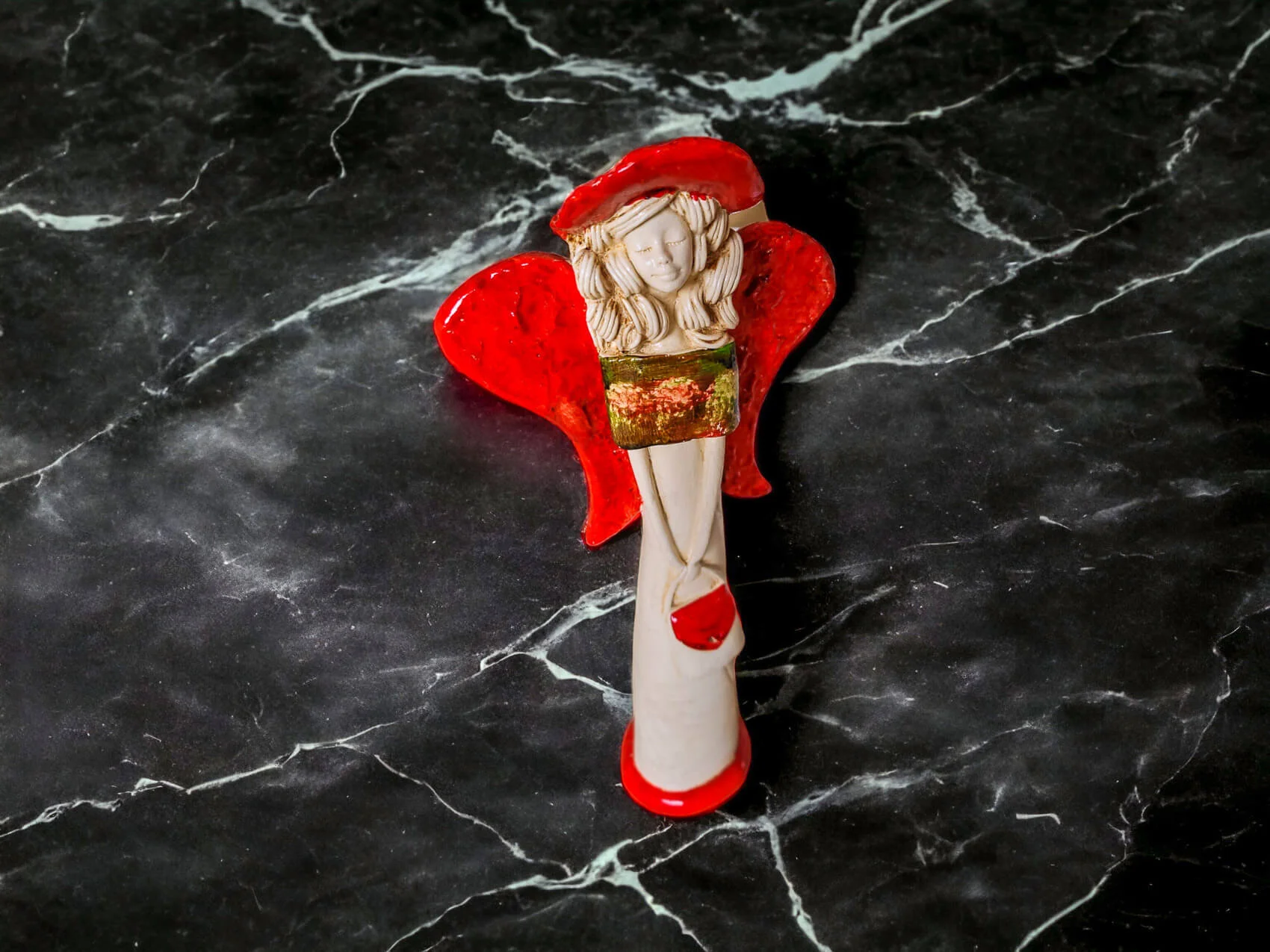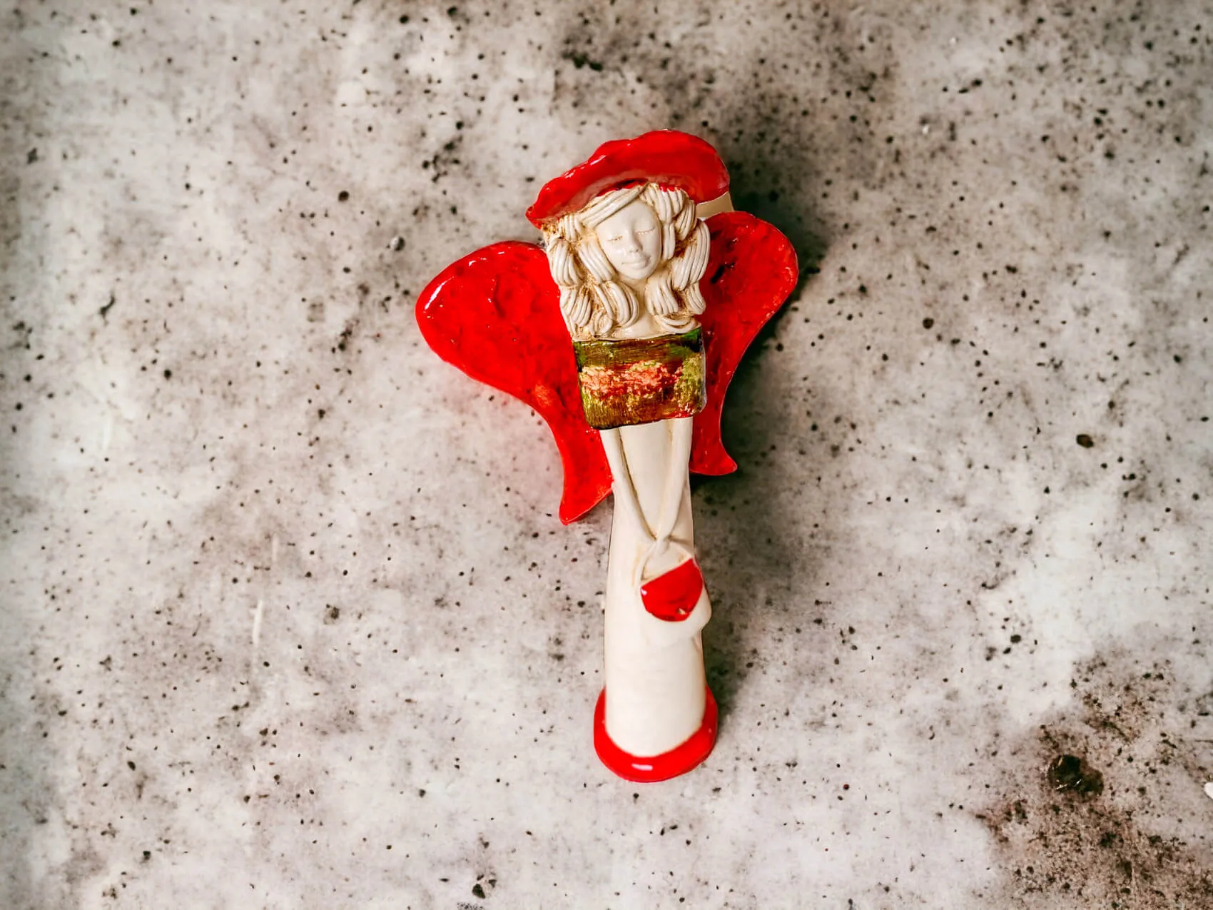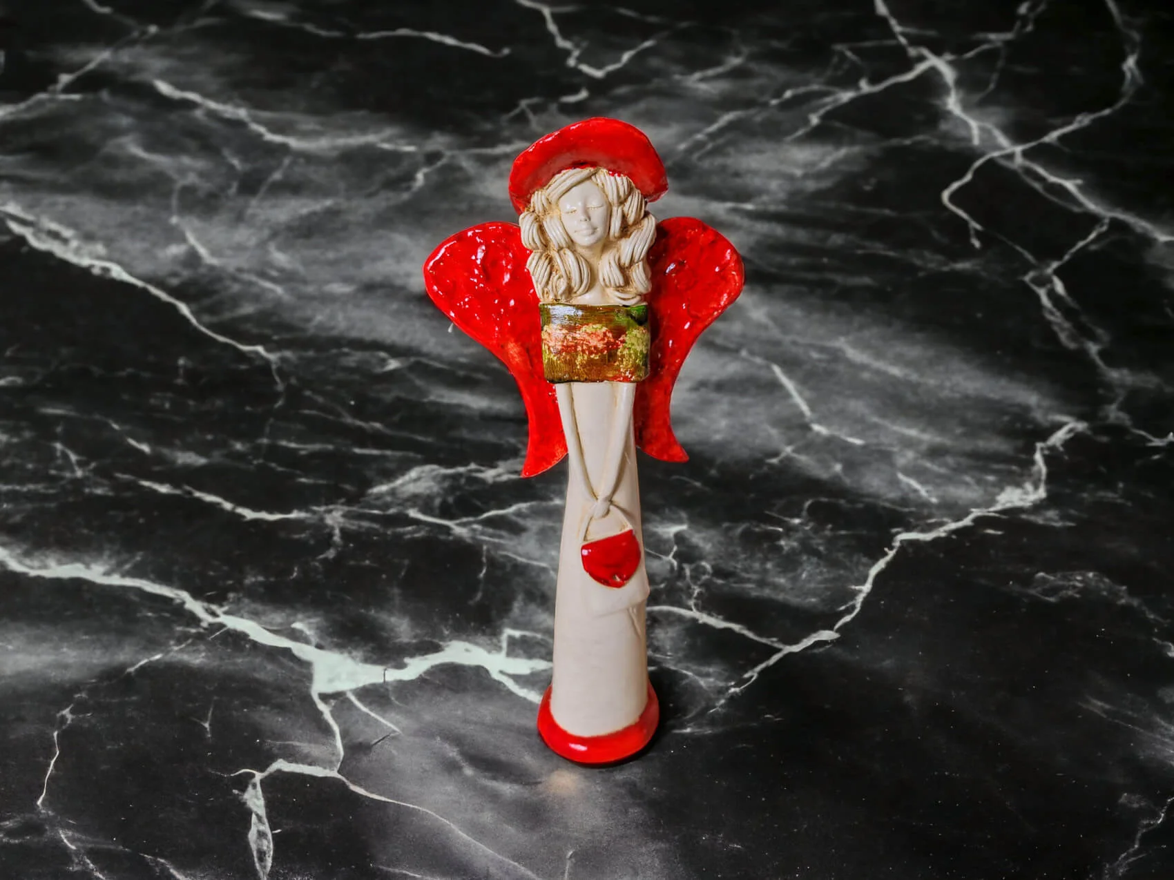 Anioł Coco w pomarańczowejkolorystyce. Coco ma cudowne rozłożyste skrzydła. Jej beżowy ubiór podkreślają zielone akcenty. Figurka Coco idealnie nadaje się na prezent na dziewczynki lub kobiety. Coco to piękna dekoracja wnosząca do wnętrza dużo ciepła i pozytywnej energii.