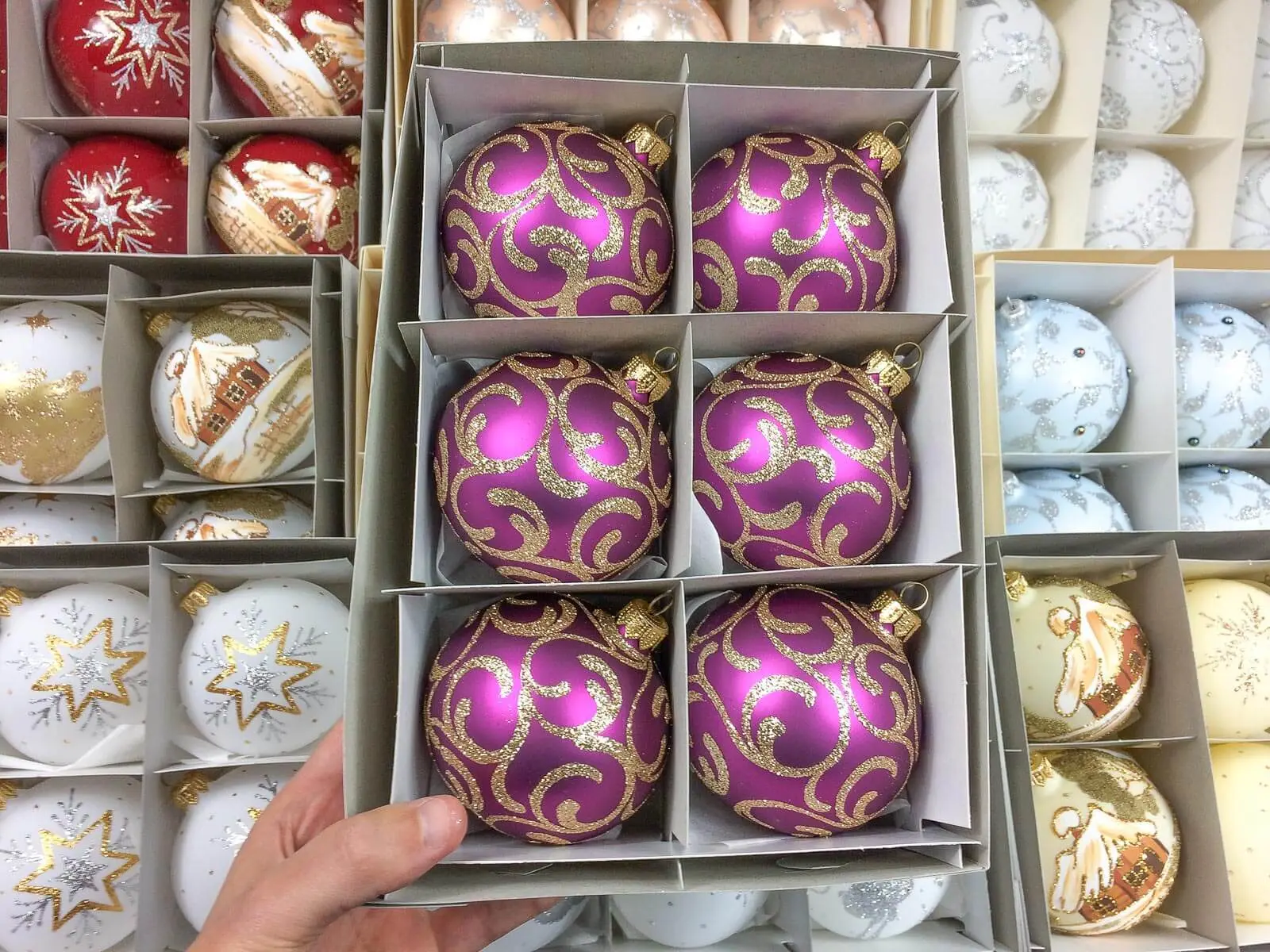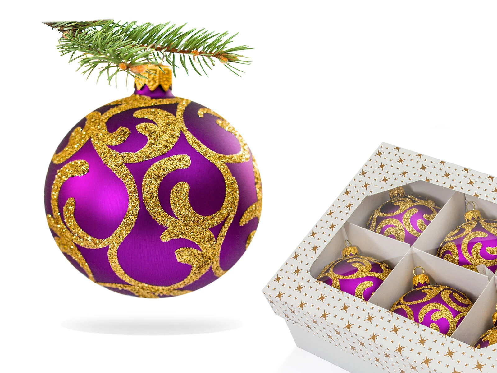 Zestaw zawiera 6 sztuk oryginalnych ozdób. Ponadto, bombki są malowane ręcznie. Ozdoby są utrzymane w energetyzujących barwach - połączenie złota i amarantu skutecznie przyciąga spojrzenia. Bombki będą ciekawym i wyróżniającym się na tle innych akcentem.