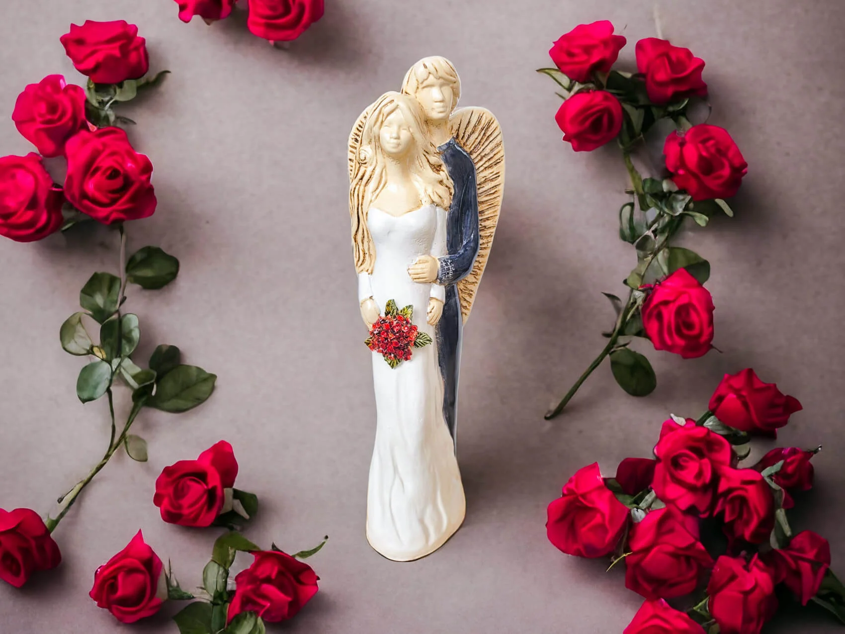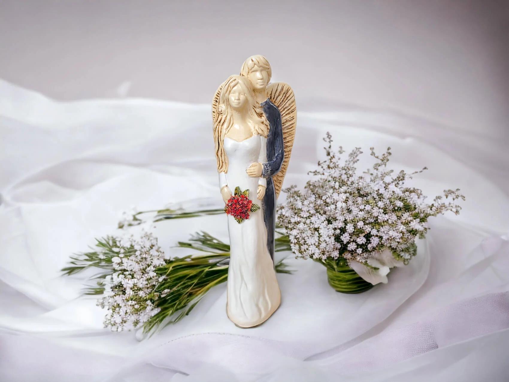 Ta figurka jest idealnym prezentem na ślub lub rocznicę ślubu, ponieważ symbolizuje ona siłę i trwałość związku małżeńskiego. Jej subtelna kolorystyka bieli i szarości dodaje elegancji i delikatności, co czyni ją piękną ozdobą dla każdego wnętrza.