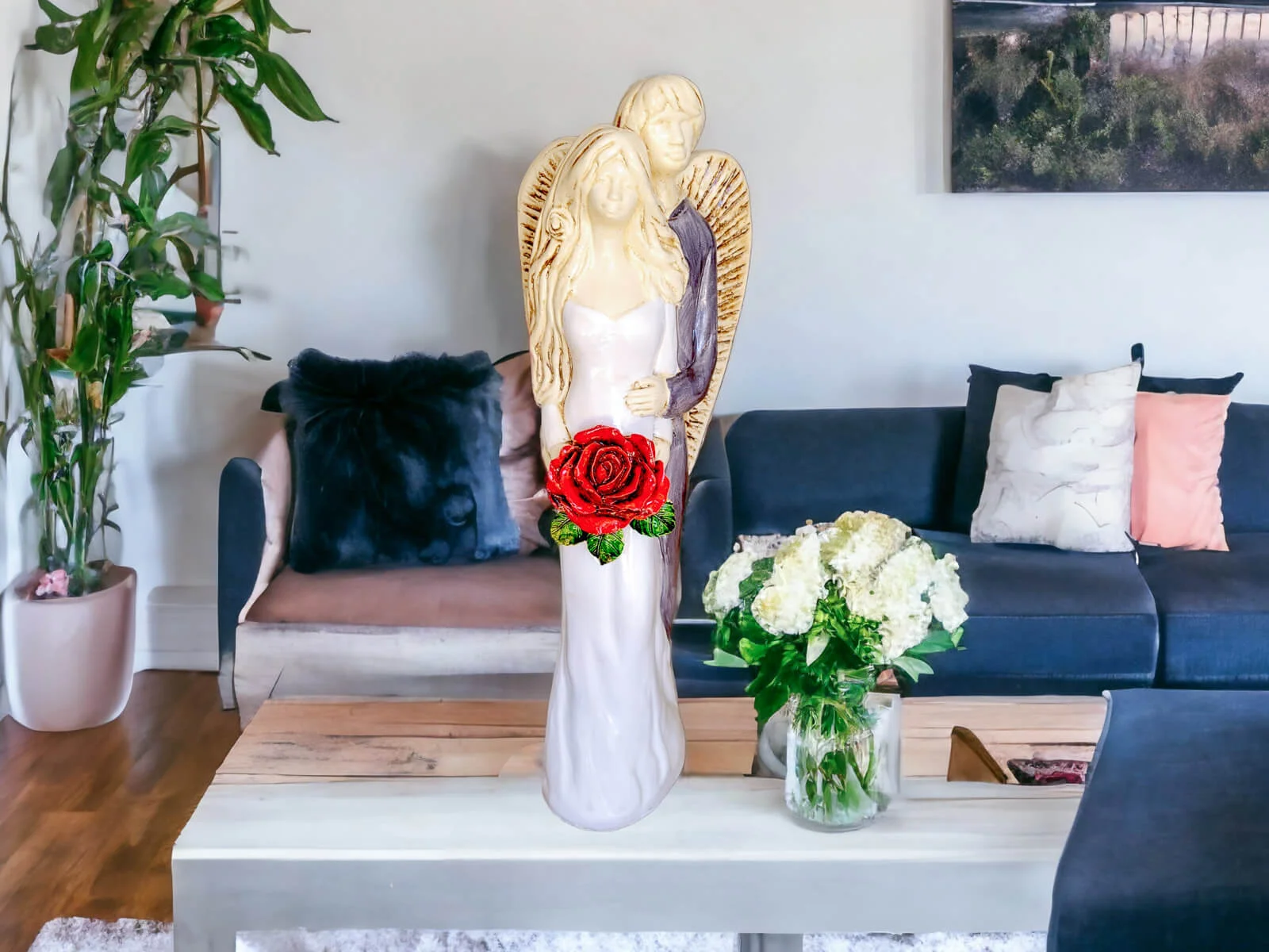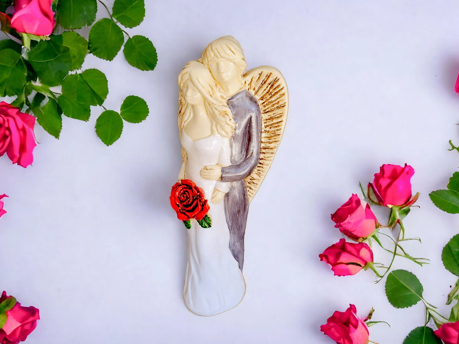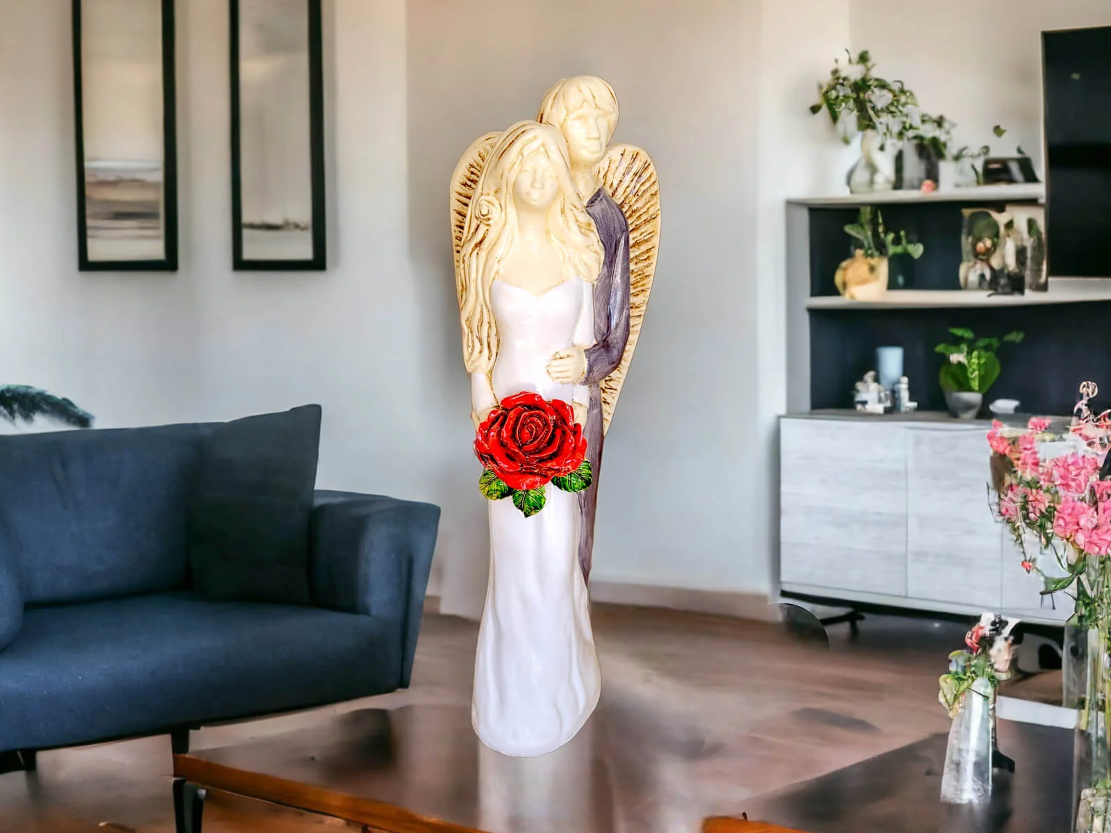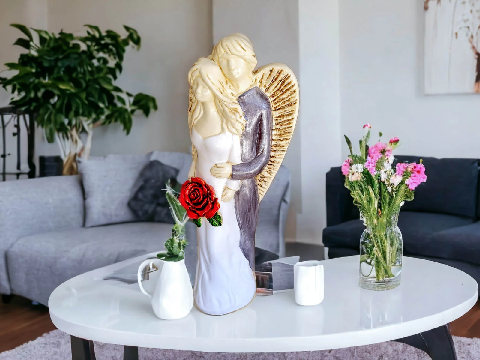 Miłujące Anioły w odcieniach bieli i szarości to para aniołów, które wzajemnie darzą się piękną, bezwarunkową miłością, trwając w serdecznych objęciach. Ich obecność stanowi symbol silnej więzi i zaufania, który doskonale oddaje istotę miłości i wspólnoty.