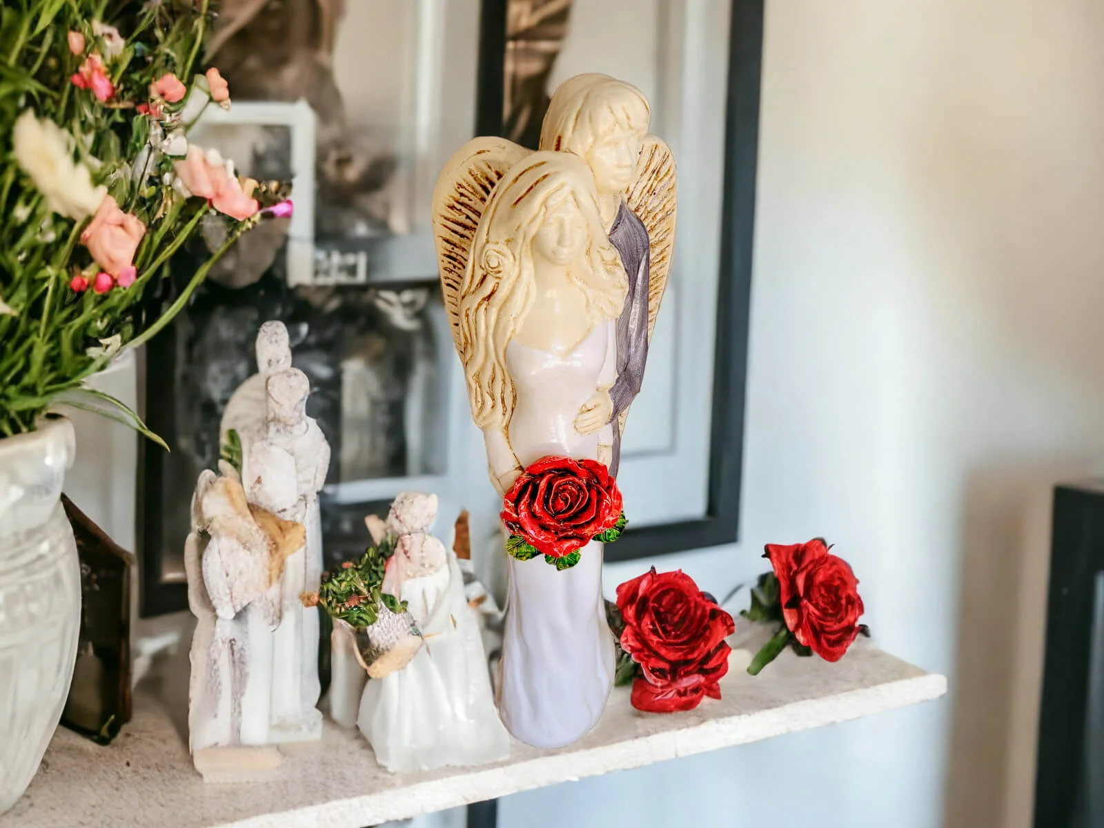 Miłujące Anioły - biało szare - 37 x 12 cm figurka dekoracyjna gipsowa +