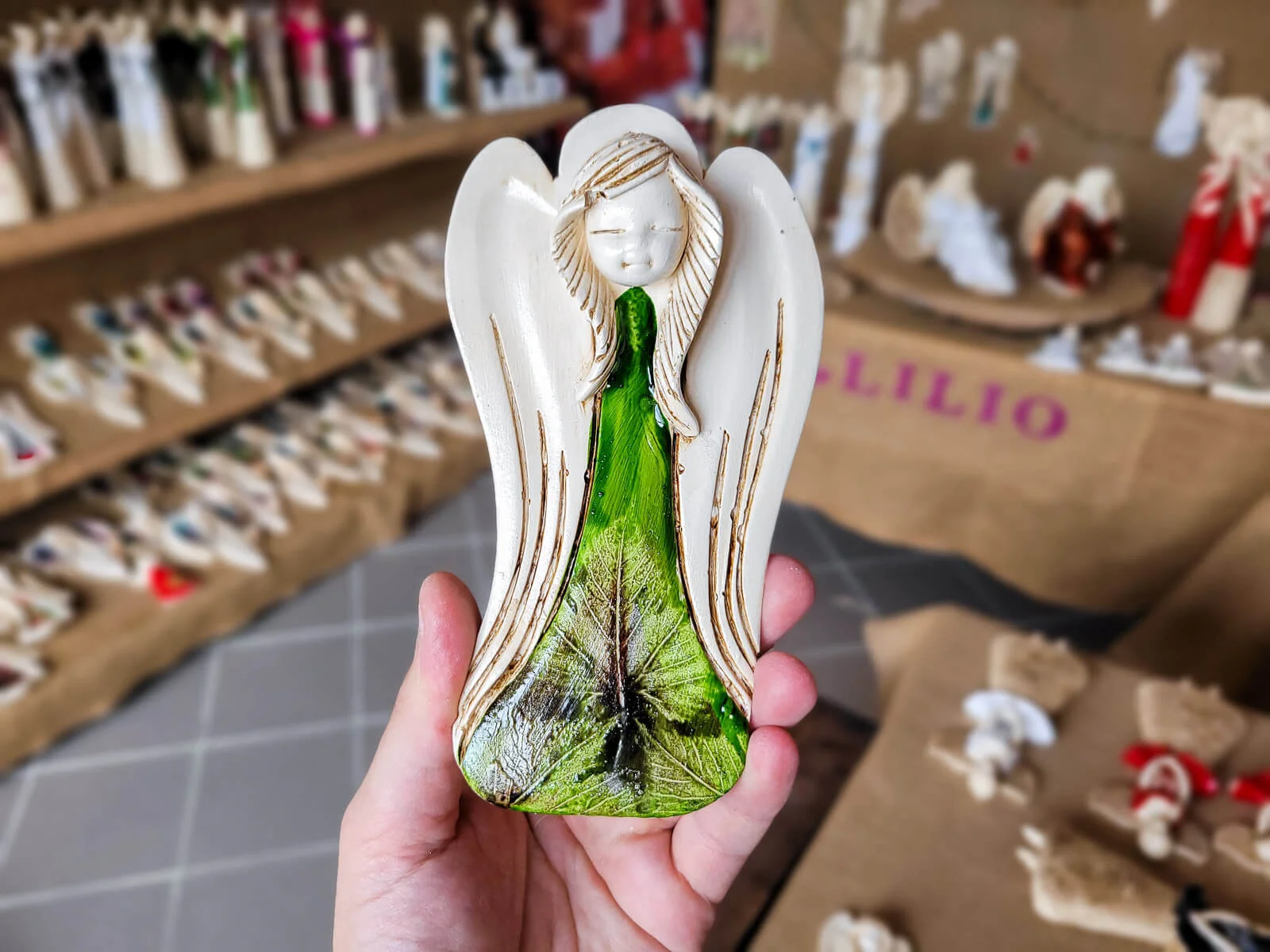 Ręcznie robiony aniołek Liolinka Lilionka z wzorami liści. Unikalna kolekcja Art Leaf.