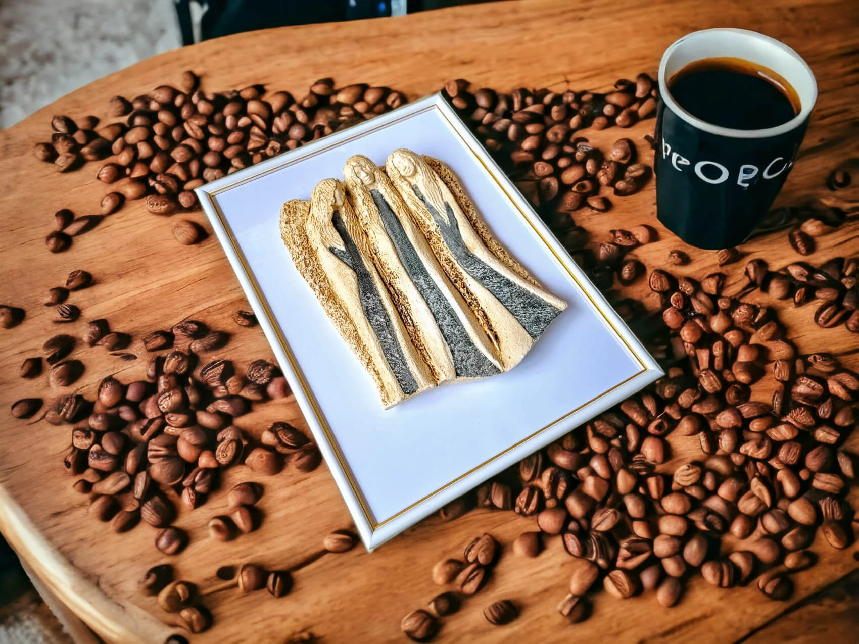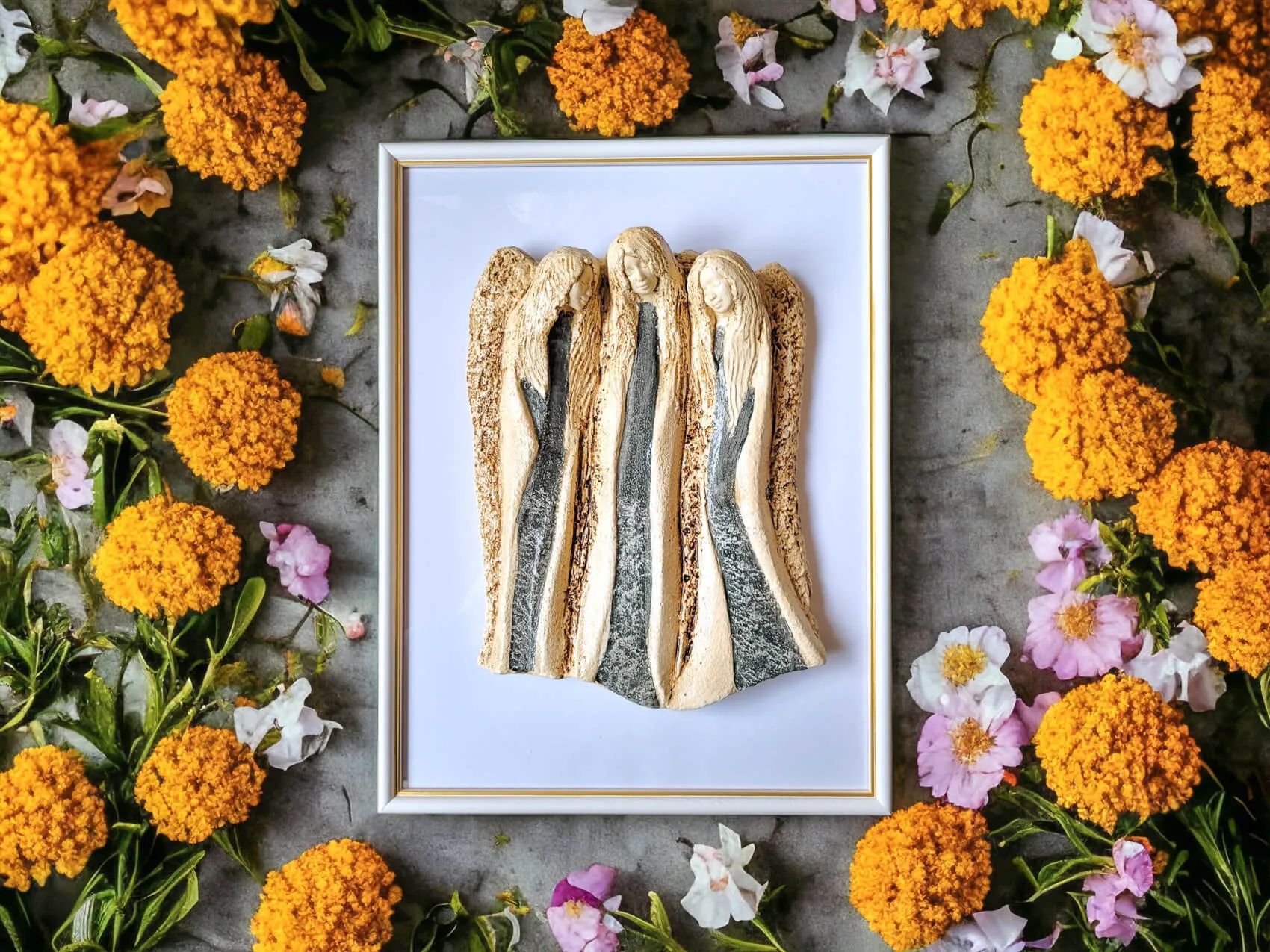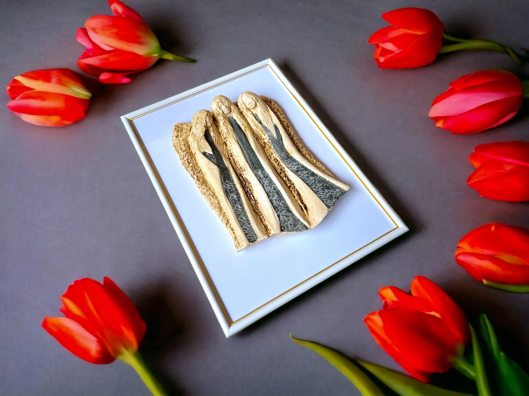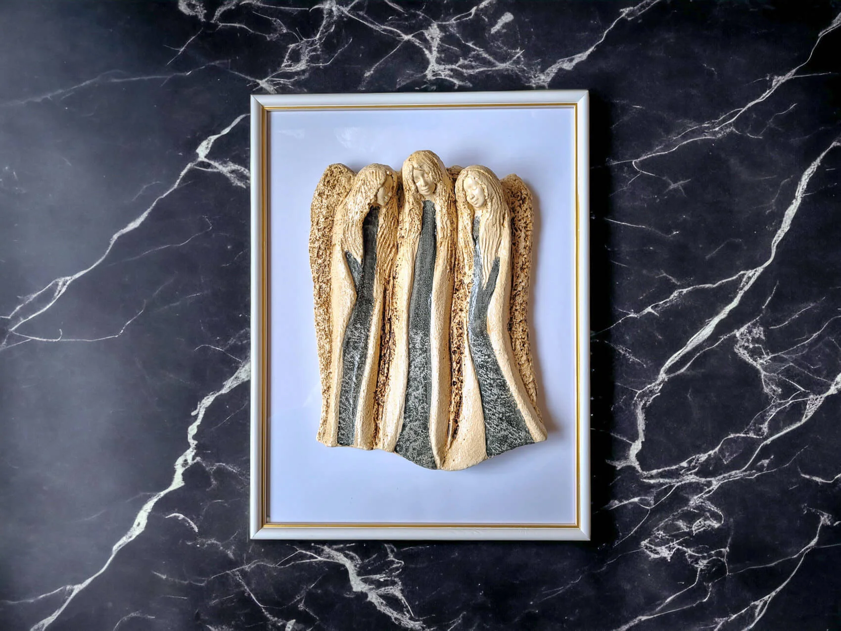 Anioły Wiara, Nadzieja i Miłość w odcieniach szarości umieszczone na eleganckiej ramce to wyjątkowe symbole wiary, nadziei i miłości, które niosą przesłanie o wierze w lepsze jutro oraz nadziei na zmianę. Ich subtelne odcienie szarości symbolizują spokój, równowagę i wytrwałość w obliczu trudności.