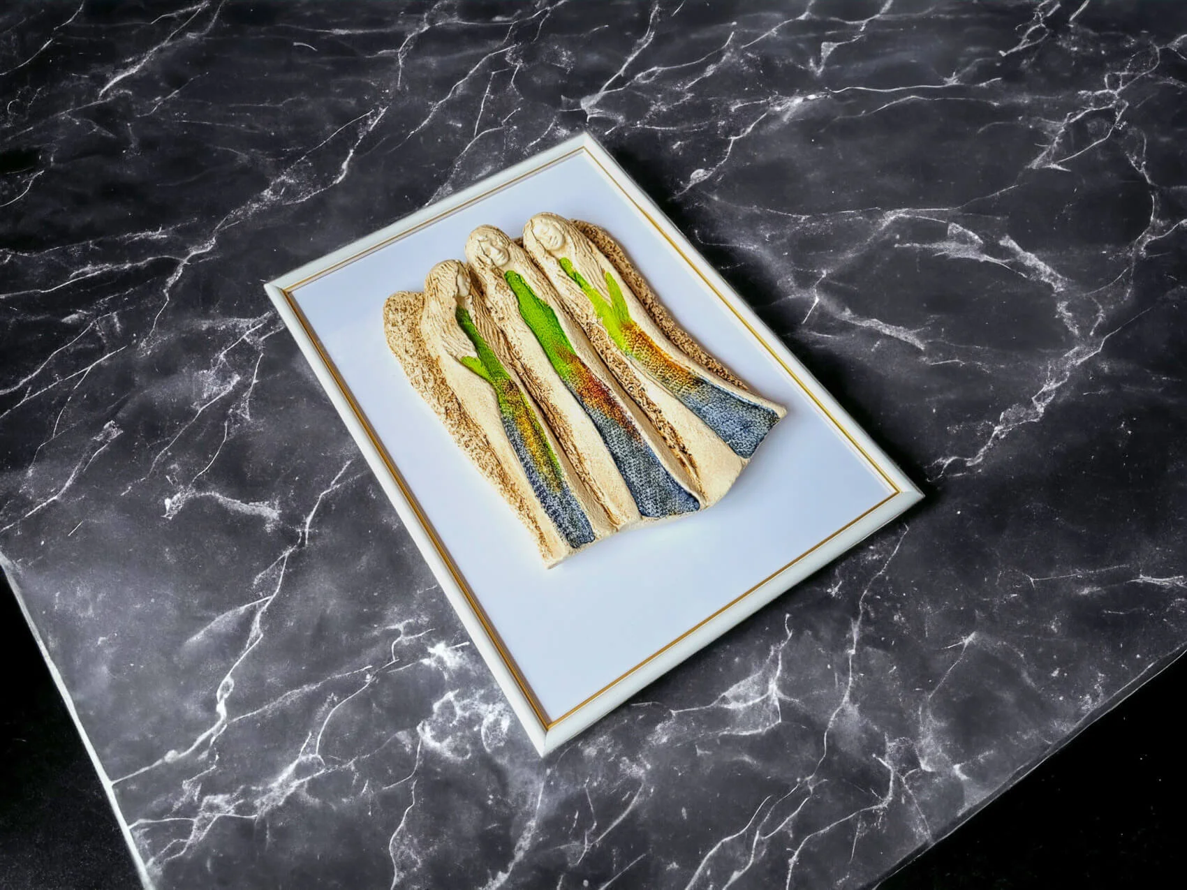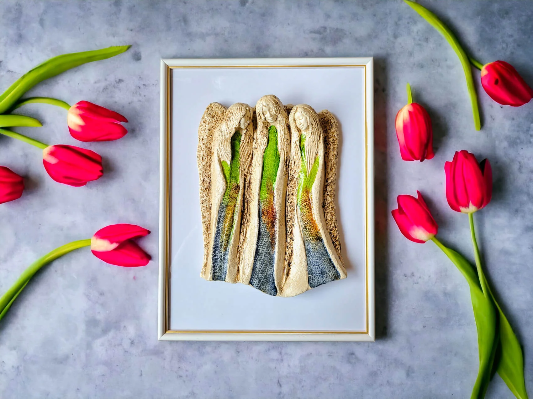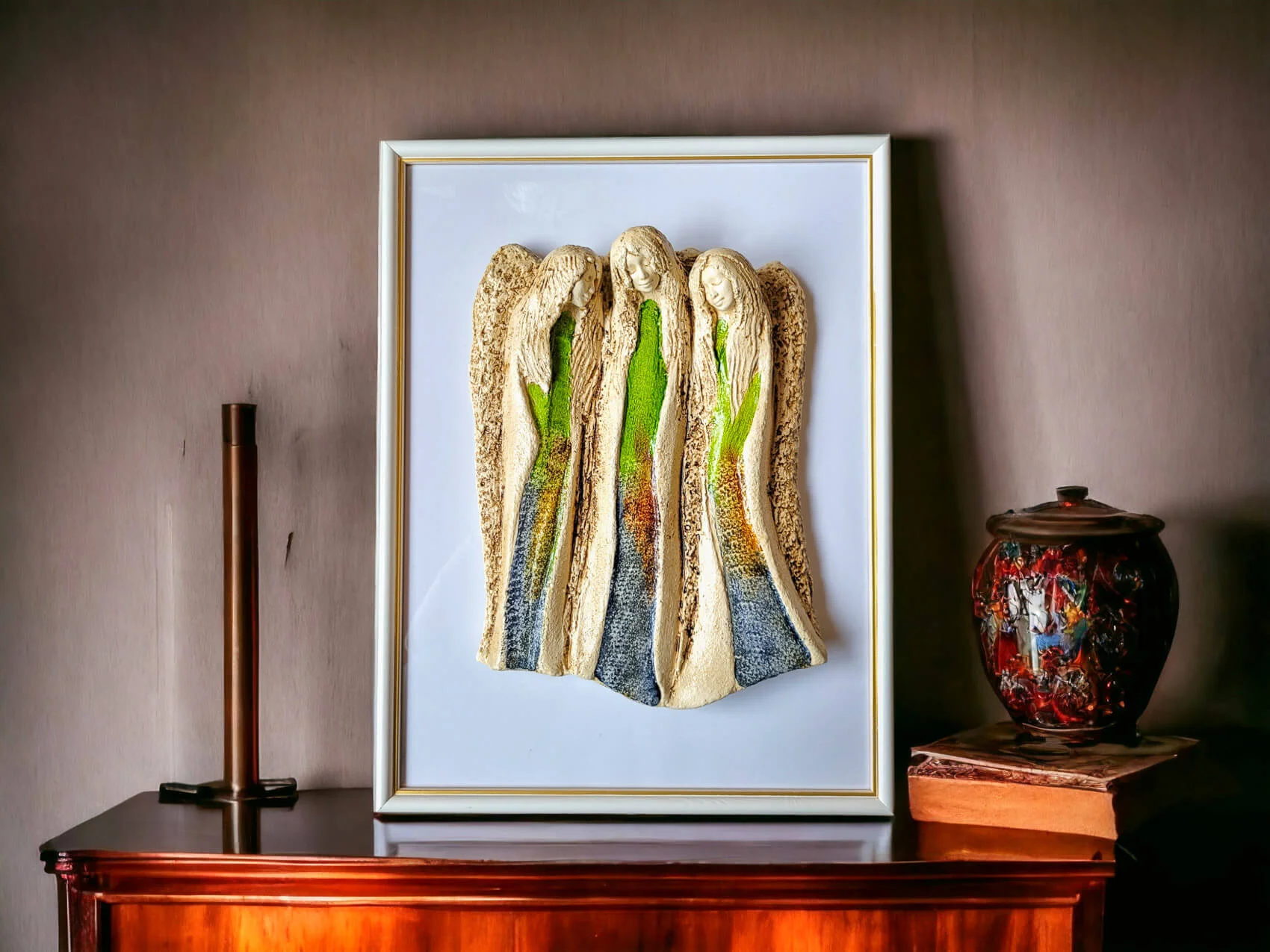 Anioły Wiara Nadzieja Miłość w żywych kolorach zielonego i granatowego na eleganckiej ramce. Idealne na prezent na każdą okazję. Anioły przynoszą wiarę że będzie lepiej oraz nadzieję na zmianę, ku dobremu. Anioły również wnoszą do życia miłość, której nigdy nie ma za dużo. To nasze ulubione anioły, które zawsze wybieramy kiedy chcemy wesprzeć licytację charytatywną.