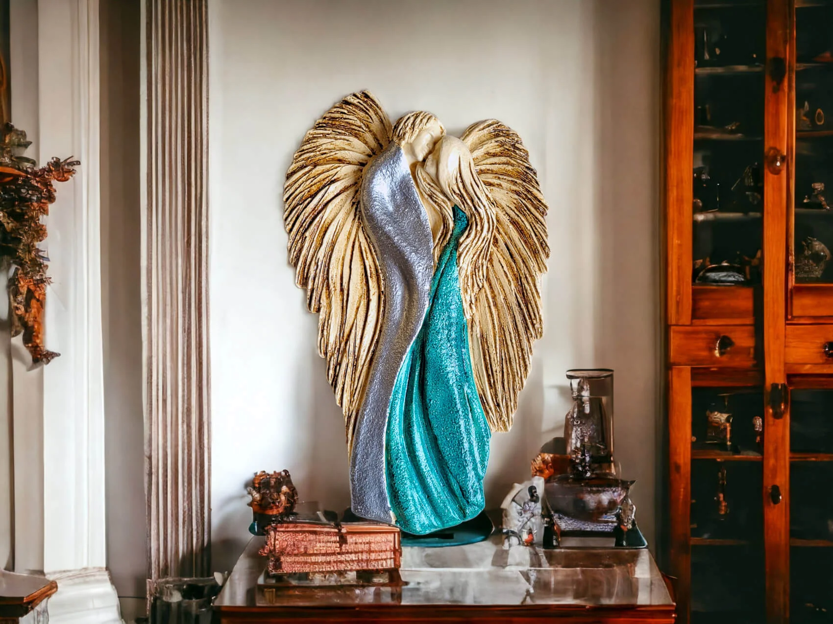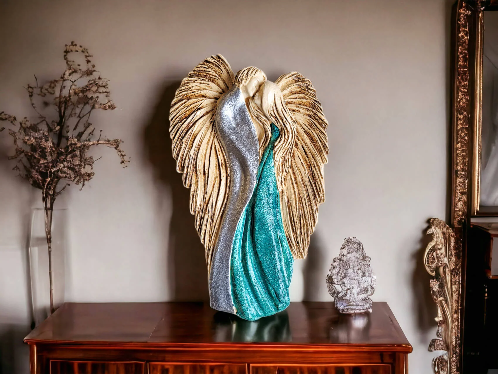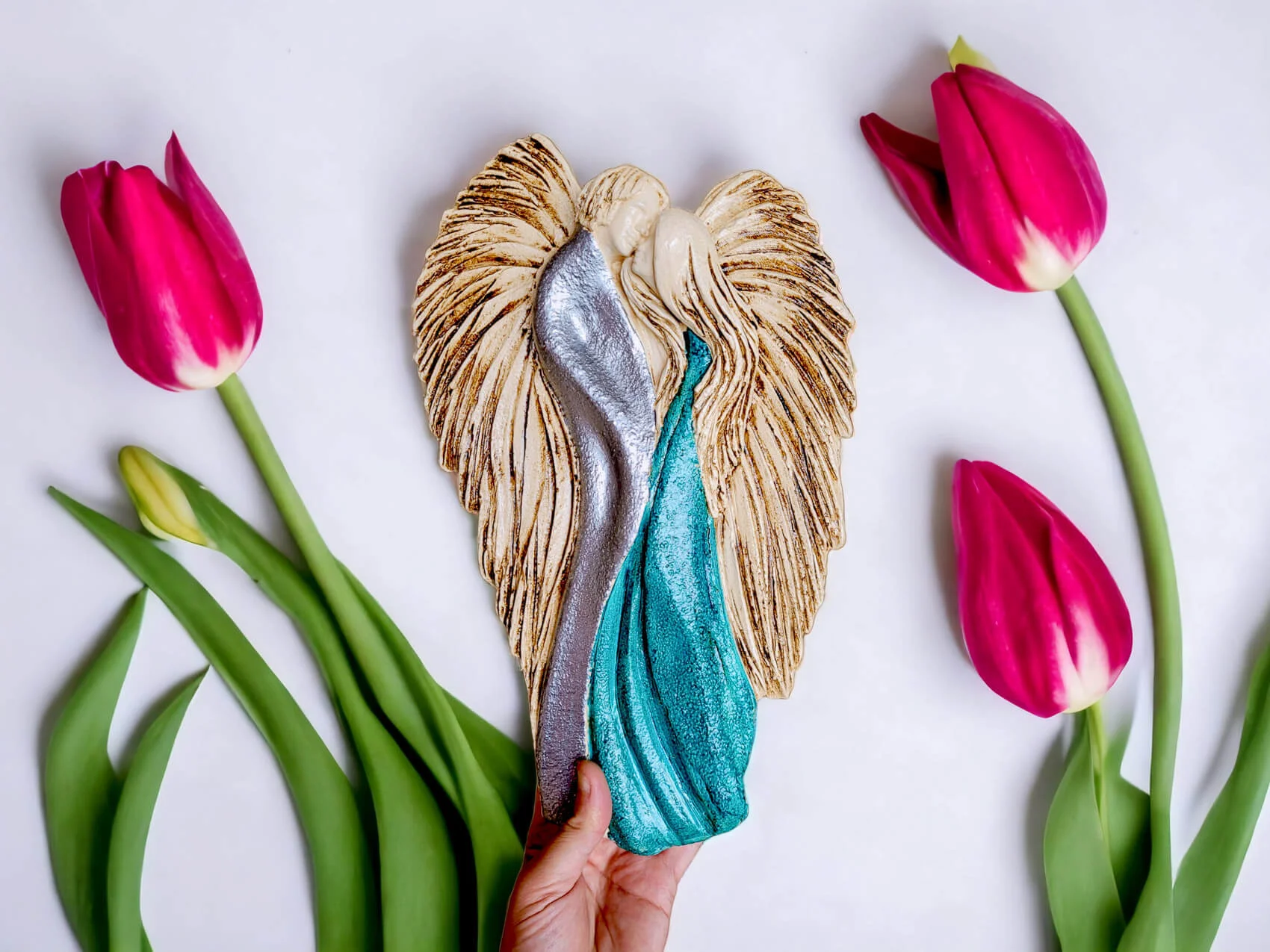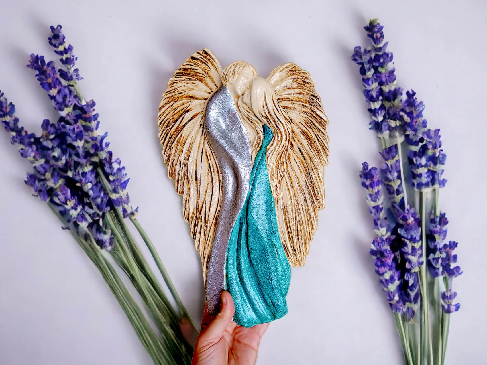 Ręcznie robione i malowane figurki zakochanych aniołów w wersji srebrno-turkusowej stanowią wyjątkowy symbol miłości, splątanej w uścisku pełnym czułości. Ich delikatne detale i wyjątkowy design nawiązują do symbolu energetycznej harmonii - Yin Yang, co podkreśla równowagę i zgodę w relacji między kochającymi się osobami.
