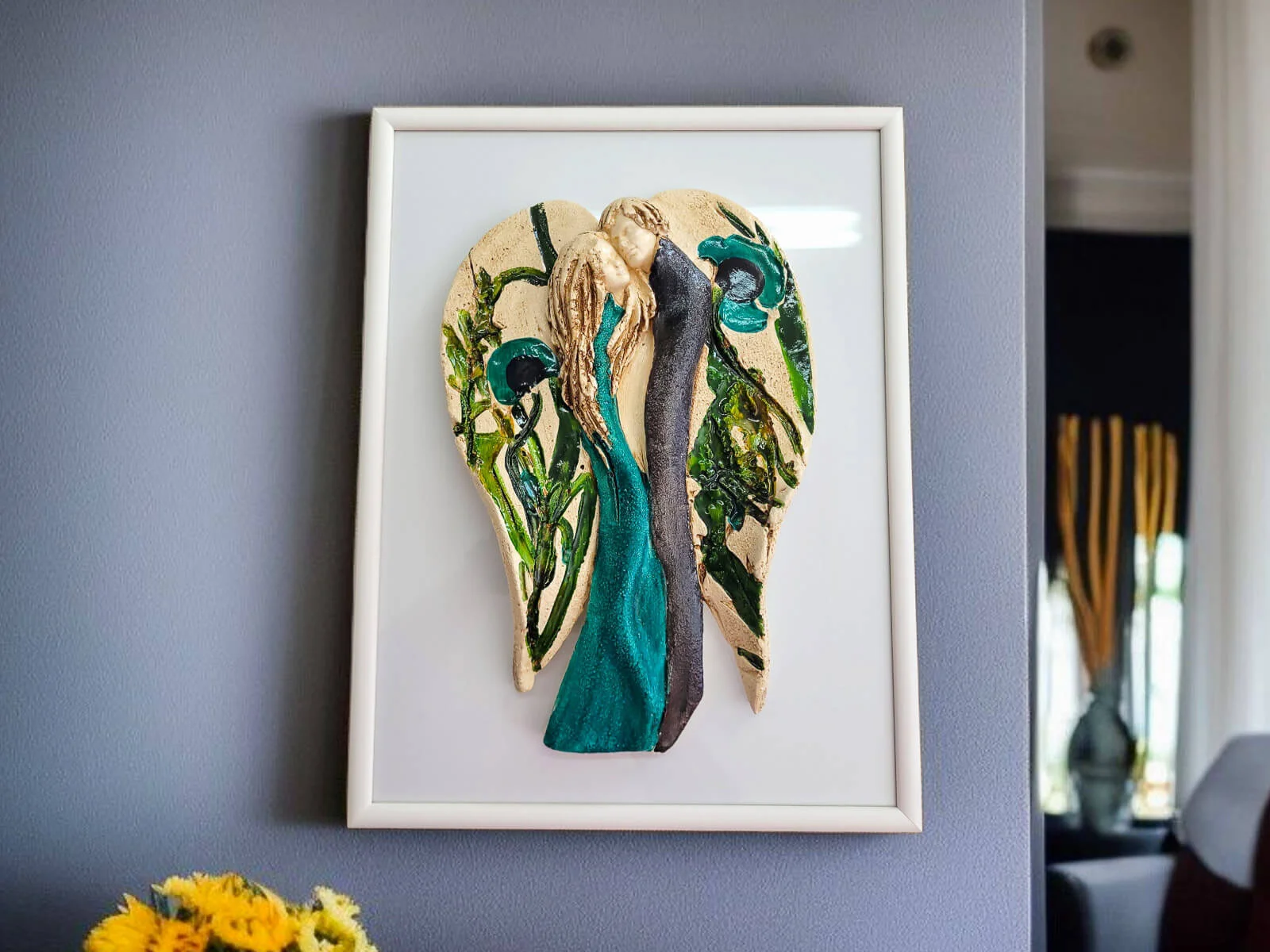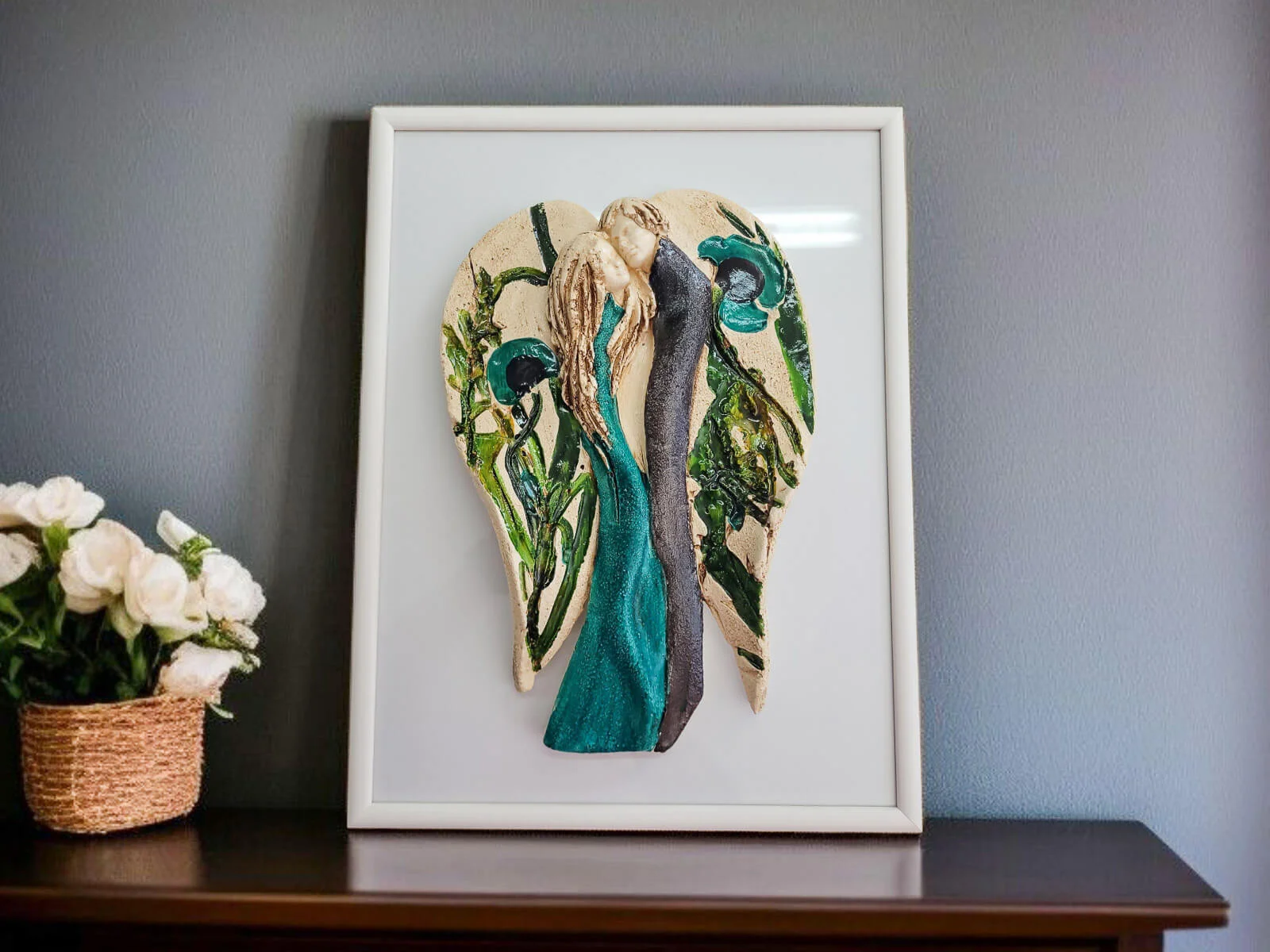 Ręcznie robione i malowane figurka Kochających Aniołów w wersji turkusowo beżowej z kolorowymi makami w komplecie z elegancką ramką. Idealne na prezent na ślub lub rocznicę ślubu. Anioły symbolizują wielką miłość, splecione w miłosnym uścisku. Figurka nawiązuje do symbolu energetycznej harmonii - Yin Yang. Idealna na prezent na ślub lub rocznicę ślubu, dla kochającej pary. Pięknie prezentuje się na ścianie w salonie czy sypialni. Klienci twierdzą, że w rzeczywistości wygląda lepiej niż na zdjęciach. Tutaj przeczytasz więcej o harmonii Yin Yang.