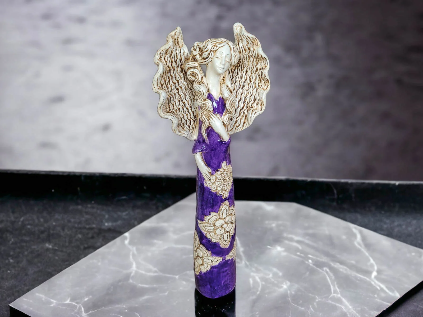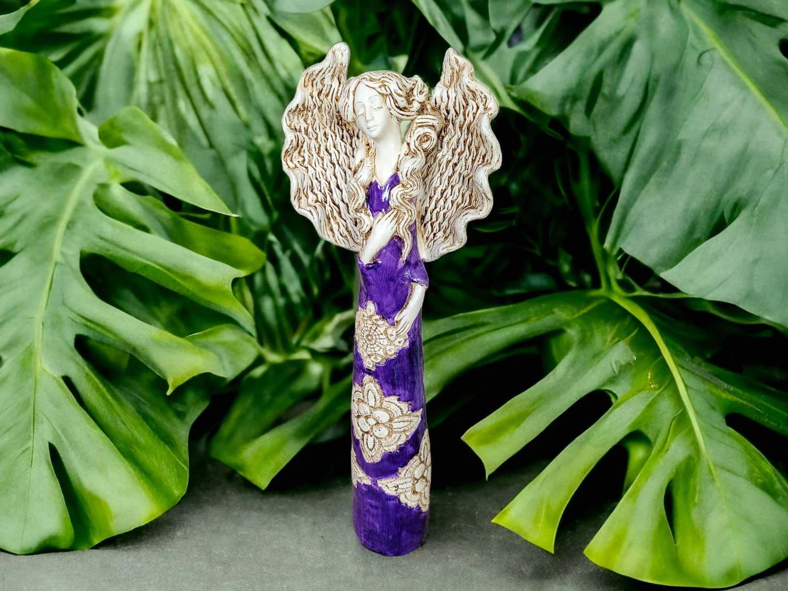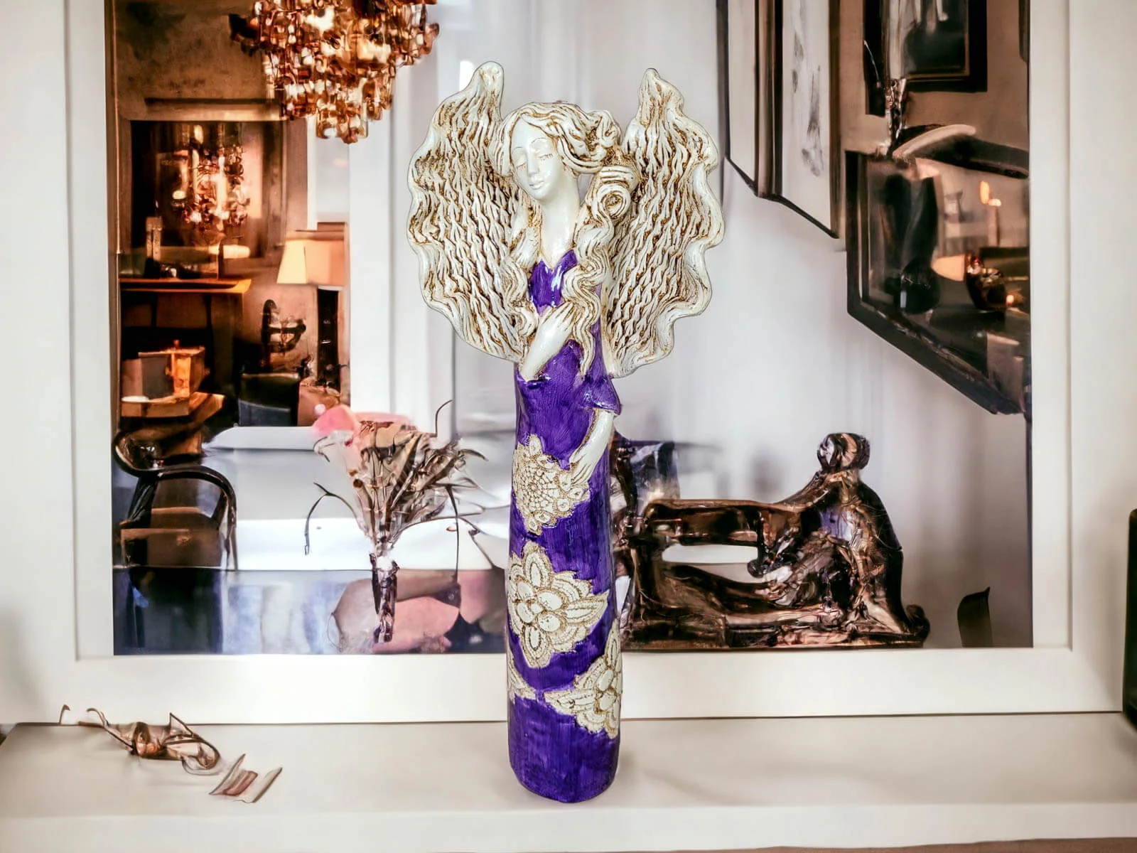 Anioł Madelyn w fioletowej sukni przedstawia kobietę z długimi kręconymi włosami ubraną w jesienne kolory. Ma duże skrzydła skierowane ku górze oraz prawą dłoń na piersi. Jest figurką stojącą, wykonaną ręcznie z gipsu. Nadaje się na ozdobę do salonu ale też doskonale będzie czuć się w sypialni. Może służyć jako prezent na Dzień Kobiet, Walentynki, a także na Dzień Mamy i Dzień Babci.