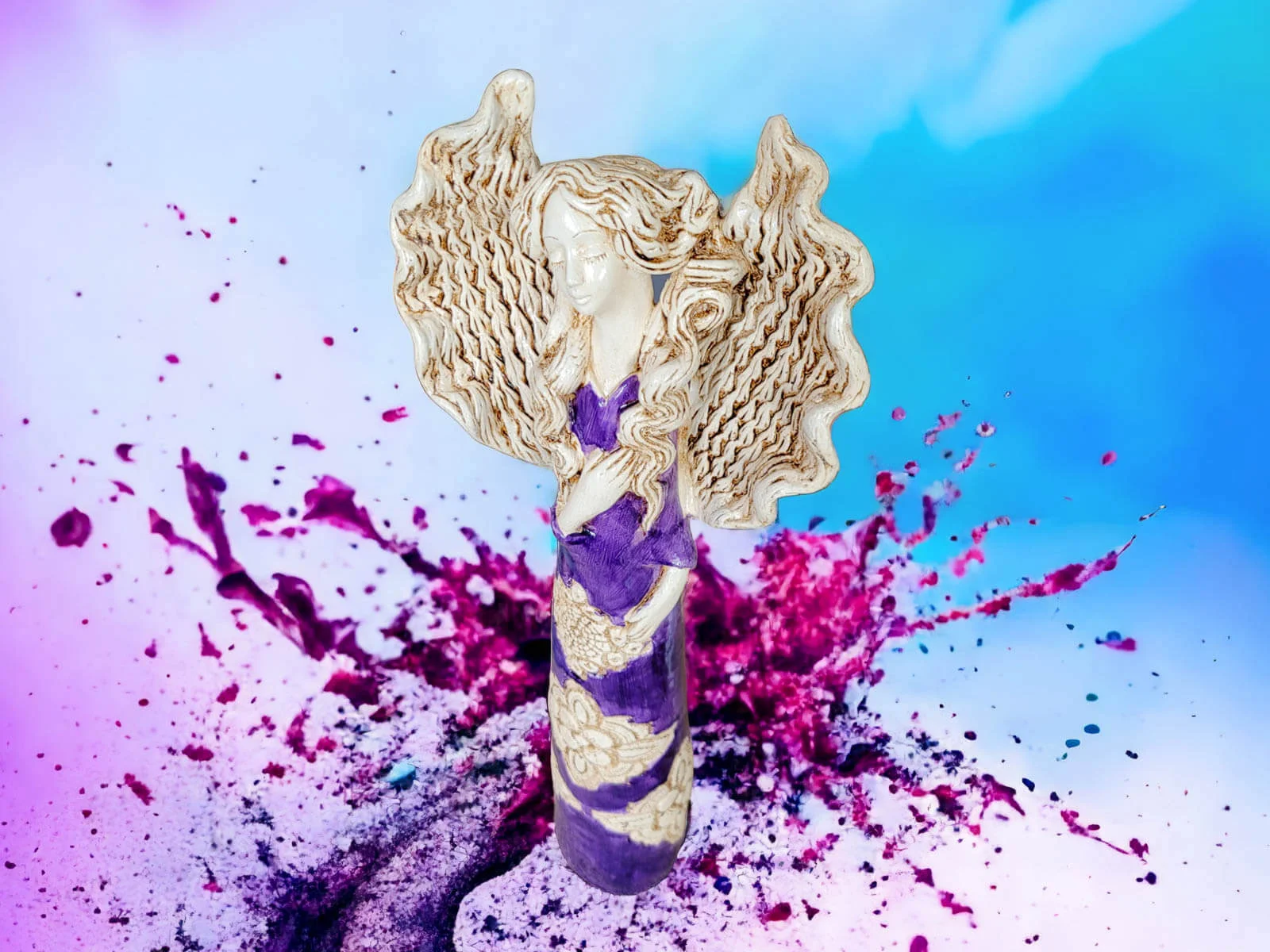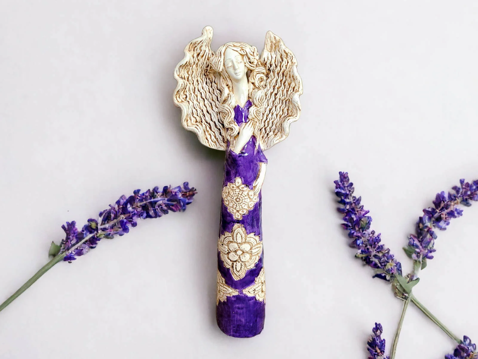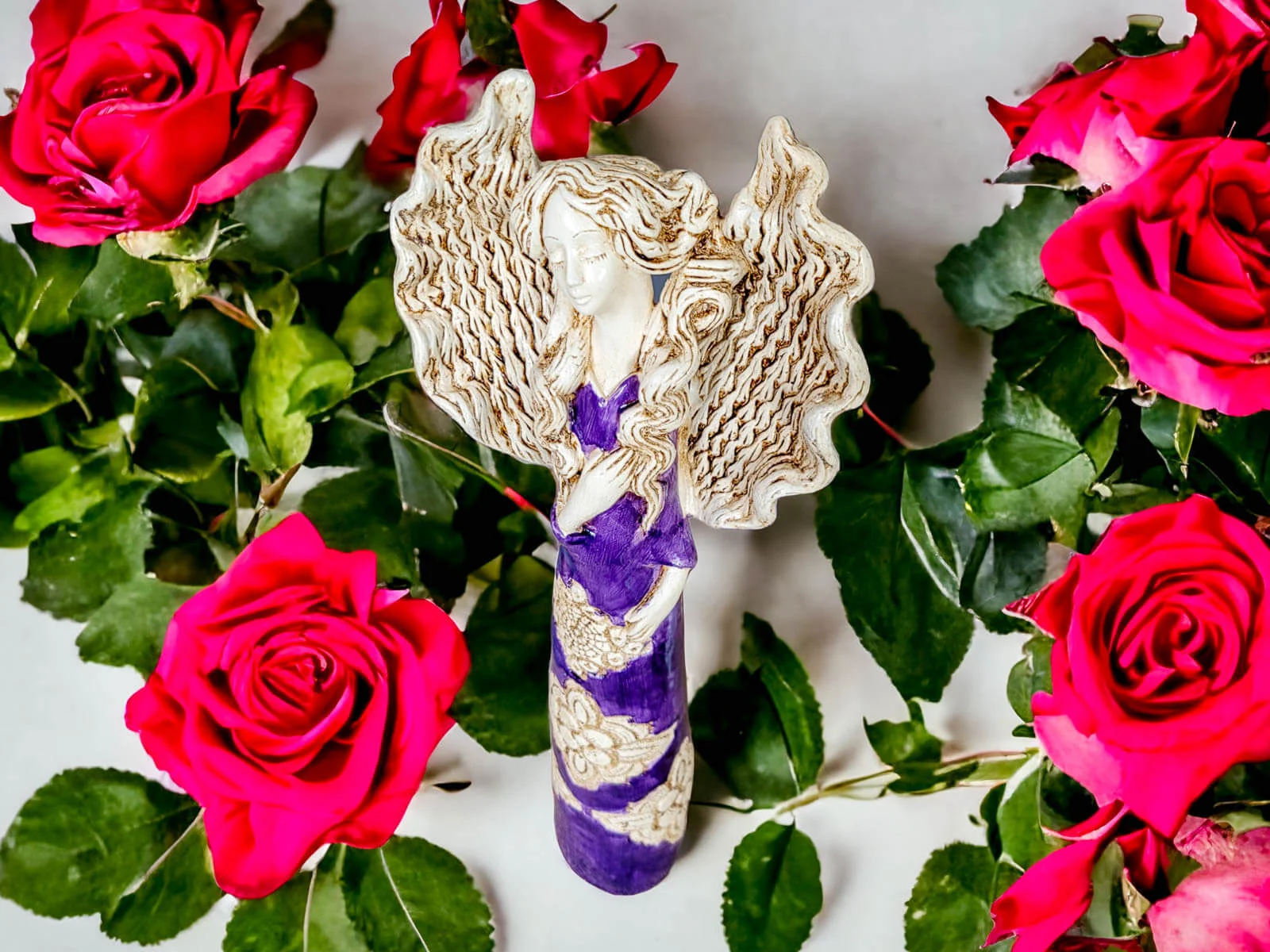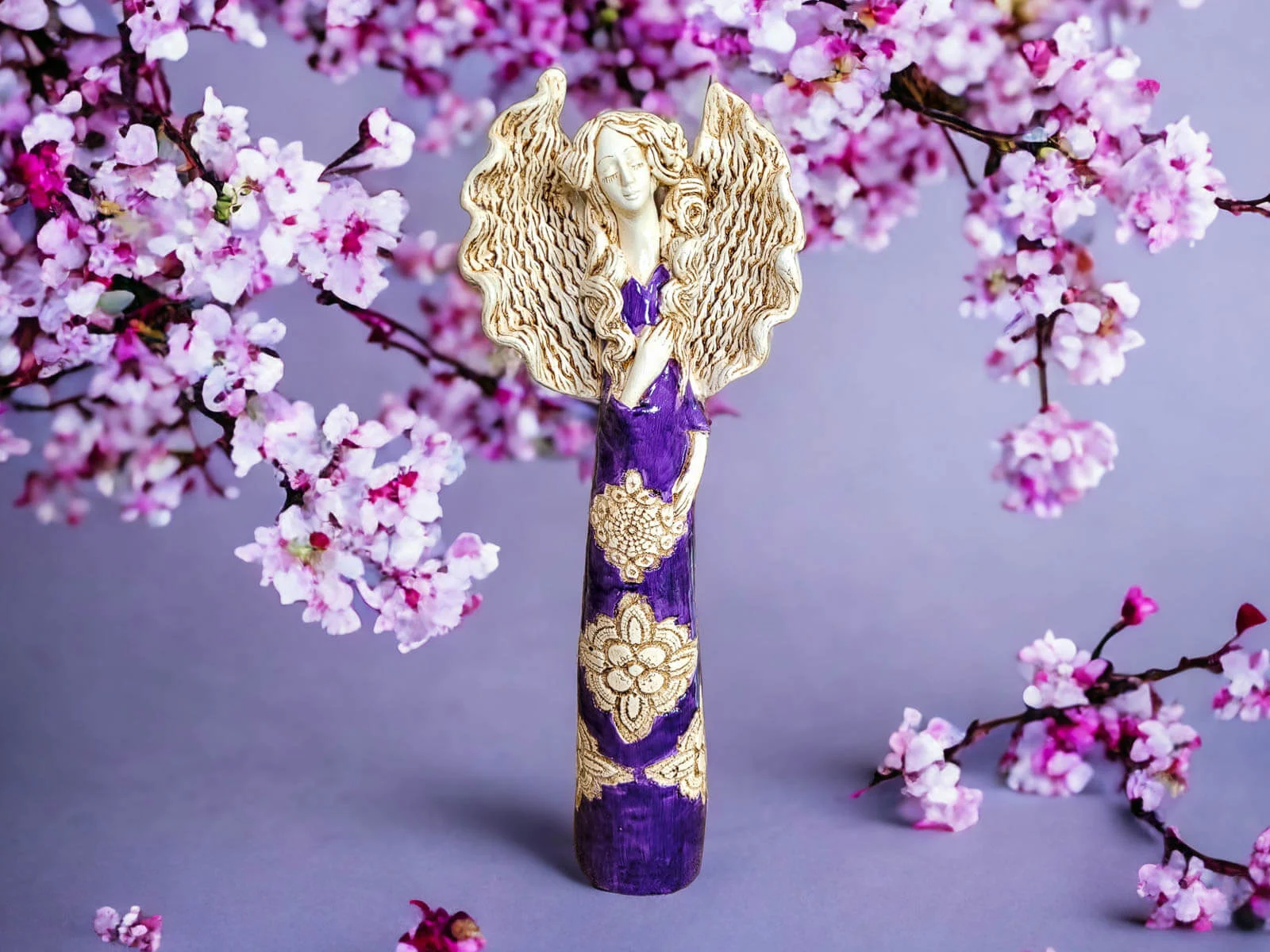 Anioł Madelyn w fioletowej sukni przedstawia kobietę z długimi kręconymi włosami ubraną w jesienne kolory. Ma duże skrzydła skierowane ku górze oraz prawą dłoń na piersi. Jest figurką stojącą, wykonaną ręcznie z gipsu. Nadaje się na ozdobę do salonu ale też doskonale będzie czuć się w sypialni. Może służyć jako prezent na Dzień Kobiet, Walentynki, a także na Dzień Mamy i Dzień Babci.