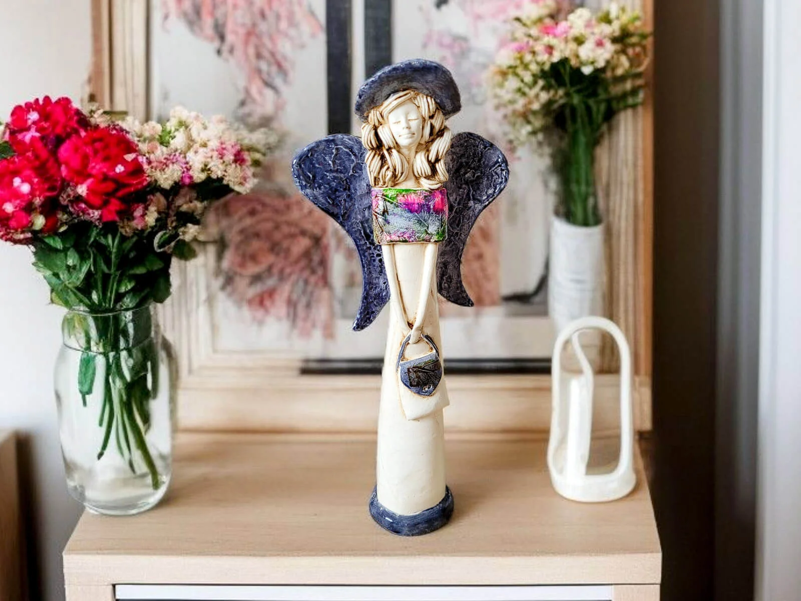 Anioł Coco w unikalnej kolekcji Art Leaf. Coco to ręcznie wykonana figurka gipsowa w kształcie filigranowej dziewczynki. Ma cudowne rozłożyste skrzydła. Jej beżowy ubiór podkreślają kolorowe akcenty z wzorami liści. Figurka Coco idealnie nadaje się na prezent na dziewczynki lub kobiety jak piękna ozdoba wnosząca do wnętrza dużo pozytywnej energii.