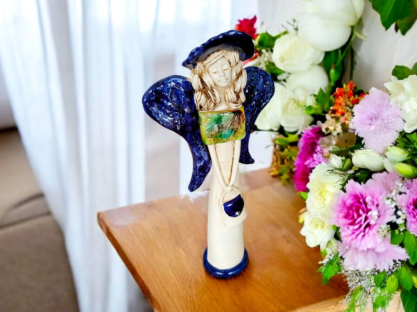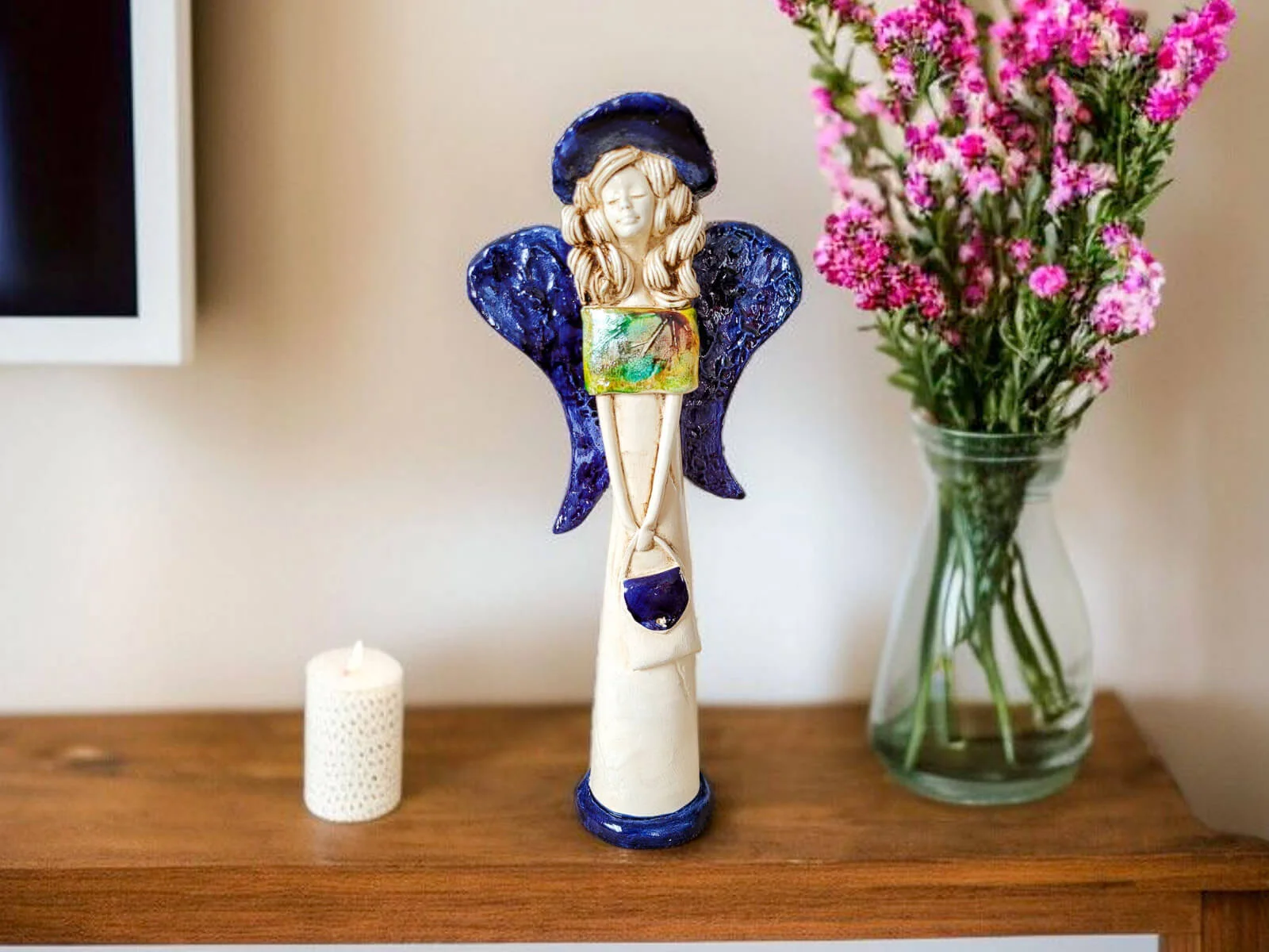 Anioł Coco w unikalnej kolekcji Art Leaf. Coco to ręcznie wykonana figurka gipsowa w kształcie filigranowej dziewczynki. Ma cudowne rozłożyste skrzydła. Jej beżowy ubiór podkreślają kolorowe akcenty z wzorami liści. Figurka Coco idealnie nadaje się na prezent na dziewczynki lub kobiety jak piękna ozdoba wnosząca do wnętrza dużo pozytywnej energii.
