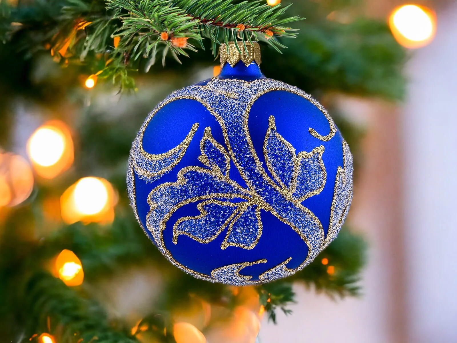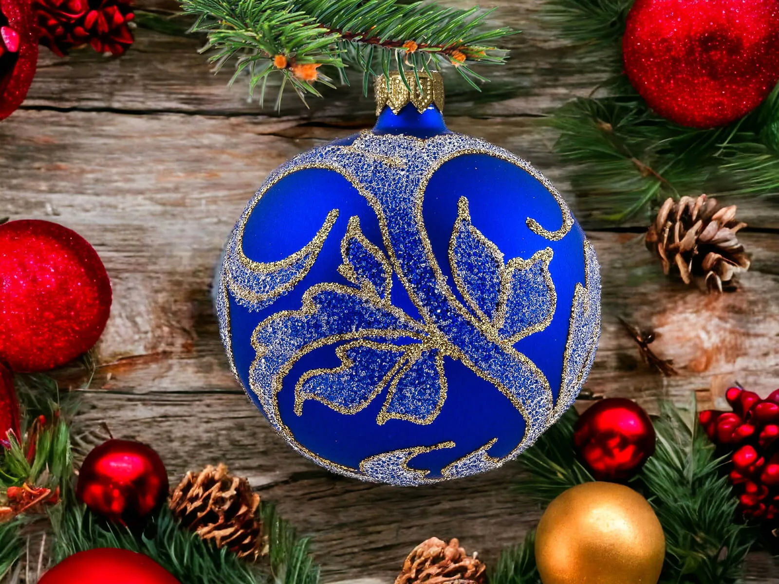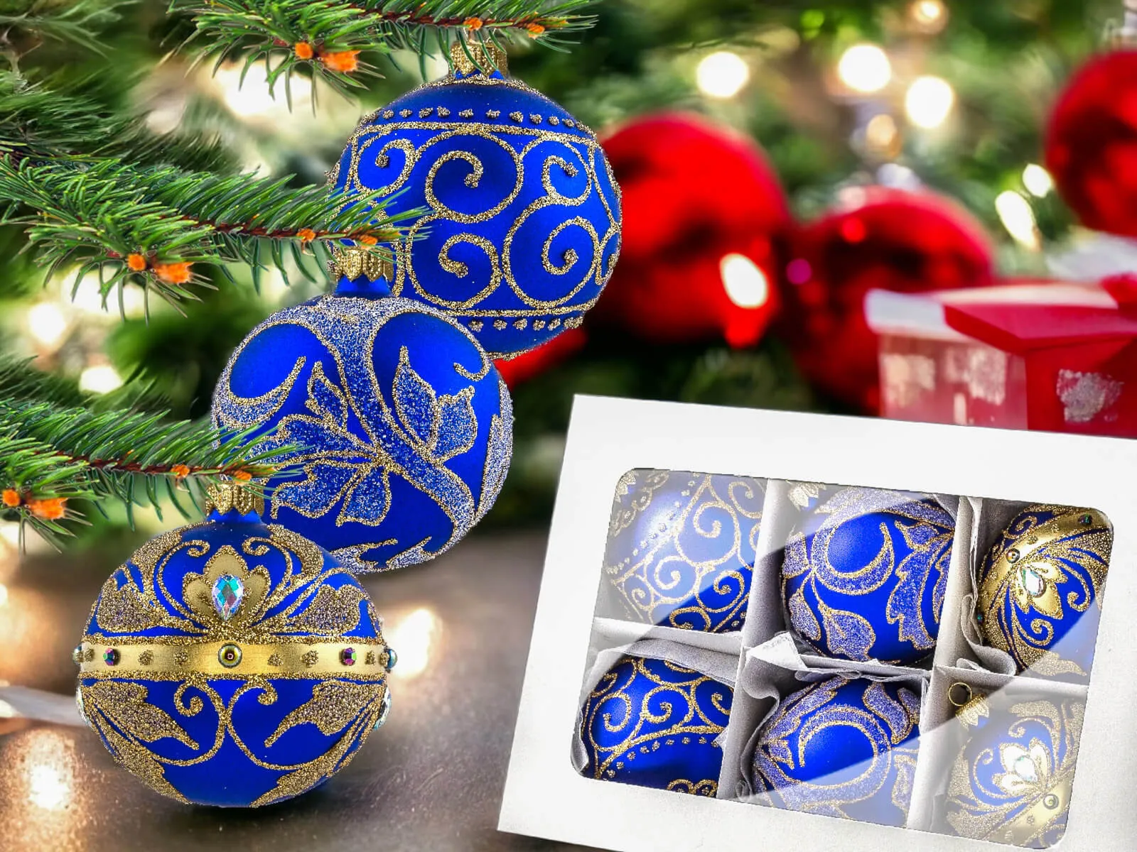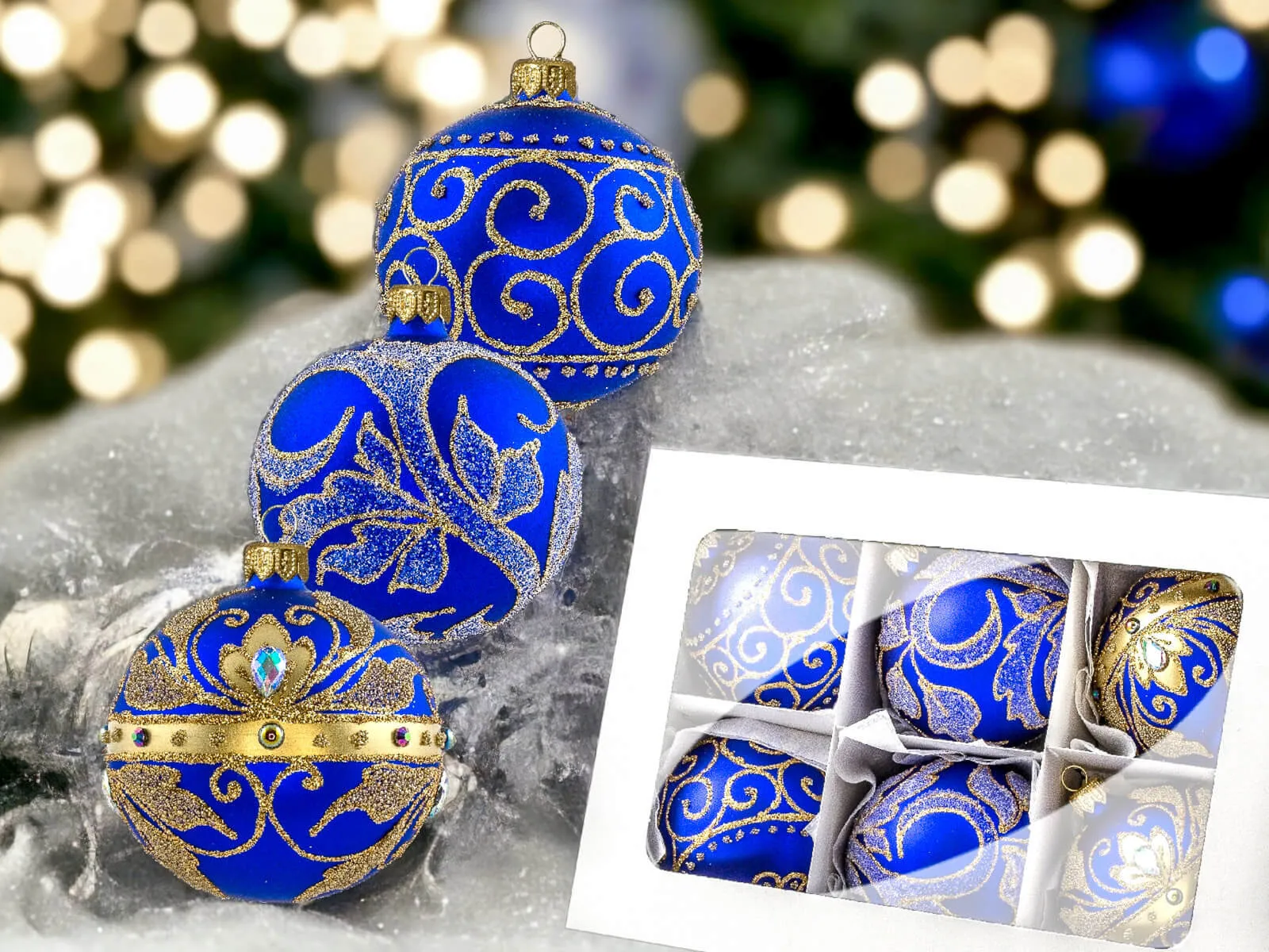 Szafirowy podkład bombek stanowi tło dla bogatych złotych zdobień, które zdobią każdą z nich. Złote detale, precyzyjnie nanoszone ręcznie, nadają bombkom wyrafinowanego charakteru, tworząc efektowny zestaw, który z pewnością przyciągnie uwagę i stworzy wyjątkowy klimat świąt.