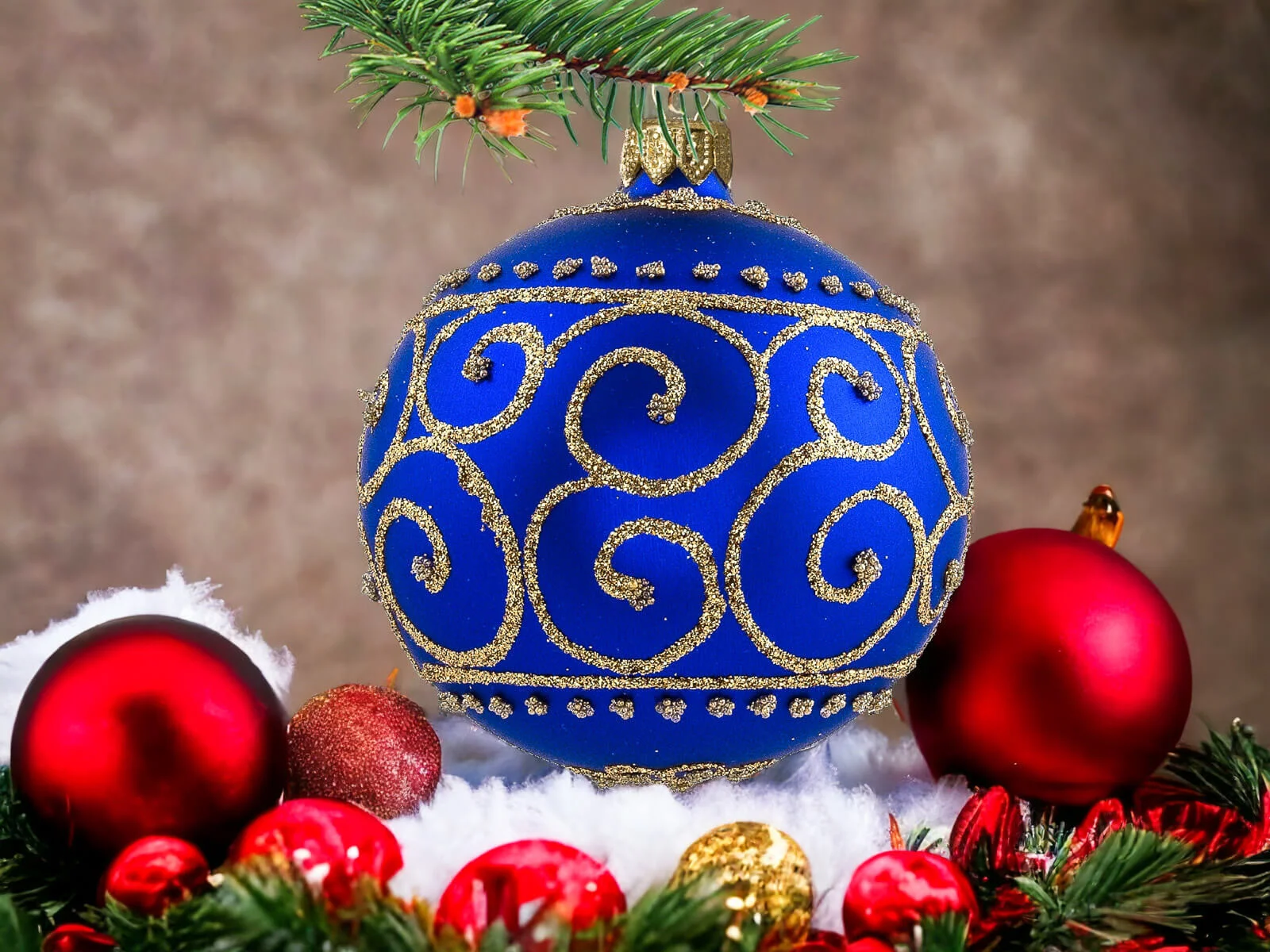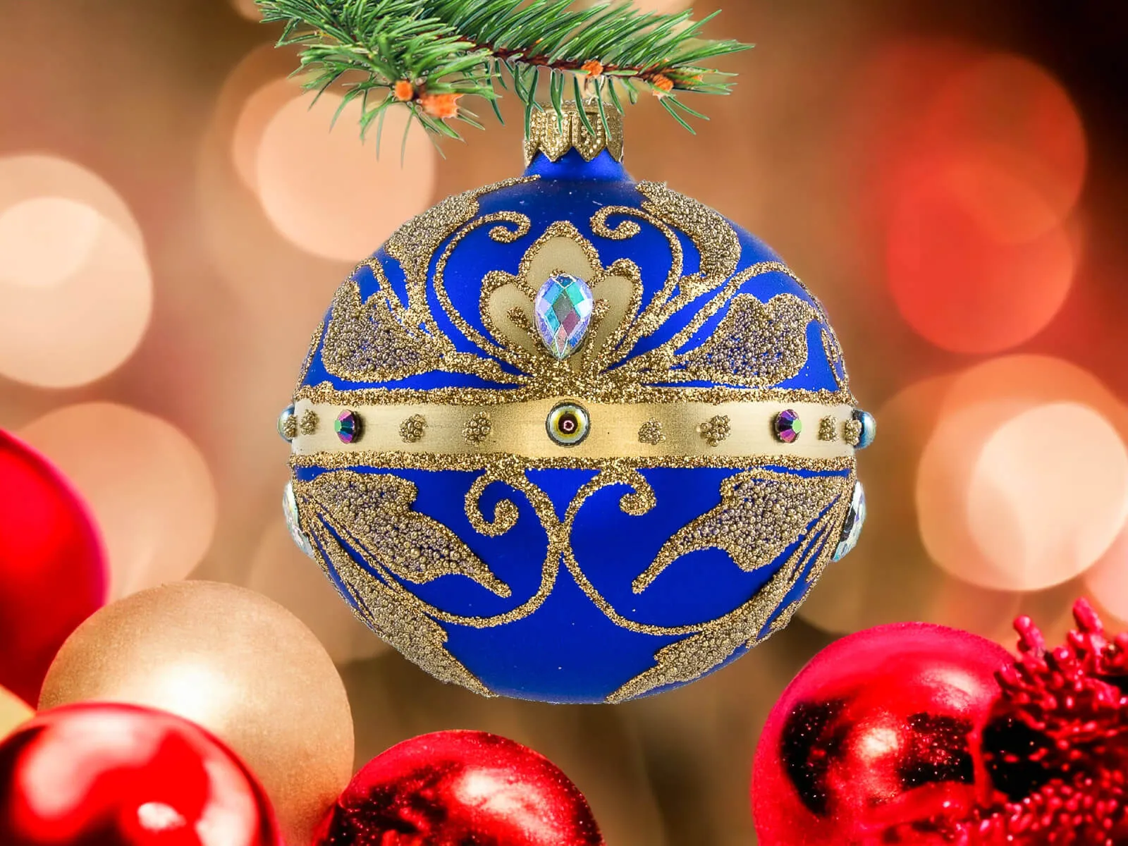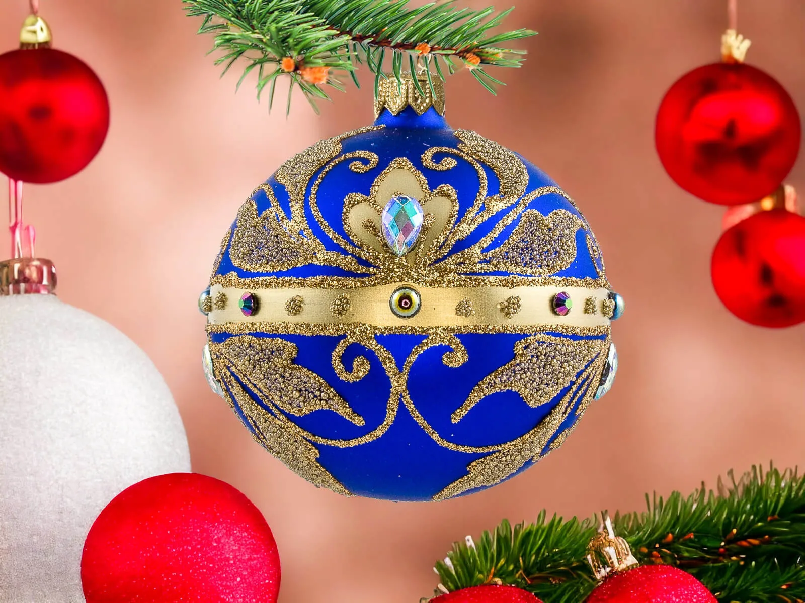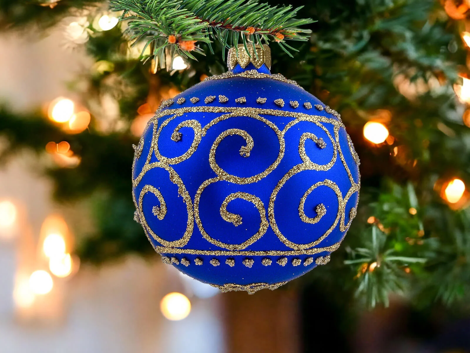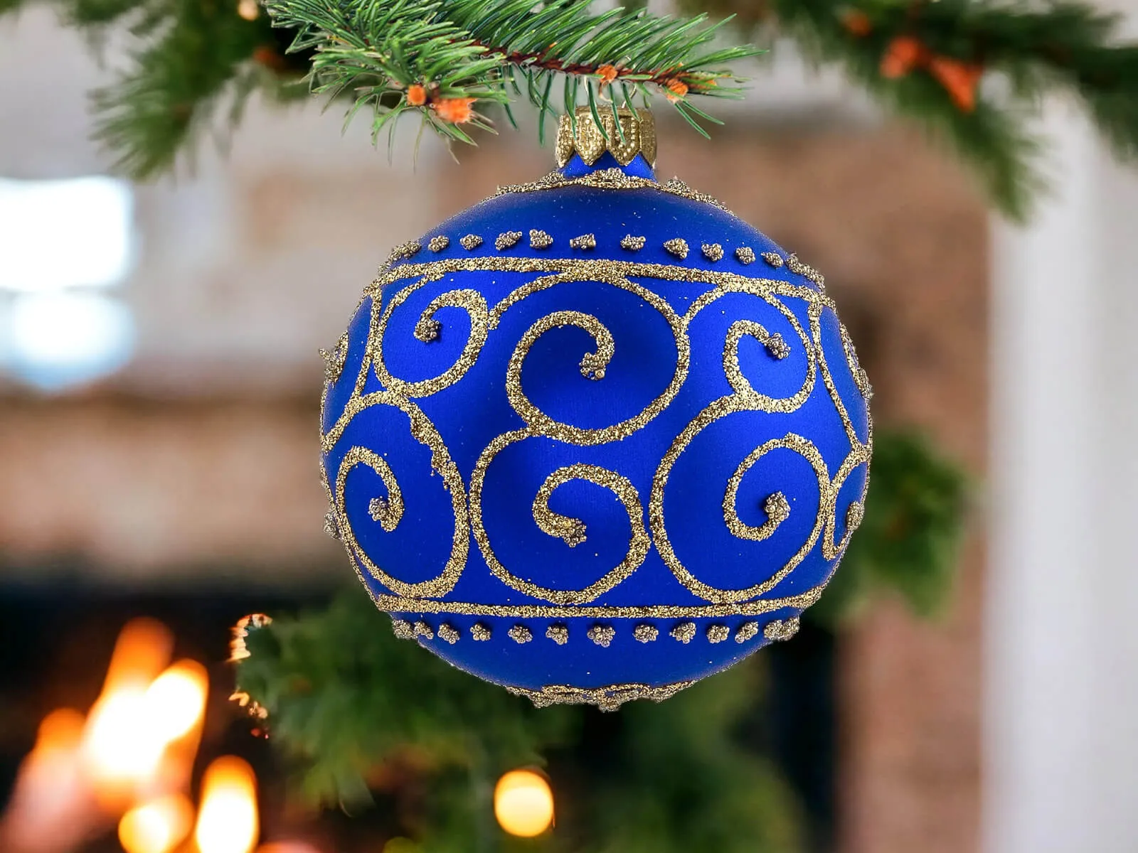 Szafirowy podkład bombek stanowi tło dla bogatych złotych zdobień, które zdobią każdą z nich. Złote detale, precyzyjnie nanoszone ręcznie, nadają bombkom wyrafinowanego charakteru, tworząc efektowny zestaw, który z pewnością przyciągnie uwagę i stworzy wyjątkowy klimat świąt.