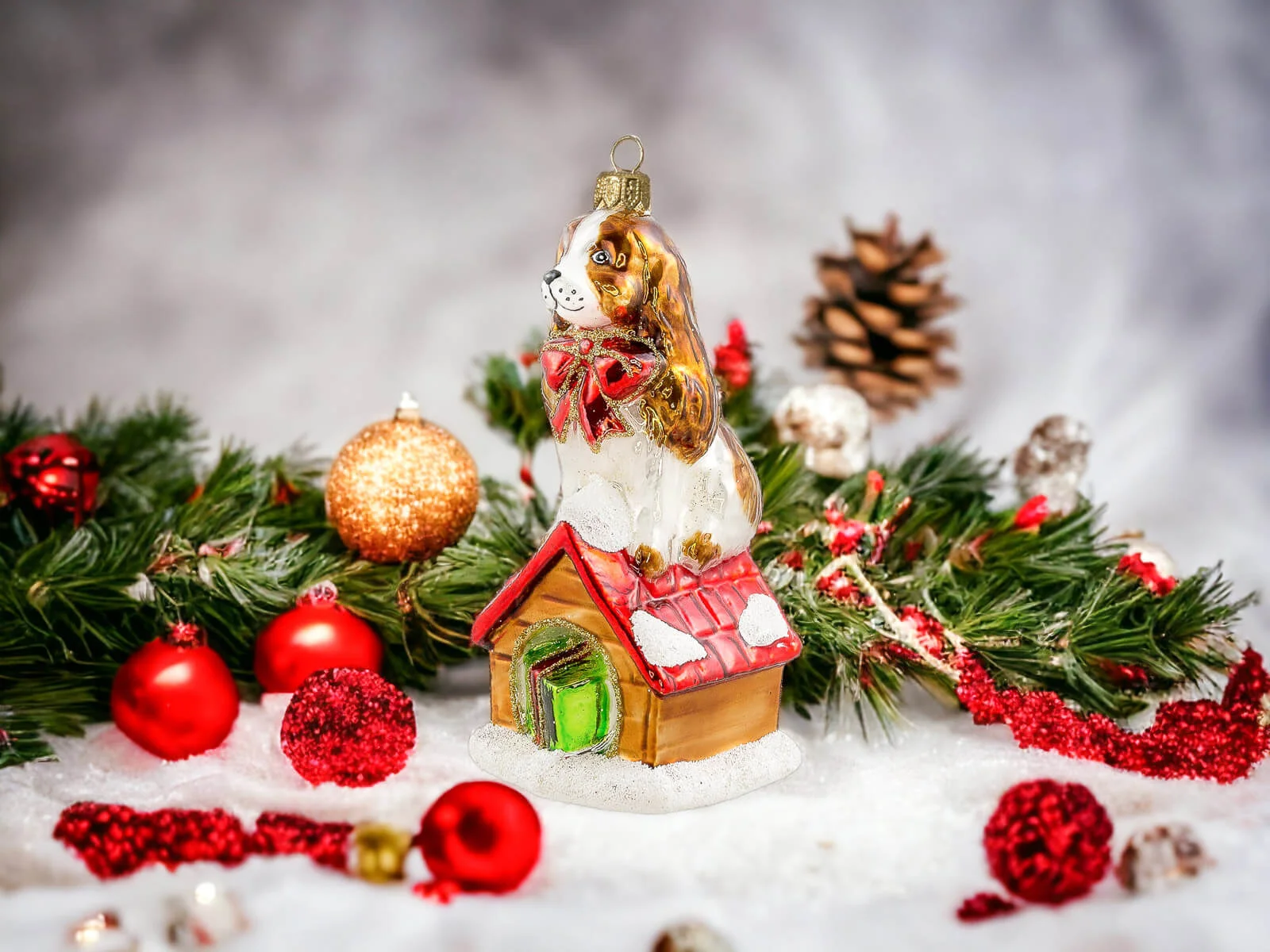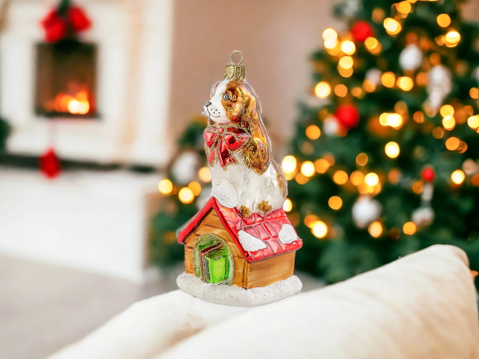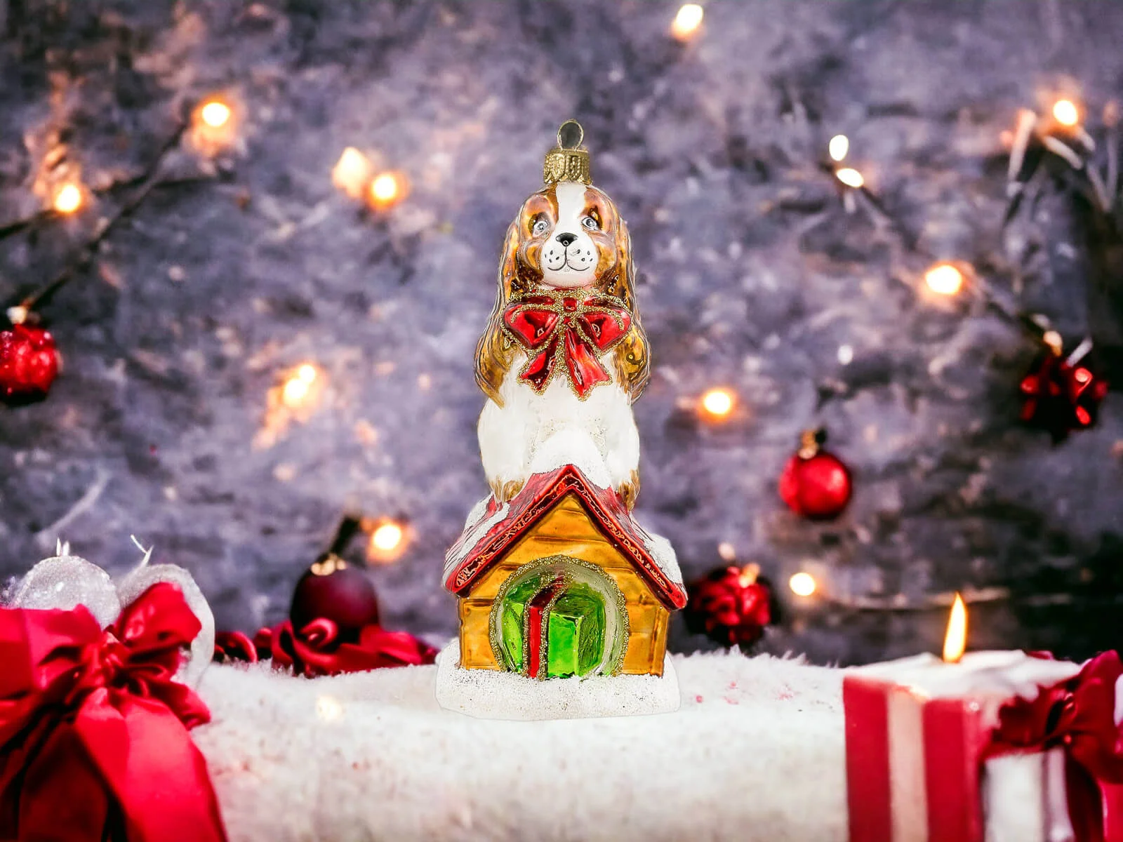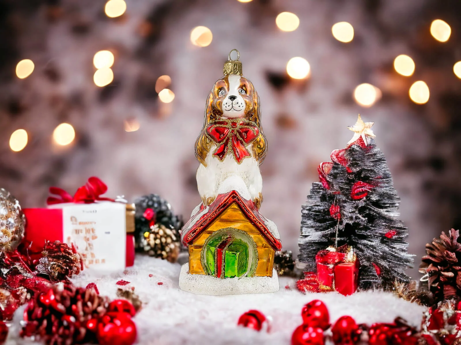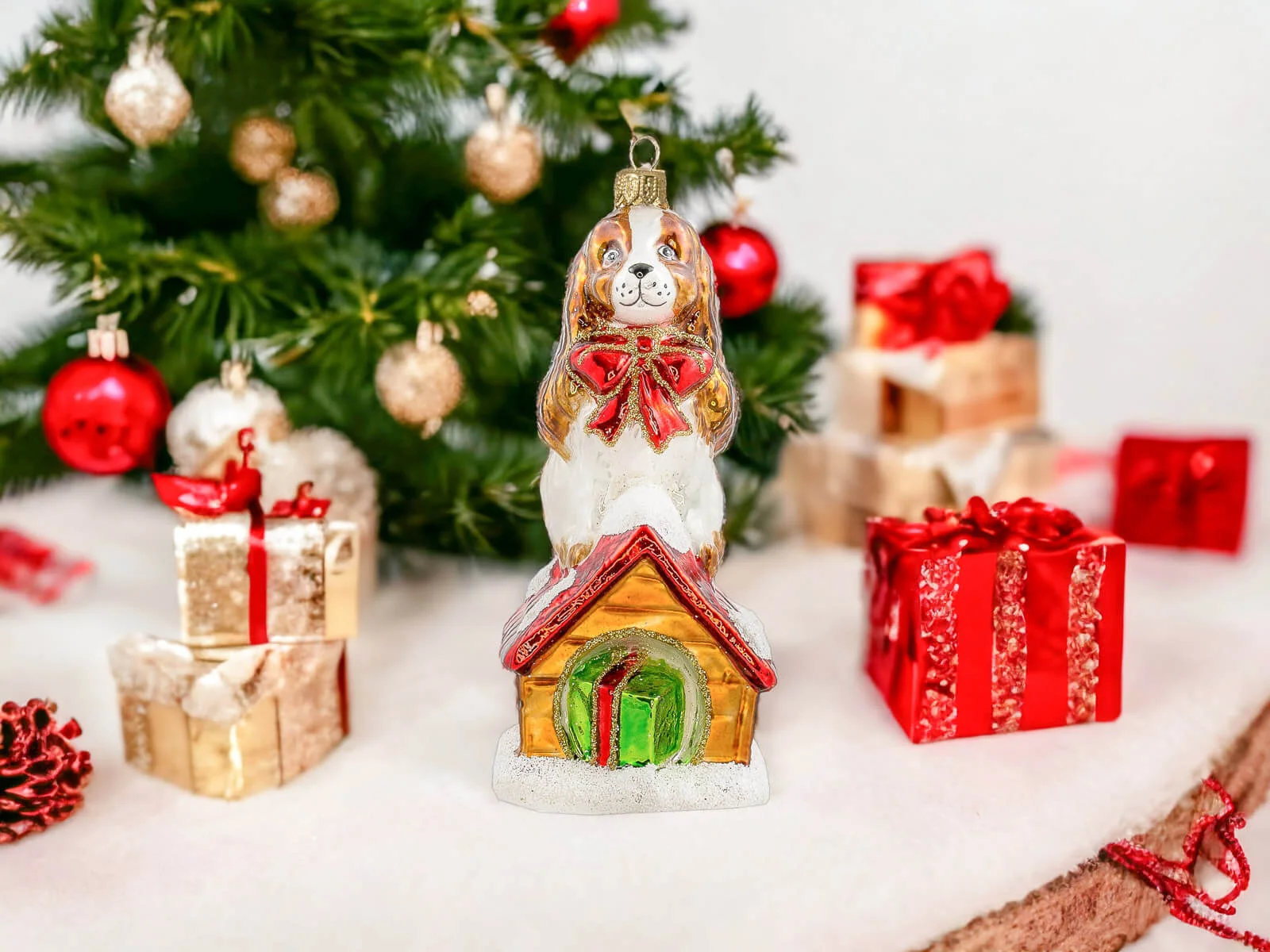 Piesek, z ręcznie malowanymi, starannie wyeksponowanymi szczegółami sierści, wygląda bardzo realistycznie. Artysta zadbał o wyjątkowe szczegóły – od jego błyszczących oczu pełnych uroku, po zabawnie zadarty ogonek, co tworzy wrażenie, że jest on gotów wskoczyć prosto z bombki i obdarować wszystkich swoją radością. Buda, na której siedzi, jest równie pięknie zdobiona – w naturalnych kolorach drewna, z delikatnymi akcentami śniegu na dachu, co dodaje jej świątecznego klimatu. Mały znak z jego imieniem na wejściu lub drobne detale, takie jak miska stojąca obok, tworzą realistyczny, pełen domowego ciepła obraz.