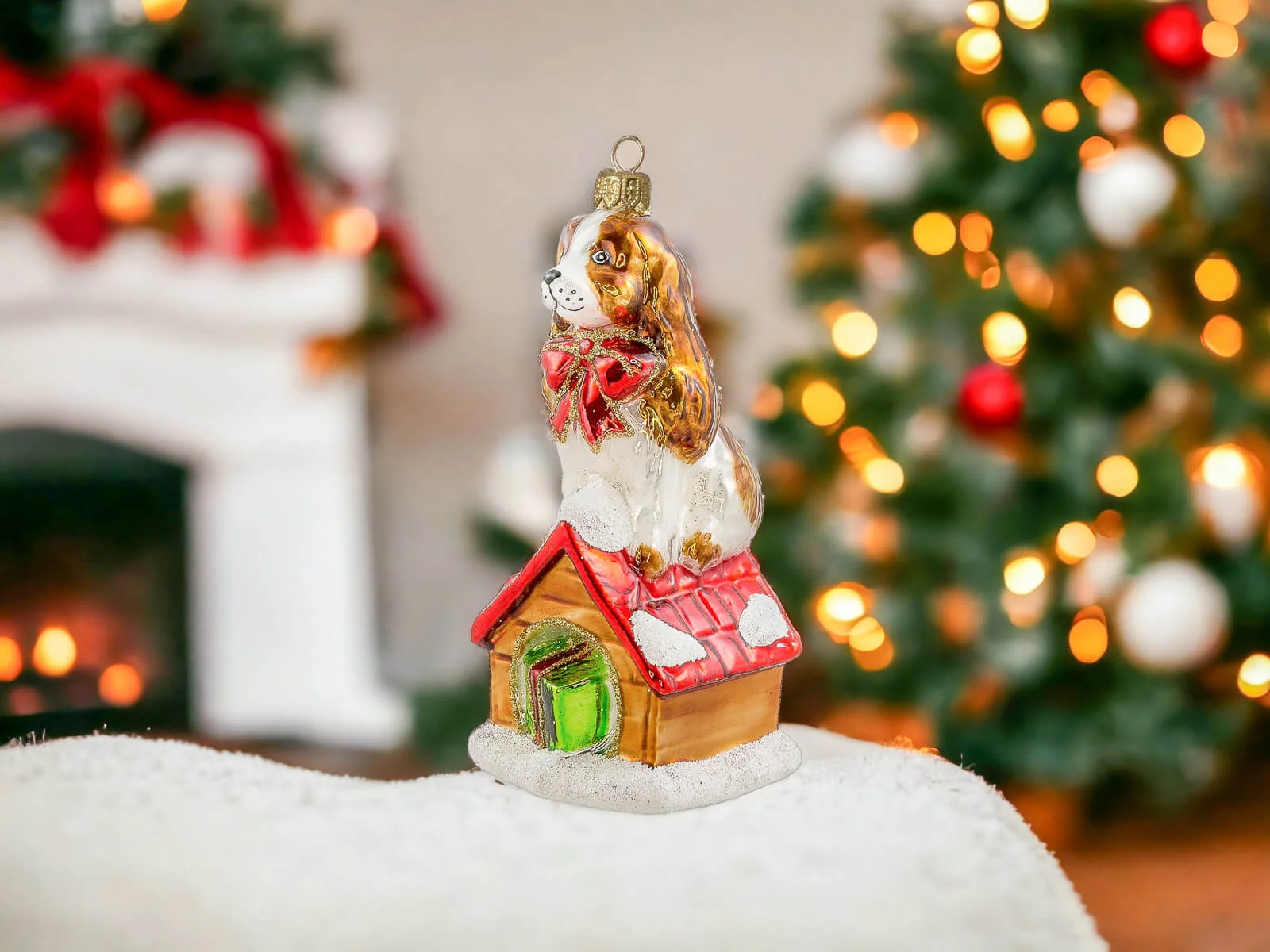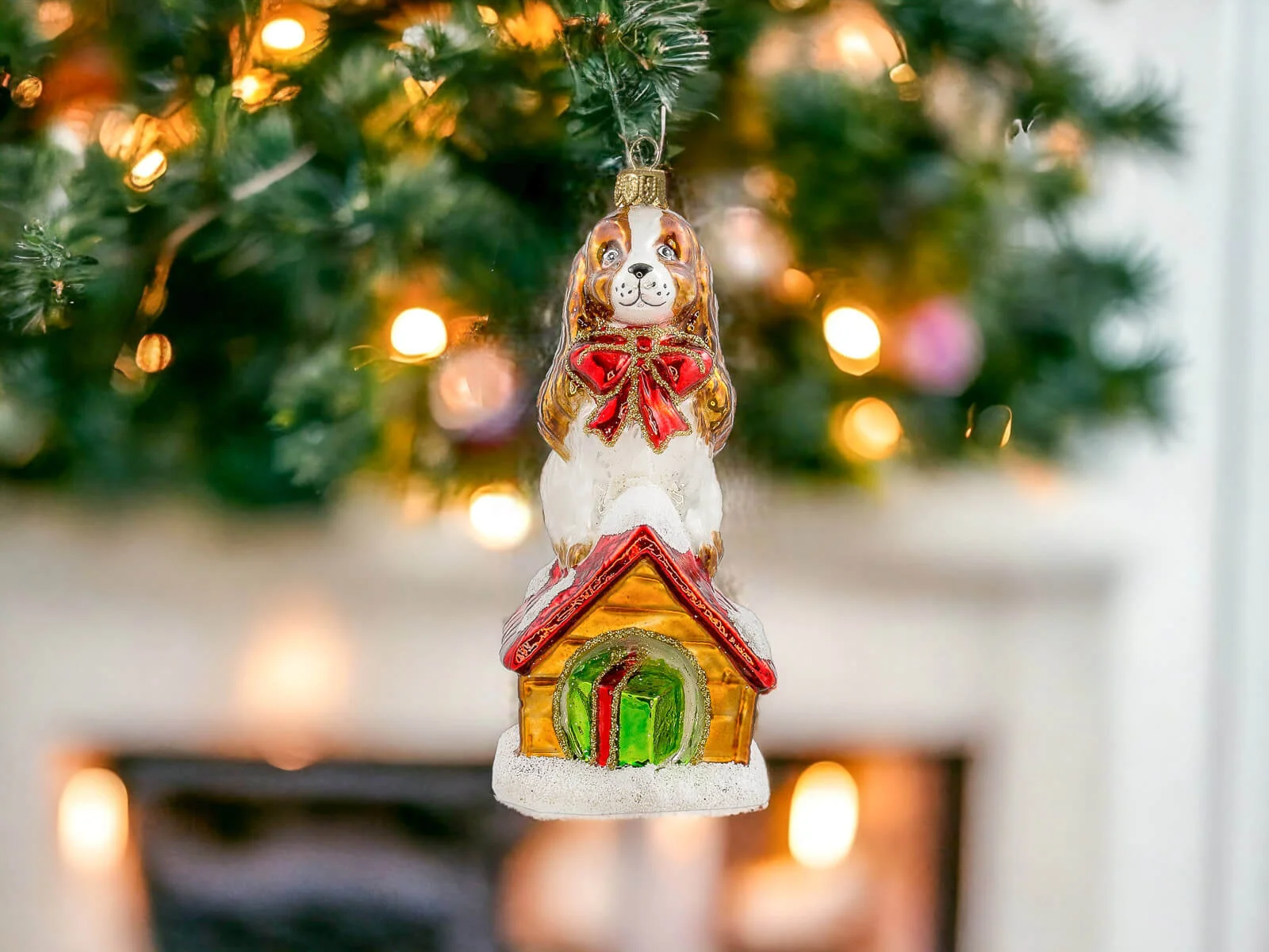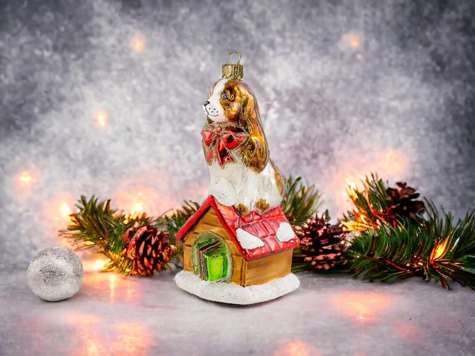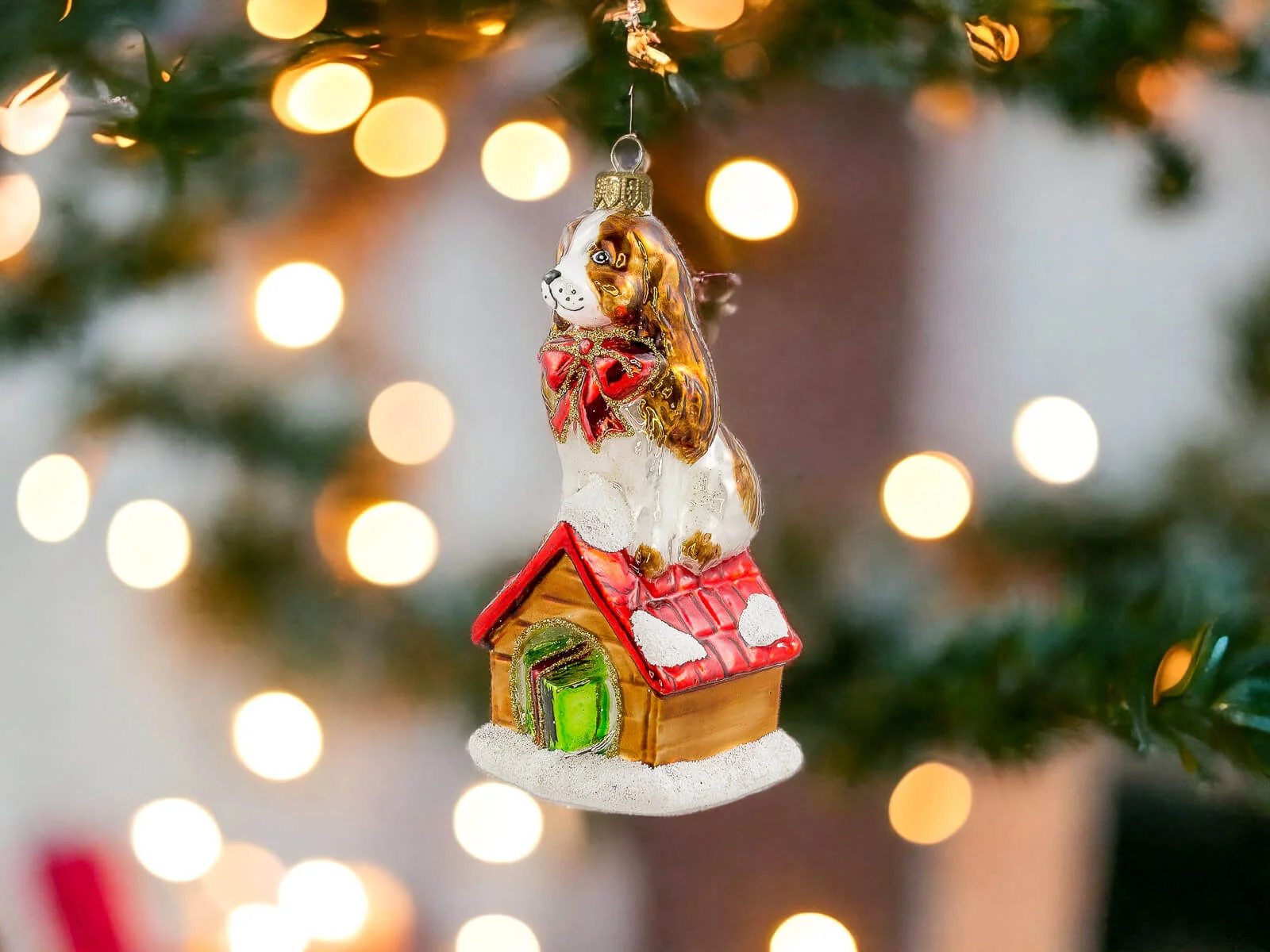 Piesek, z ręcznie malowanymi, starannie wyeksponowanymi szczegółami sierści, wygląda bardzo realistycznie. Artysta zadbał o wyjątkowe szczegóły – od jego błyszczących oczu pełnych uroku, po zabawnie zadarty ogonek, co tworzy wrażenie, że jest on gotów wskoczyć prosto z bombki i obdarować wszystkich swoją radością. Buda, na której siedzi, jest równie pięknie zdobiona – w naturalnych kolorach drewna, z delikatnymi akcentami śniegu na dachu, co dodaje jej świątecznego klimatu. Mały znak z jego imieniem na wejściu lub drobne detale, takie jak miska stojąca obok, tworzą realistyczny, pełen domowego ciepła obraz.