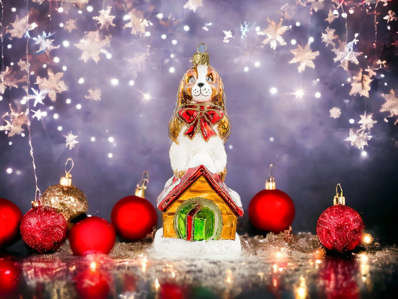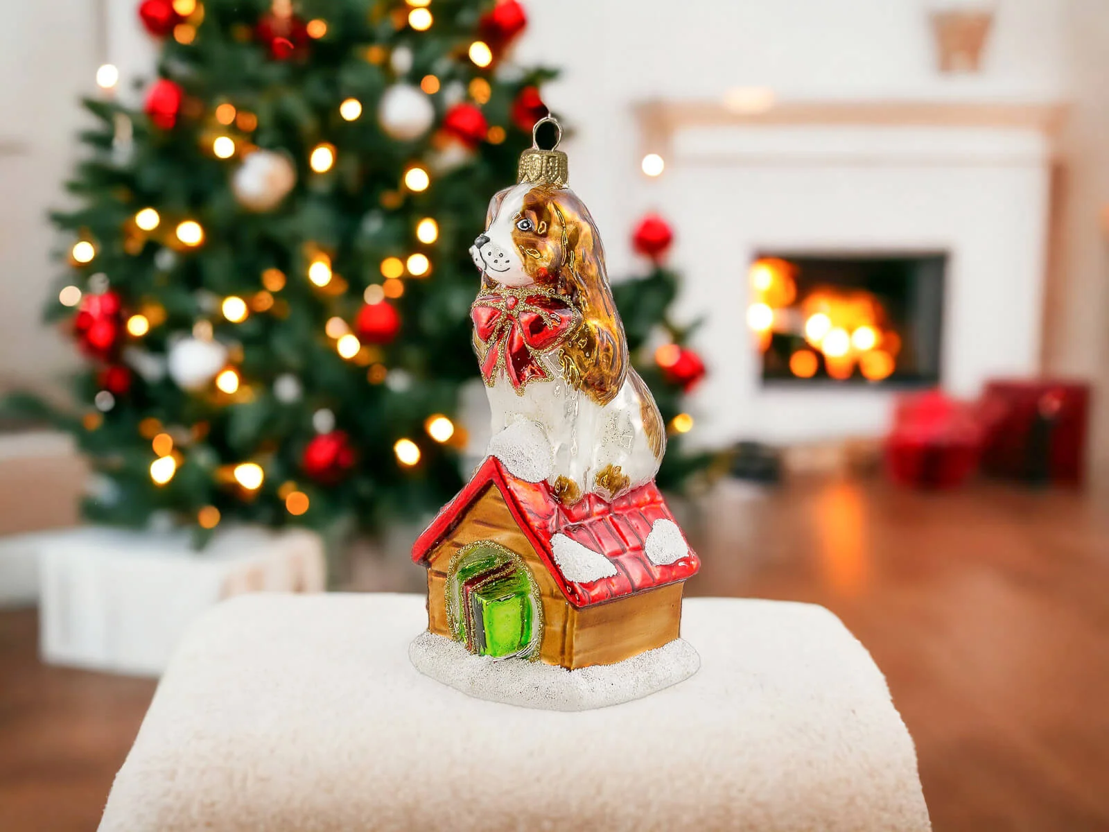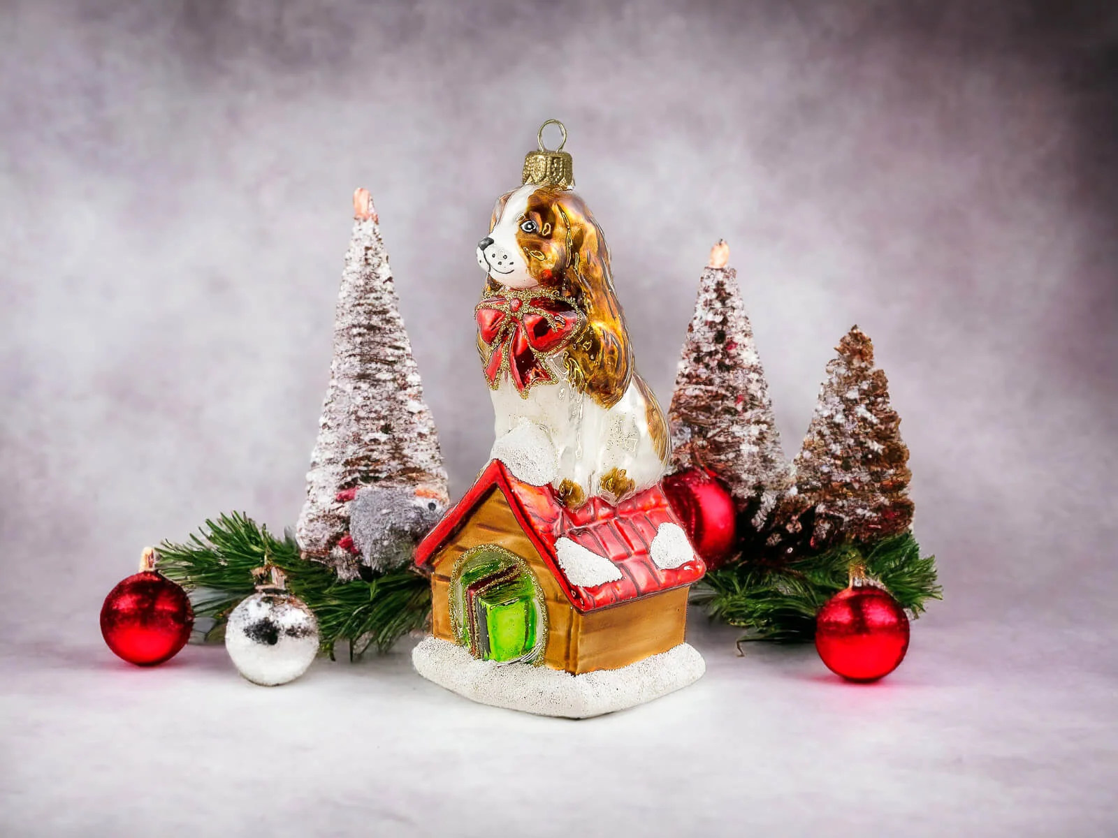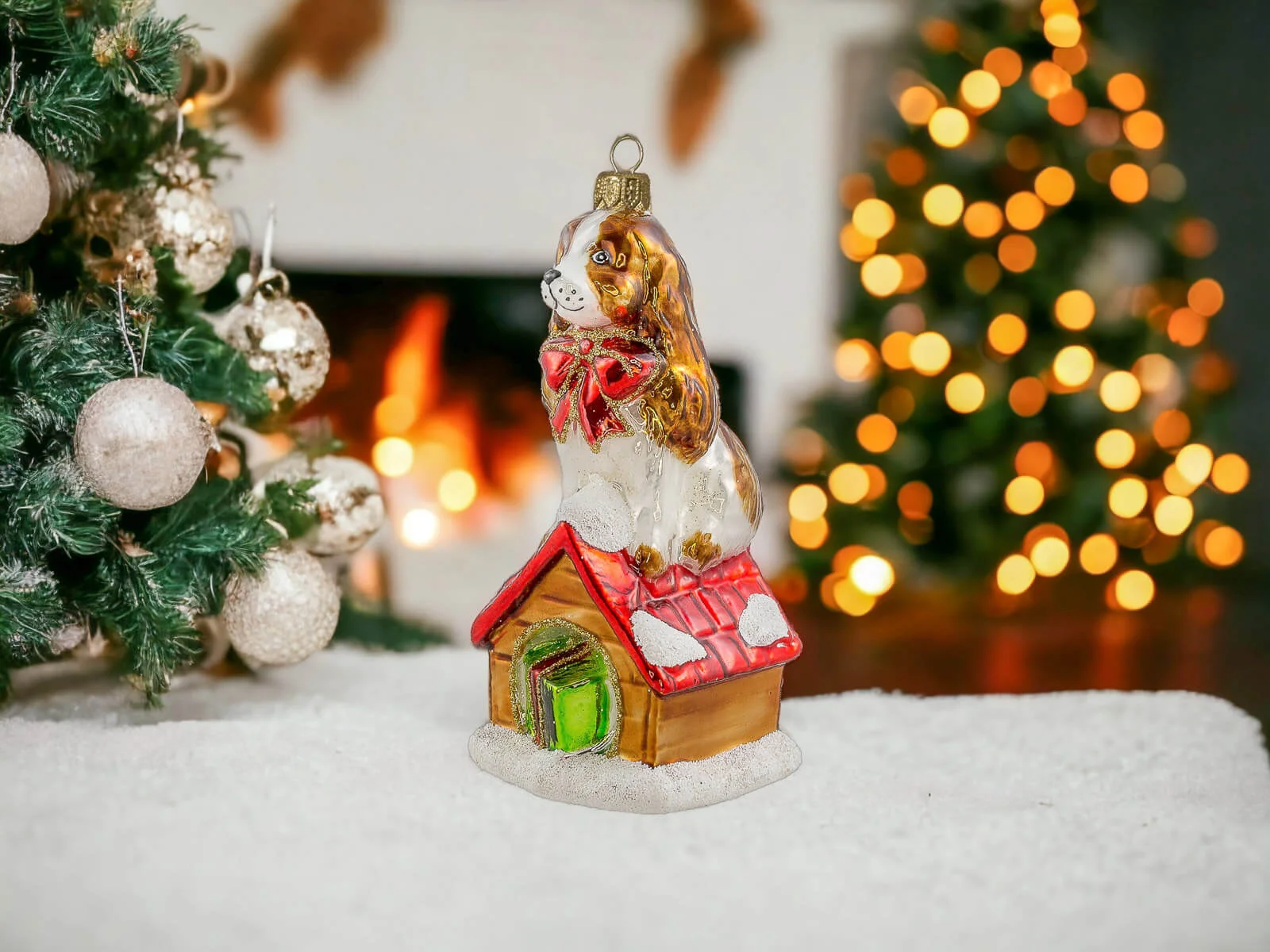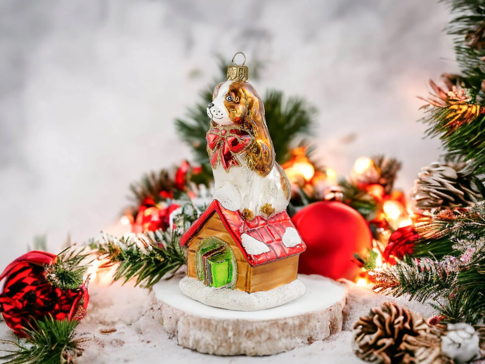 Piesek, z ręcznie malowanymi, starannie wyeksponowanymi szczegółami sierści, wygląda bardzo realistycznie. Artysta zadbał o wyjątkowe szczegóły – od jego błyszczących oczu pełnych uroku, po zabawnie zadarty ogonek, co tworzy wrażenie, że jest on gotów wskoczyć prosto z bombki i obdarować wszystkich swoją radością. Buda, na której siedzi, jest równie pięknie zdobiona – w naturalnych kolorach drewna, z delikatnymi akcentami śniegu na dachu, co dodaje jej świątecznego klimatu. Mały znak z jego imieniem na wejściu lub drobne detale, takie jak miska stojąca obok, tworzą realistyczny, pełen domowego ciepła obraz.