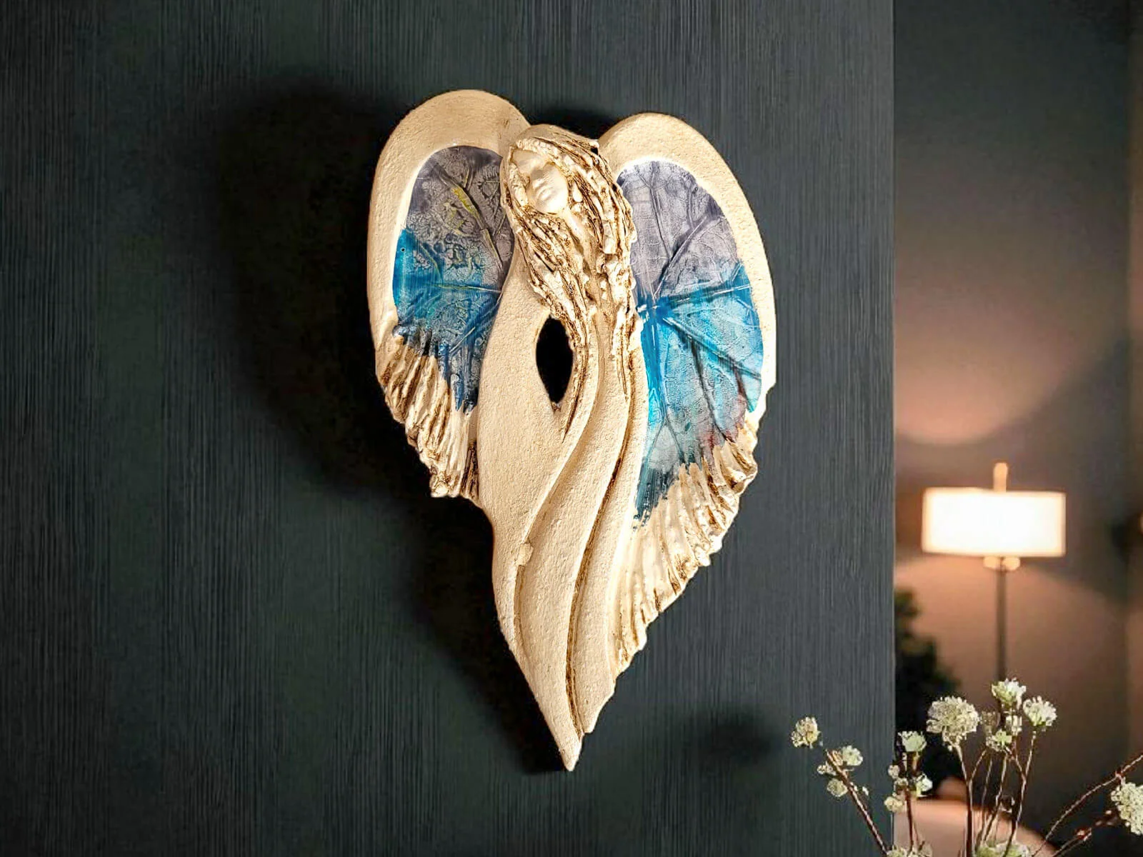 Unikalny anioł Cynthia z kolekcji Art Leaf z wzorami prawdziwych liści. Jedyna sztuka z tym wzorem. Wyjątkowa uroda, ujmująca delikatność, wielka wrażliwość, kwintesencja kobiecości, pełna miłości, porywająca, a jednocześnie zapewniająca spokój. Zobacz jak pięknie chroni miłość, jak dba i troszczy się o Ciebie i Twoich bliskich, opiekuje, obdarza wiarą dającą siłę, rozlewa radość do każdego zakątka mieszkania, przepełnia je dobrocią, sercem pełnym nadziei, sprawia, że miłość dwojga ludzi jest spokojną przystanią.