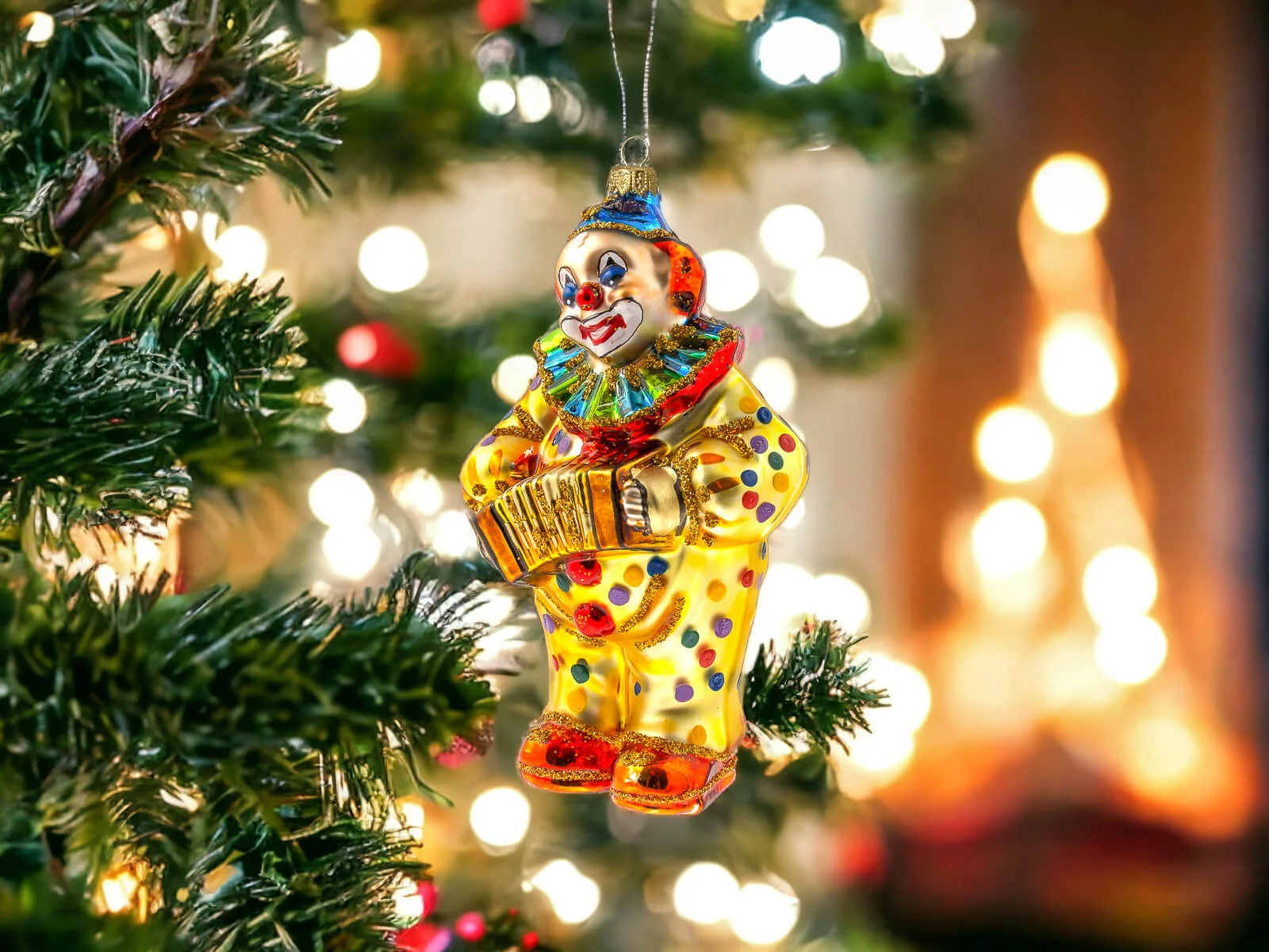 Bombka w kształcie złotego klauna grającego na harmonii to nie tylko ozdoba, ale także przypomnienie, że święta to czas radości i muzyki, która łączy wszystkich – młodszych i starszych – w atmosferze wzajemnej życzliwości i ciepła.