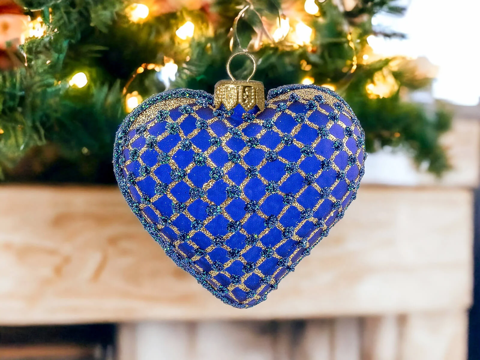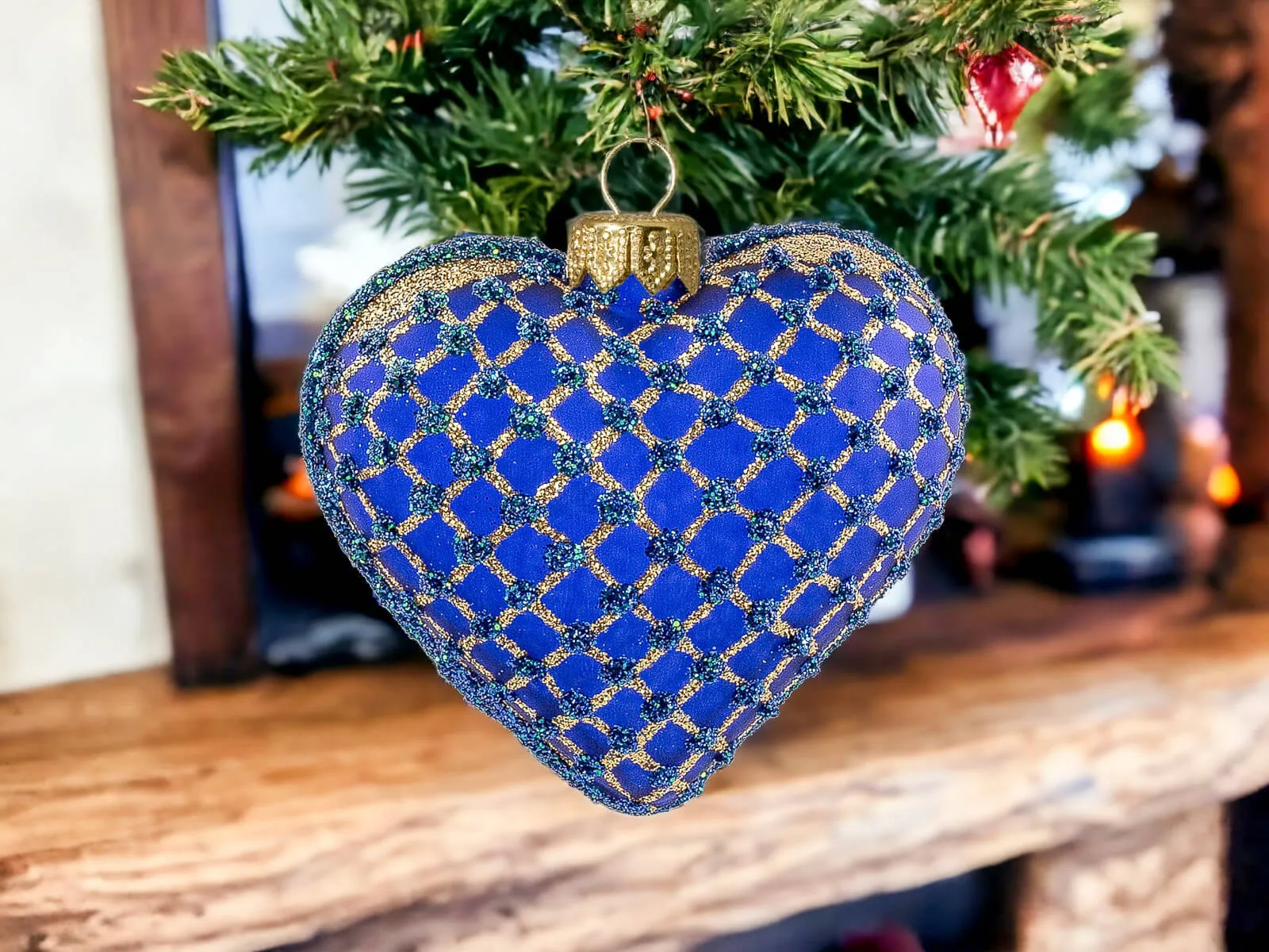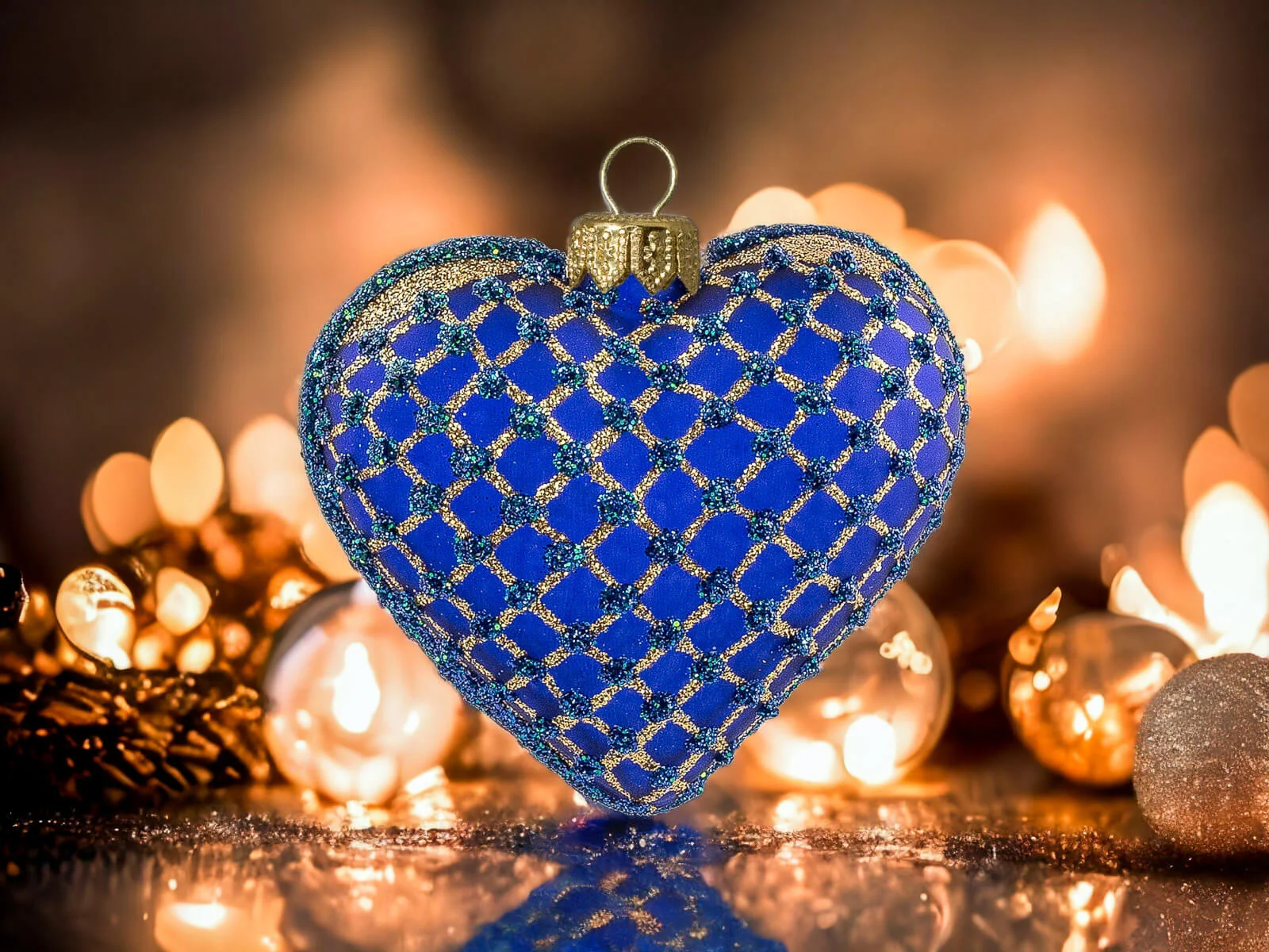 Szafirowy podkład stanowi eleganckie tło dla złotych zdobień, które tworzą bogatą, mistyczną kompozycję na powierzchni serca. Złote motywy, precyzyjnie nanoszone ręcznie, nadają bombce wyjątkowego blasku i sprawiają, że ta ozdoba staje się centralnym punktem świątecznego wystroju.