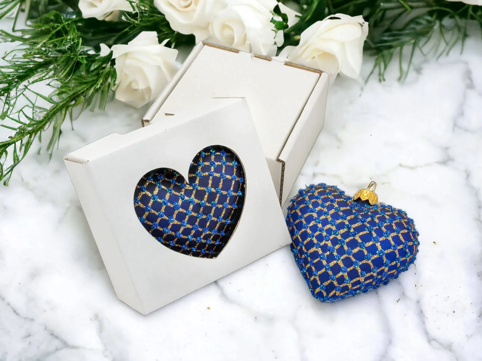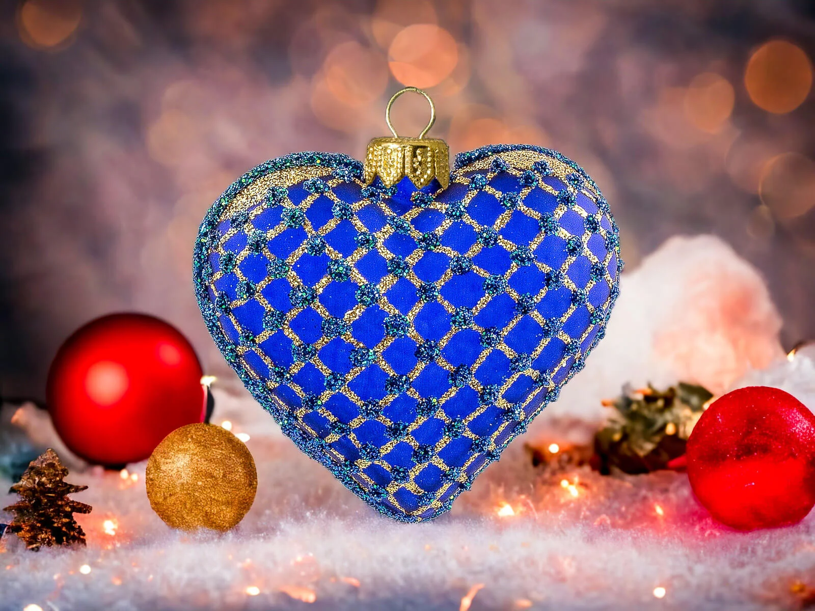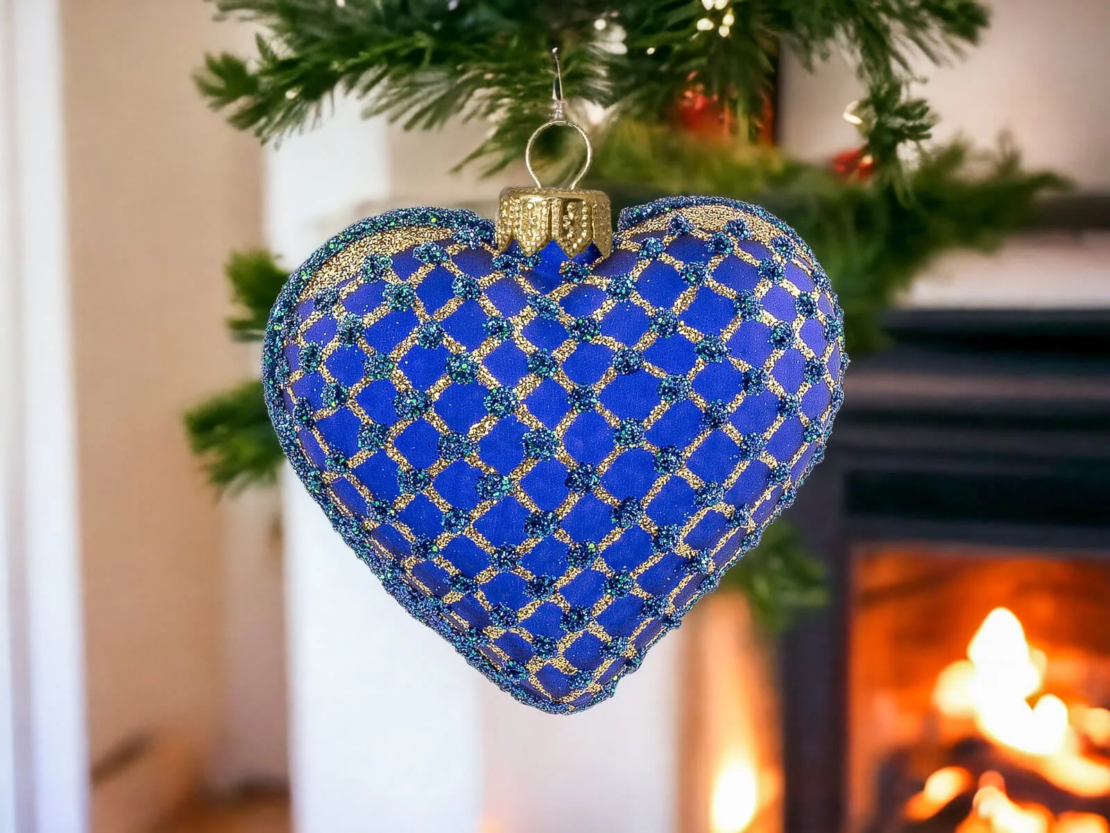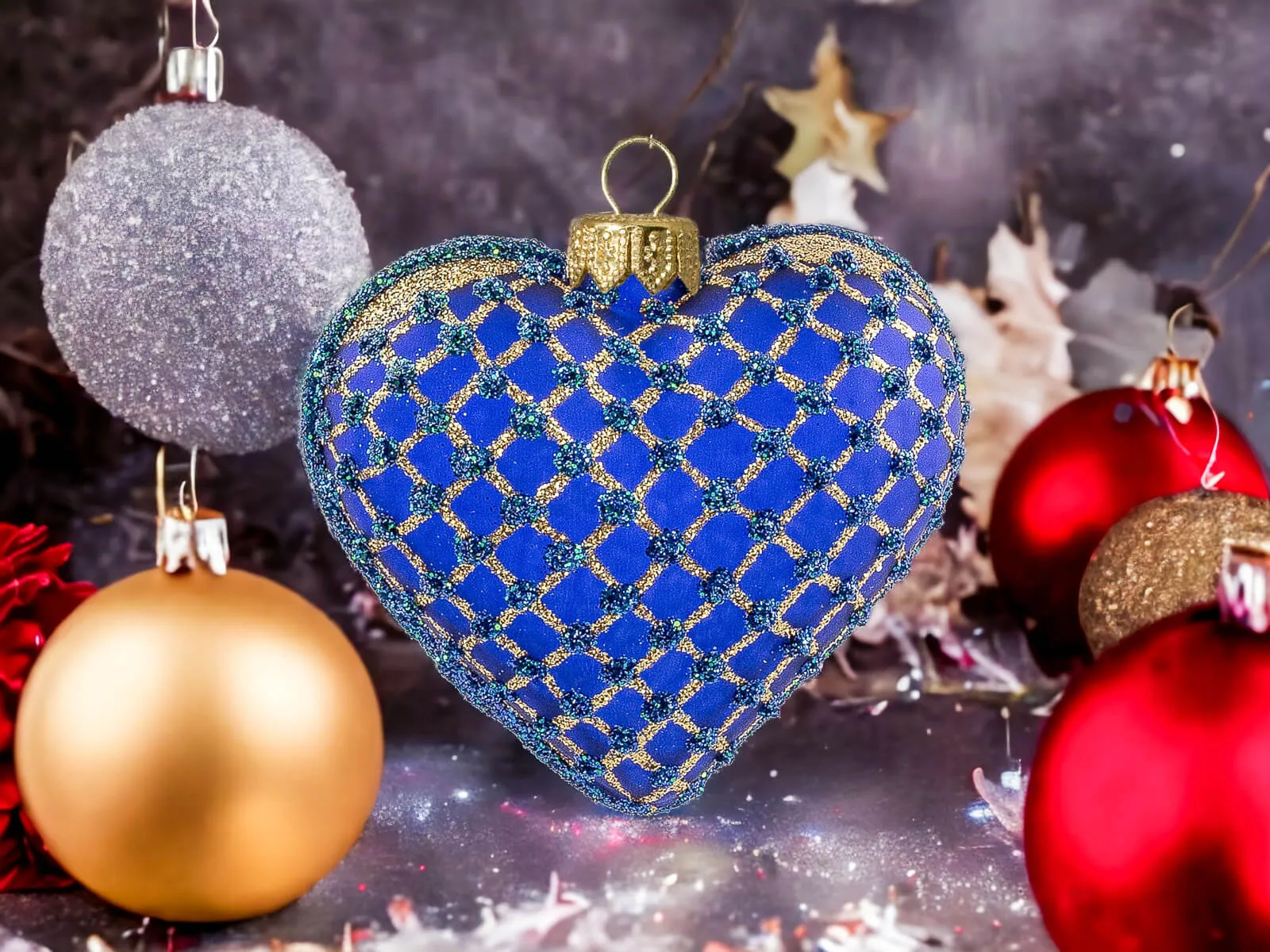 Szafirowy podkład stanowi eleganckie tło dla złotych zdobień, które tworzą bogatą, mistyczną kompozycję na powierzchni serca. Złote motywy, precyzyjnie nanoszone ręcznie, nadają bombce wyjątkowego blasku i sprawiają, że ta ozdoba staje się centralnym punktem świątecznego wystroju.