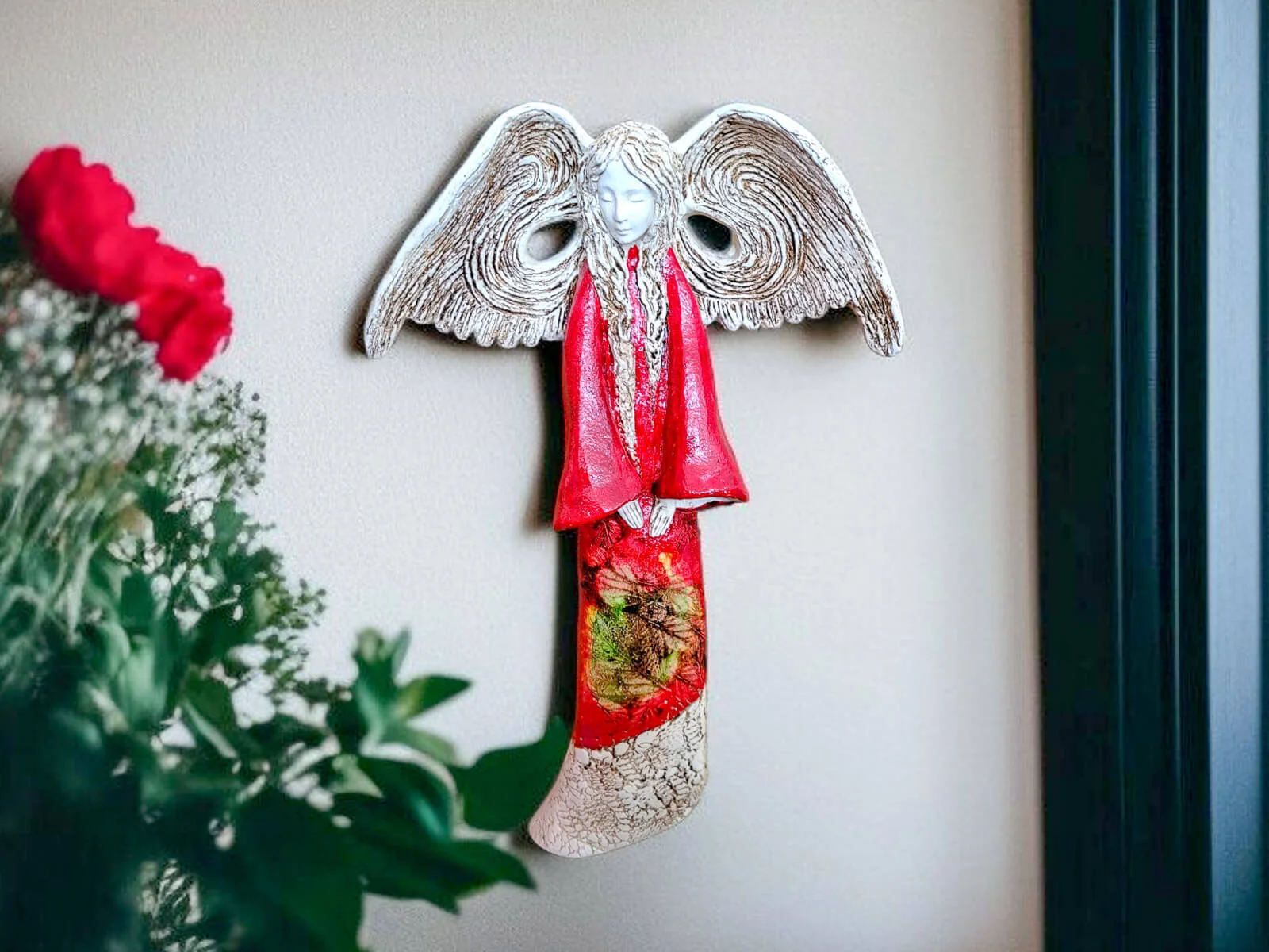 Anioł Clara Art Leaf - czerwony - 40 x 28 cm figurka dekoracyjna gipsowa +