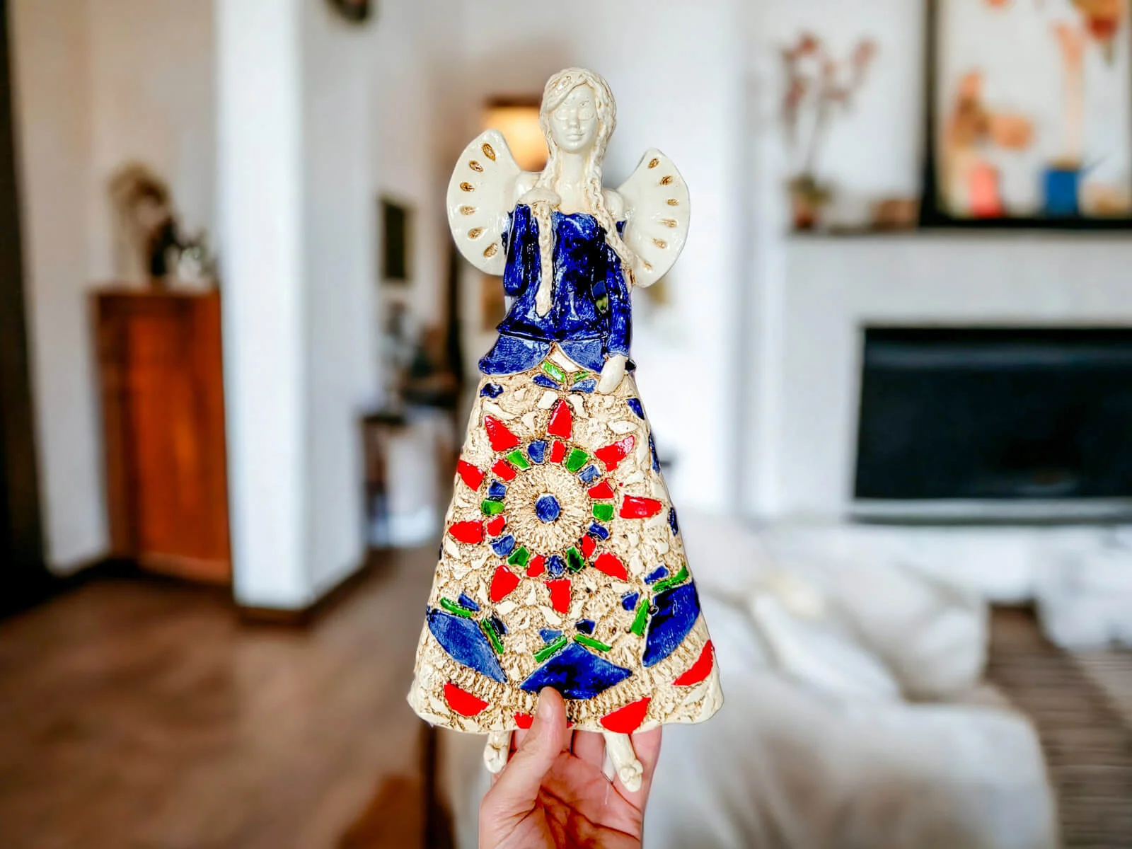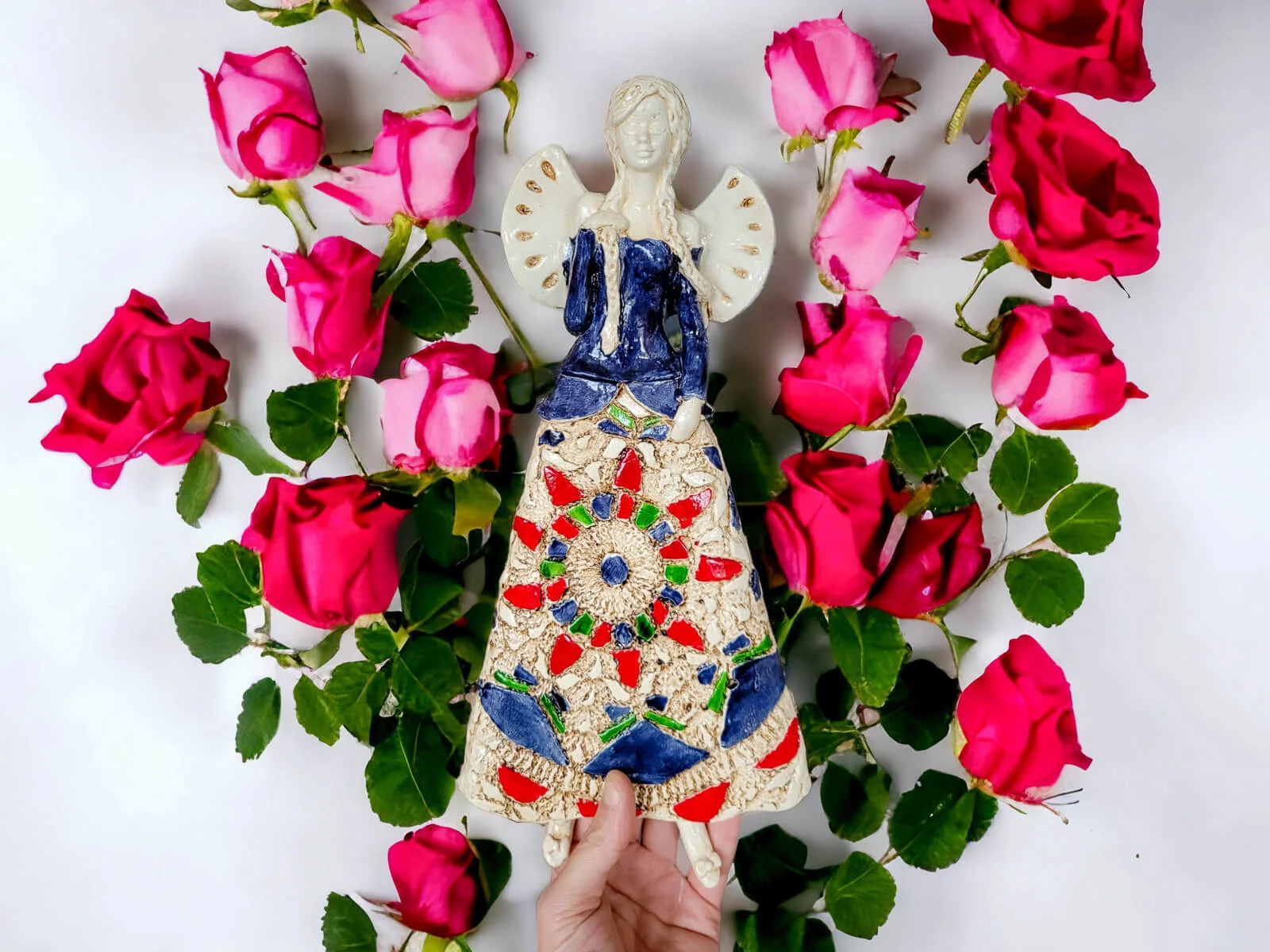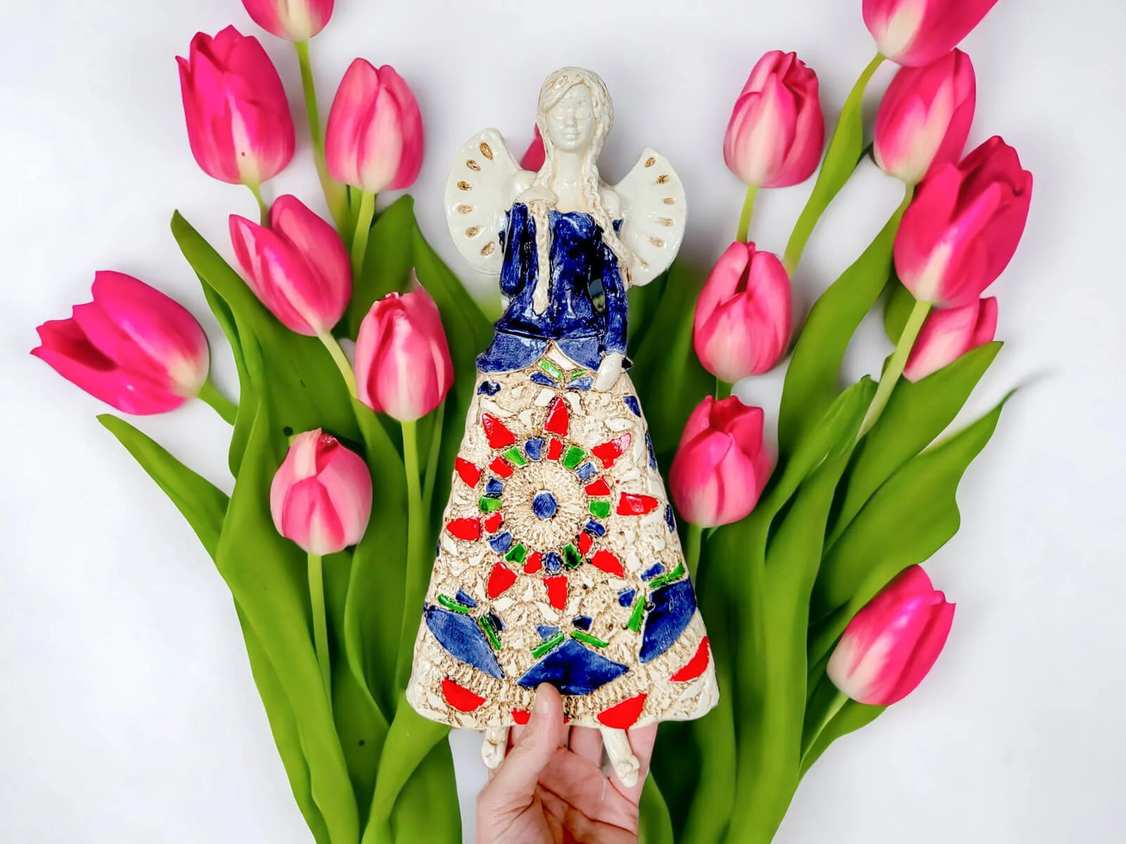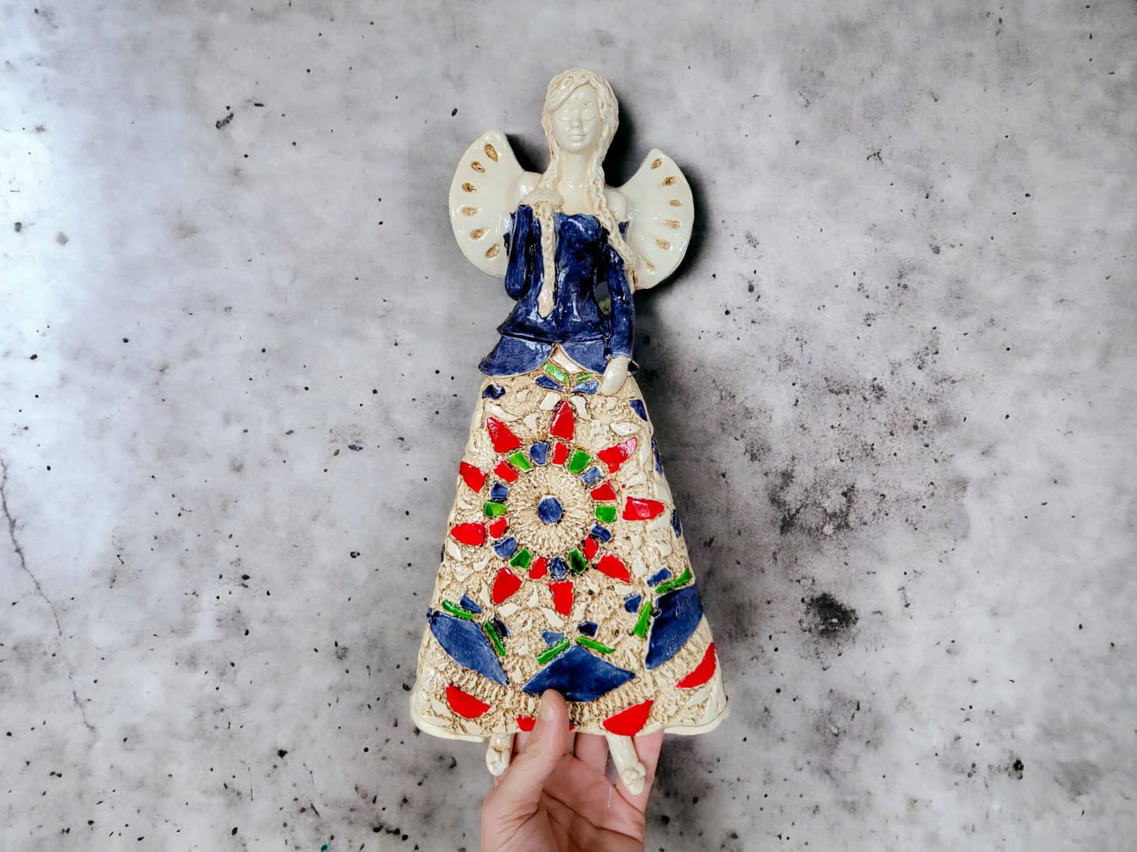 Anioł Heather w kolorze granatowo czerwonym to ręcznie wykonana figurka do zawieszenia na ścianę. Heather to aniołek ceniący sobie tradycję. Jest artystką która uwielbia kulturę ludową swojej wioski. Jest ubrana w folklorystyczną suknie. Eksponuje piękne, długie warkocze. Ma delikatne, rozłożyste skrzydła. Figurka nadaje się na prezent na każdą okazję. Można ją zawiesić w każdym miejscu. Świetnie wkomponuje się w klasyczne jak i nowoczesne wnętrze.