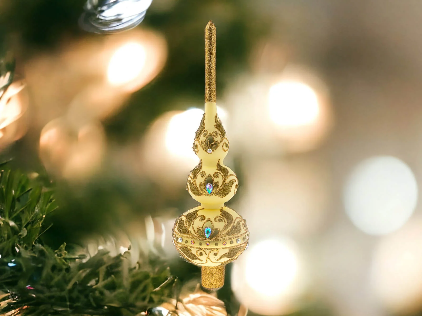 Duży szklany szpic choinkowy "Królewski" to arcydzieło ręcznej pracy, które wyróżnia się nie tylko sporym rozmiarem (32 cm wysokości) ale także niepowtarzalnym wzornictwem. Delikatny kolor wanilii nadaje mu elegancji, jednocześnie harmonijnie komponując się z różnymi stylami dekoracji świątecznych.