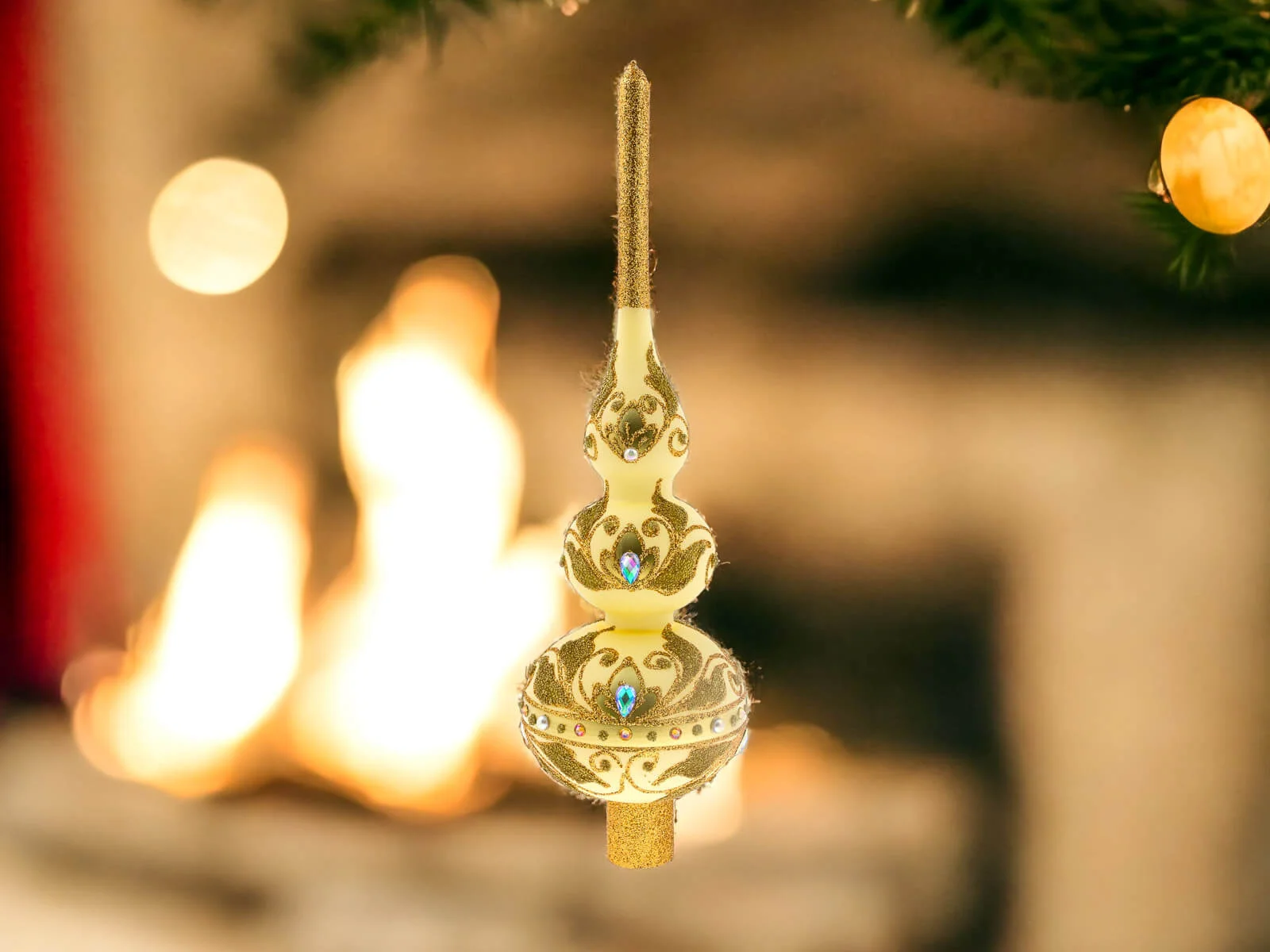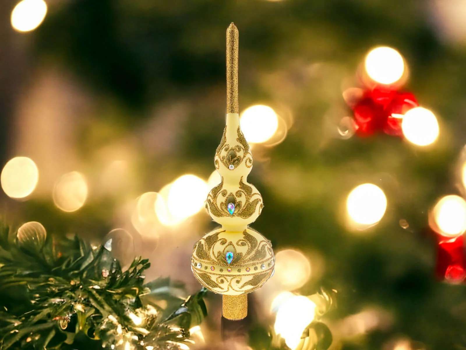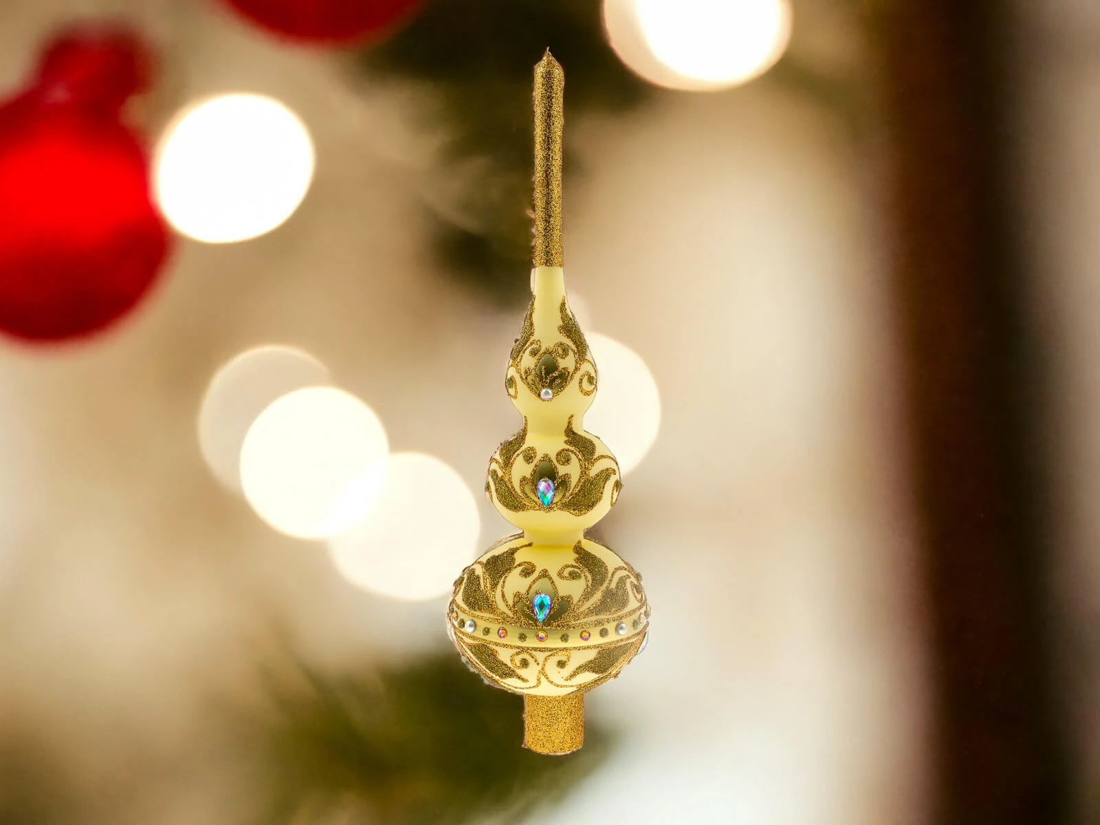 Bogactwo zdobień nie kończy się na złotych detalach. Szlifowane kamienie dodają jej subtelnego blasku, odbijając światło i tworząc piękne refleksy. To dodatkowy element, który nadaje szpicowi wyjątkowego uroku i sprawia, że stanowi on centralny punkt każdego świątecznego wystroju.