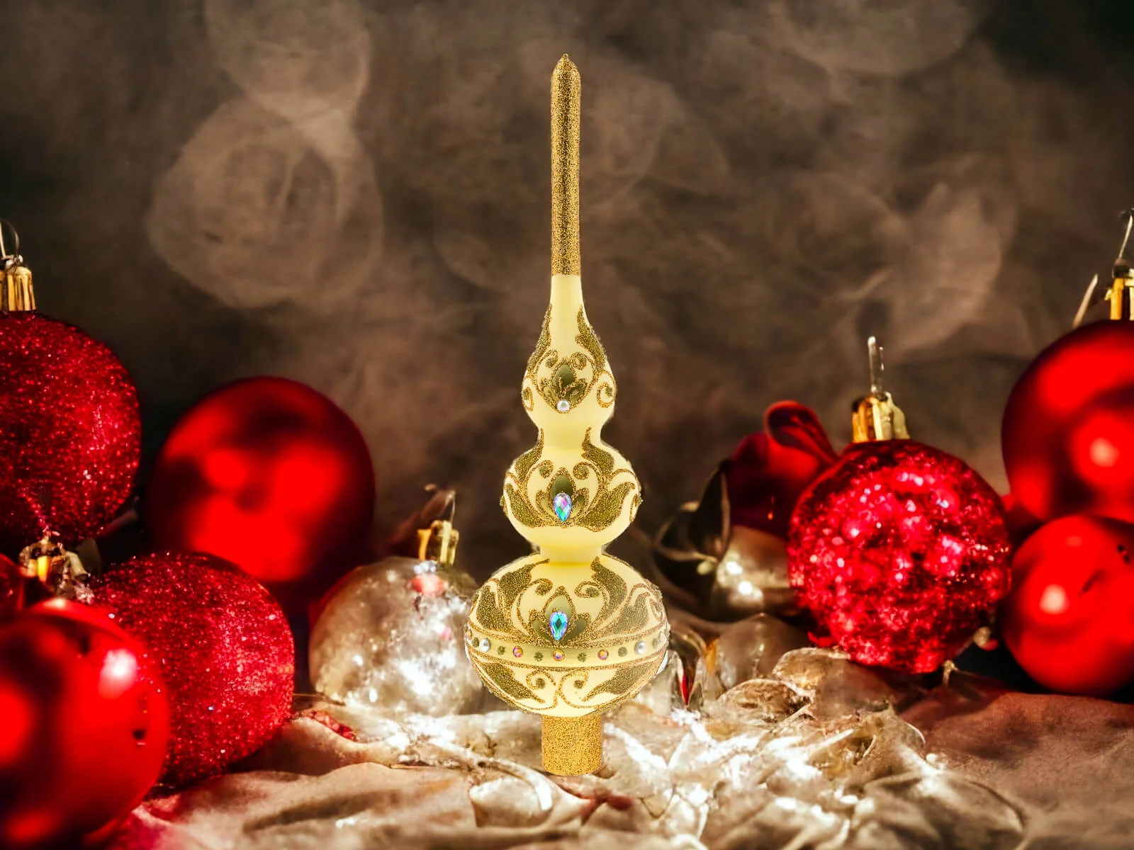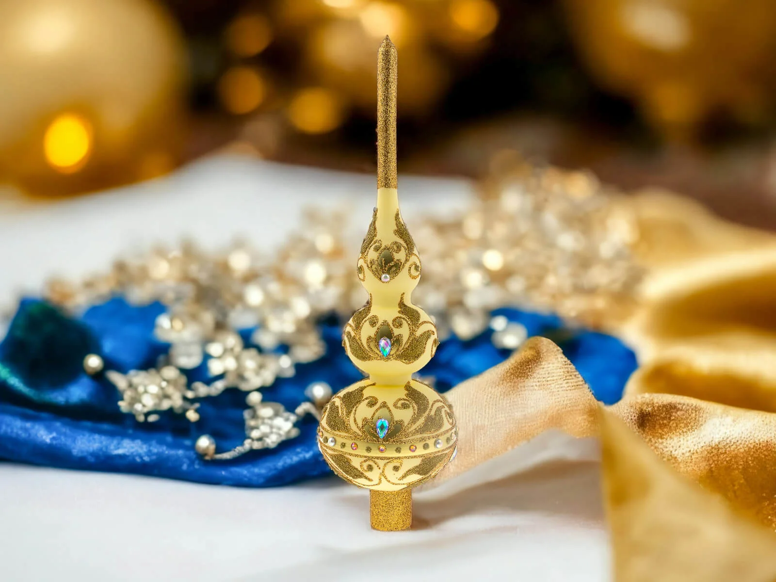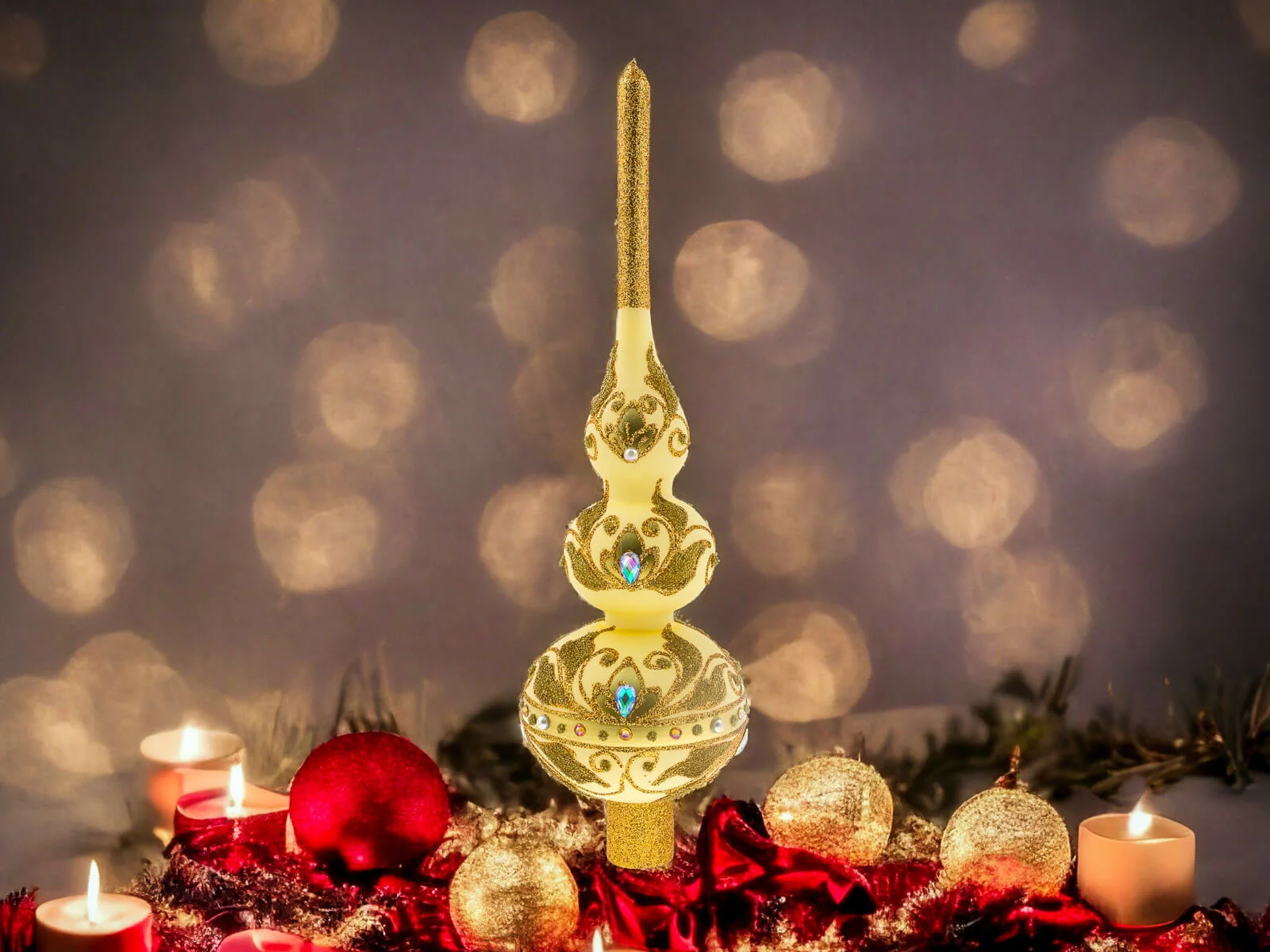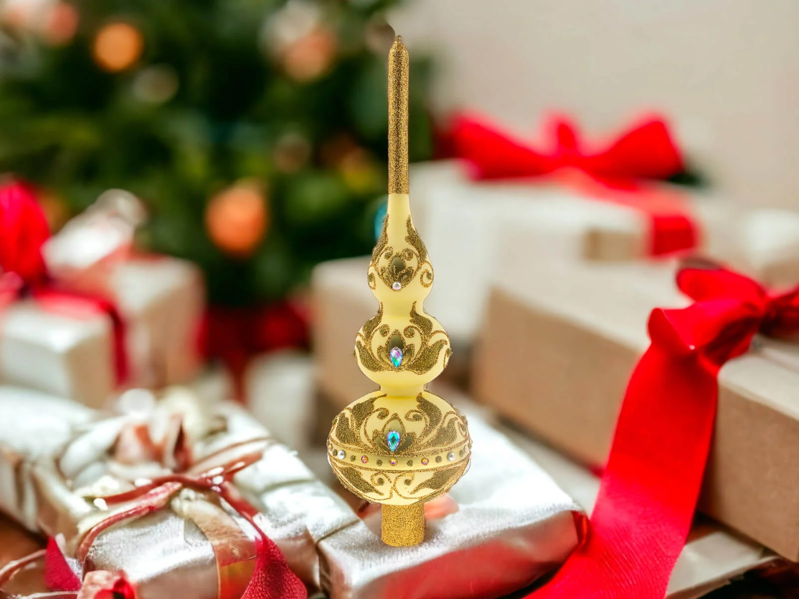 Bogactwo zdobień nie kończy się na złotych detalach. Szlifowane kamienie dodają jej subtelnego blasku, odbijając światło i tworząc piękne refleksy. To dodatkowy element, który nadaje szpicowi wyjątkowego uroku i sprawia, że stanowi on centralny punkt każdego świątecznego wystroju.