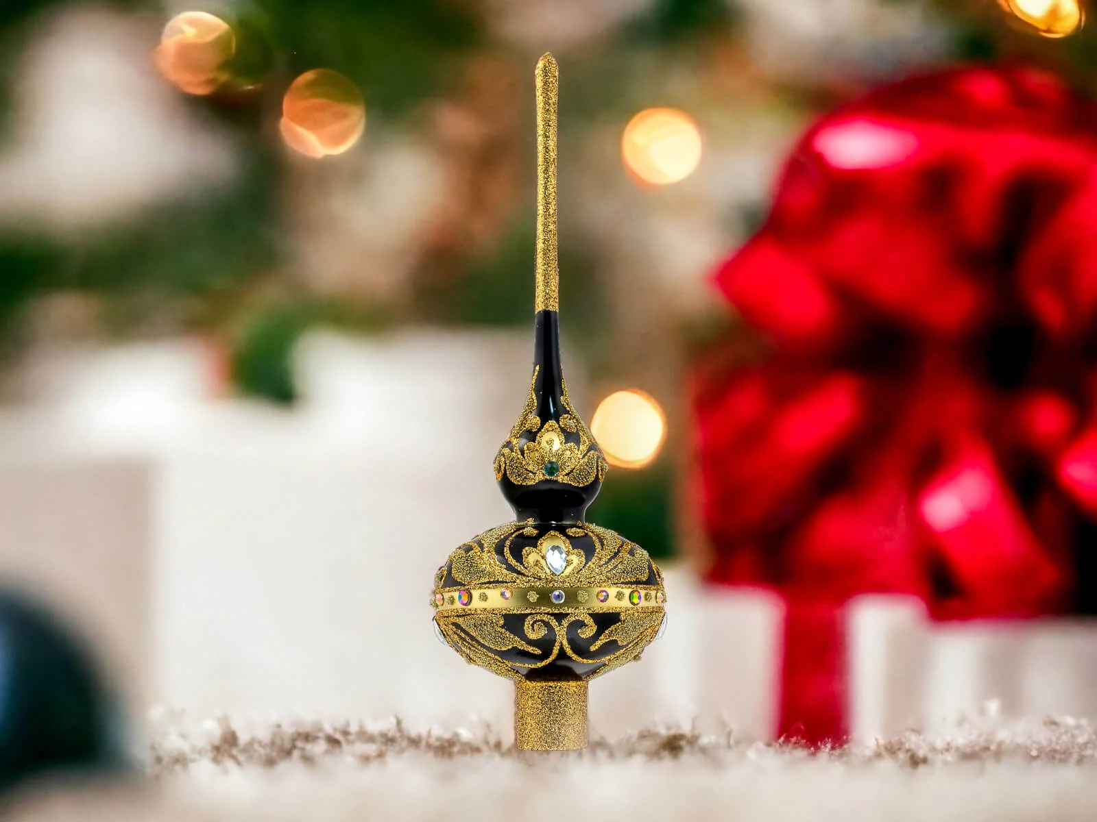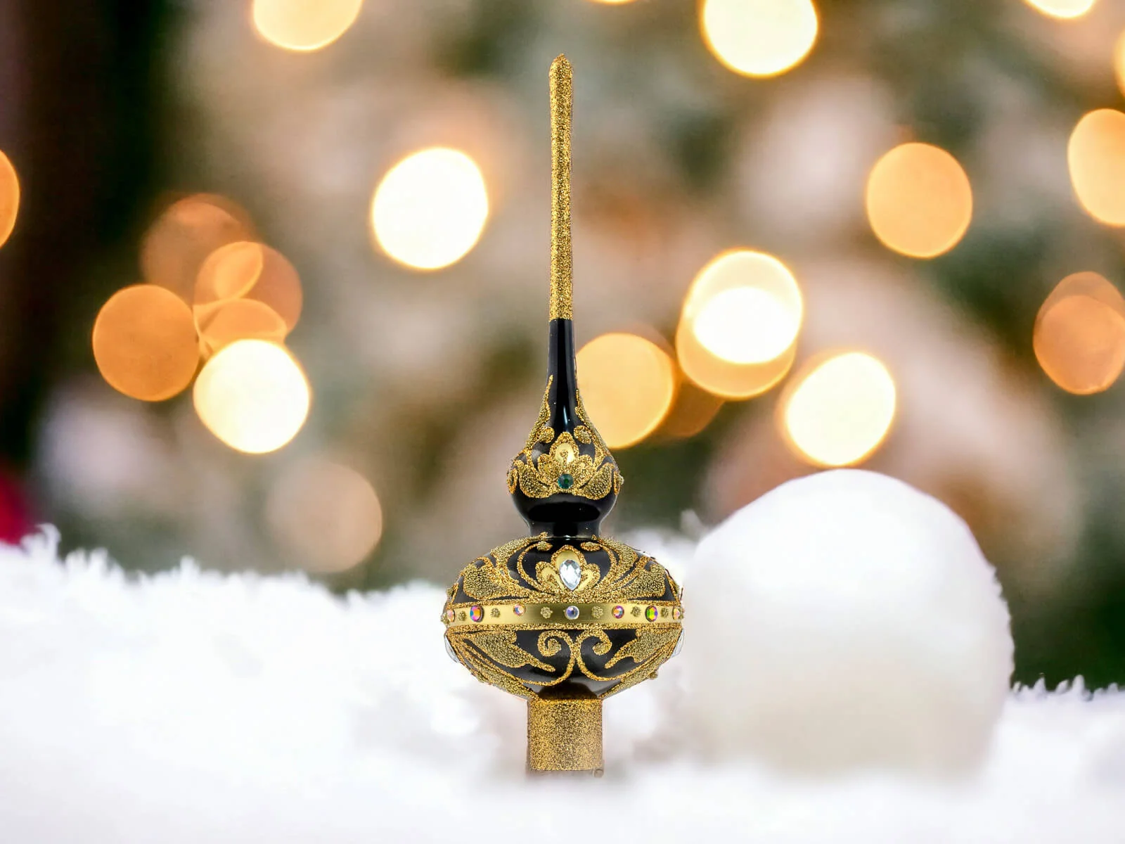 Szklany Szpic Królewski Czarny XL - Elegancja w Czerni to połączenie ponadczasowej klasyki i nowoczesnej elegancji. Ten majestatyczny dodatek do świątecznego wystroju, łączy w sobie elegancję, ręczną pracę oraz precyzyjne zdobienia. Osiągając wysokość 30 cm, stanowi on wyjątkowy punkt centralny każdego świątecznego wnętrza.